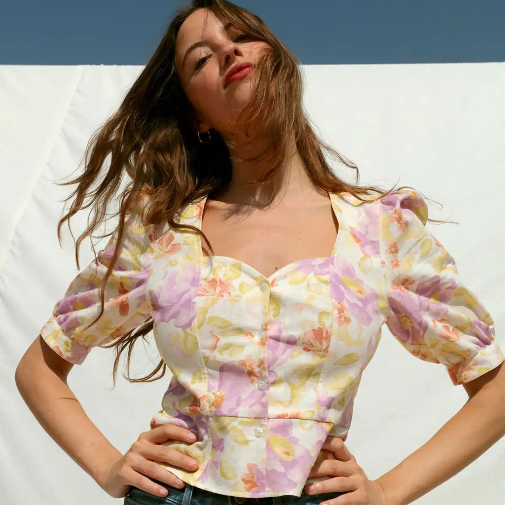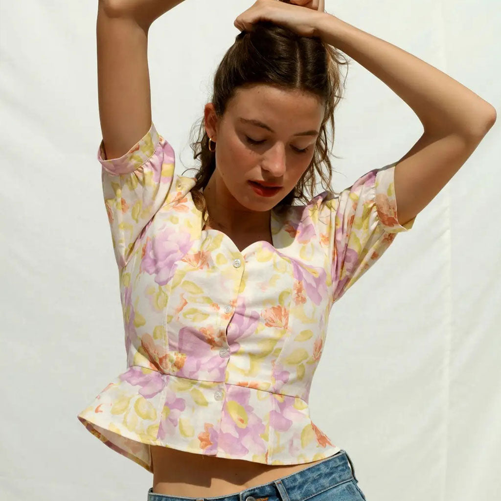 Floral Print Sweetheart Neck Puff Sleeve Linen Peplum Blouse - YelLow