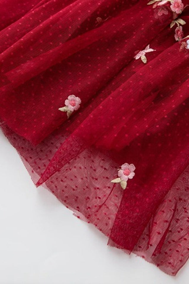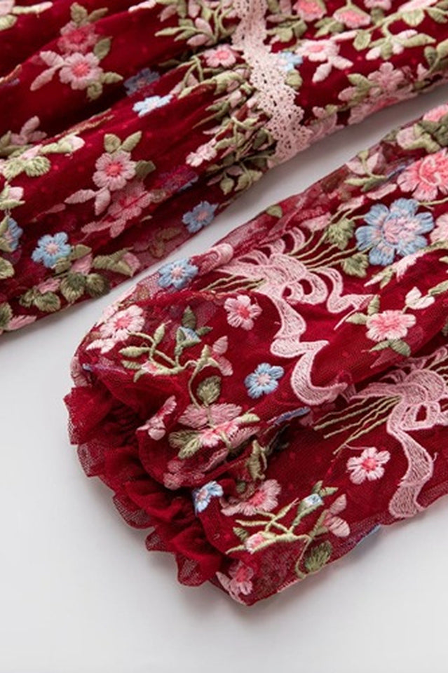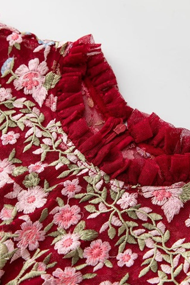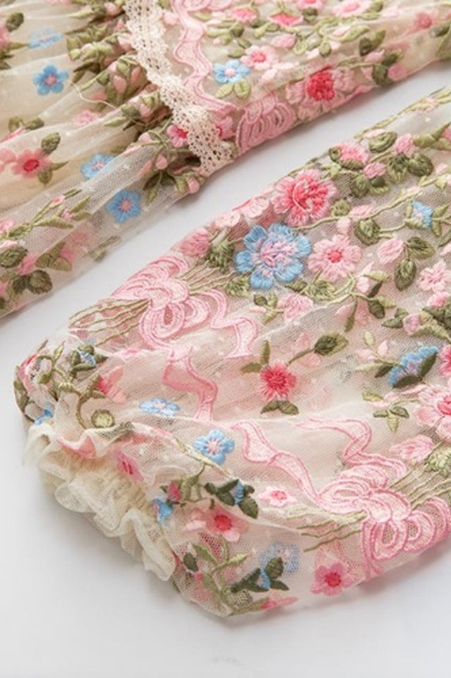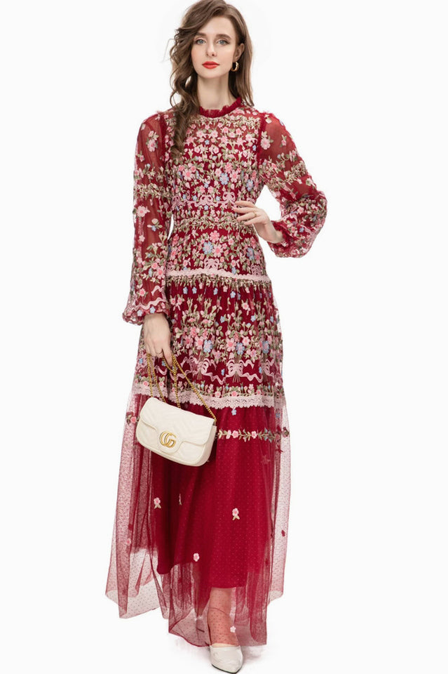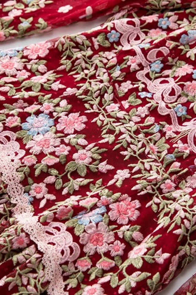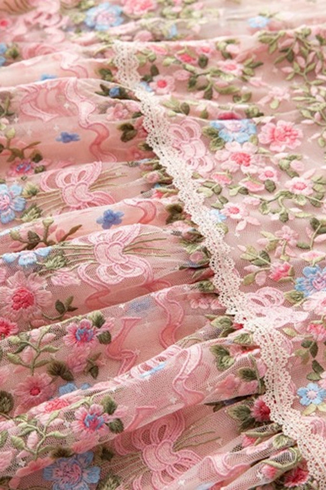 This gown is intricately designed with embroidered bouquets of flowers in rich tones, inspired by a 1930s vintage print. Beautifully adorned with delicate lace trims for signature Needle & Thread detailing. The skirt is developed with layers of tulle to create a romantic silhouette. The perfect gown for an upcoming occasion.