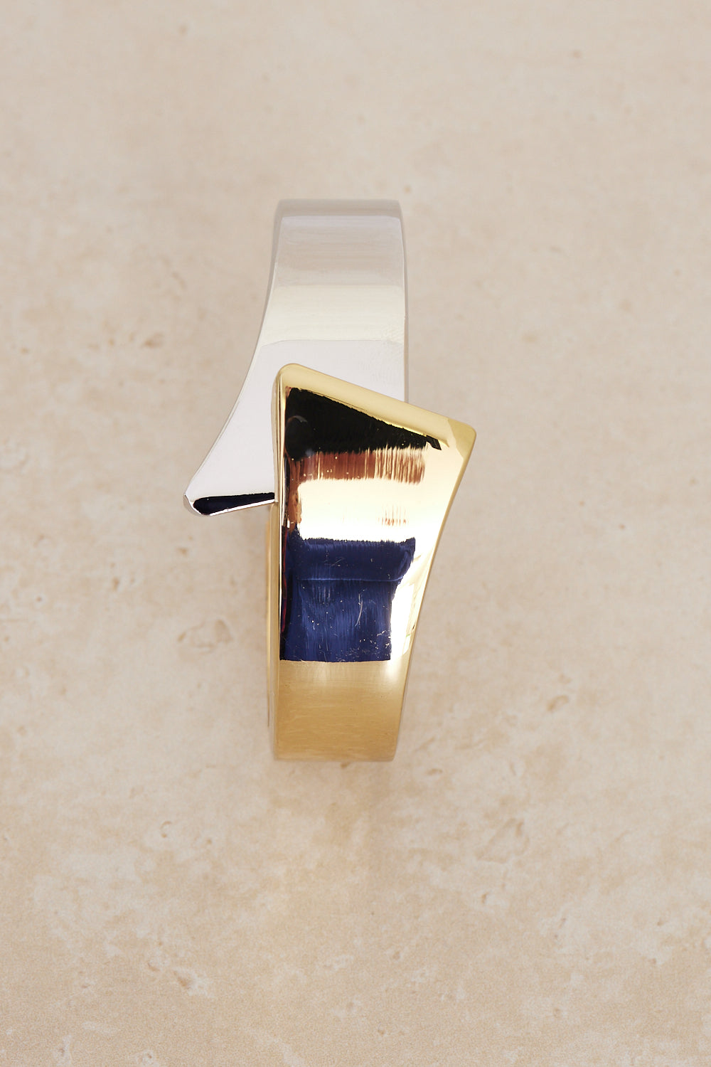 Elevate your style with this striking two-tone cuff bangle, featuring a unique geometric design. The gold-tone and silver-tone finish add a bold contrast, making it the perfect statement piece for any occasion. Easy to wear with a hinge closure, this fashion-forward accessory complements both casual and formal looks.