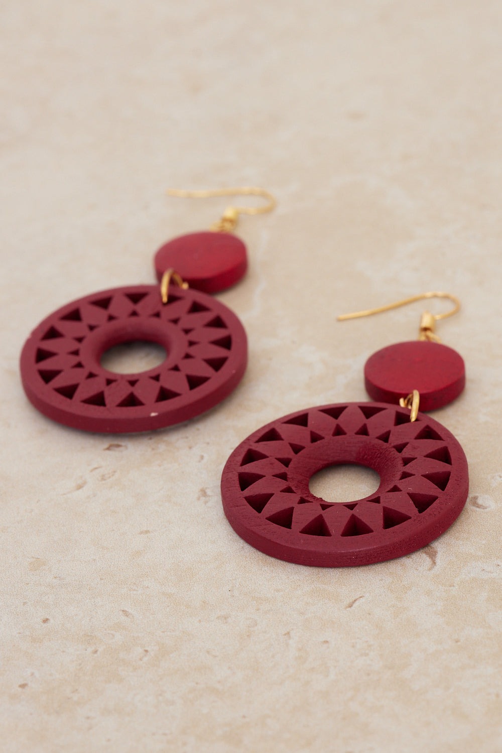 Stand out with the Geometric Sunburst Earrings in red. These eye-catching earrings feature a bold, circular sunburst design with intricate geometric cutouts, perfect for adding a unique and artistic touch to any outfit. Ideal for both casual and formal occasions, their lightweight construction ensures comfort throughout the day. Enhance your style with these chic and contemporary earrings.
