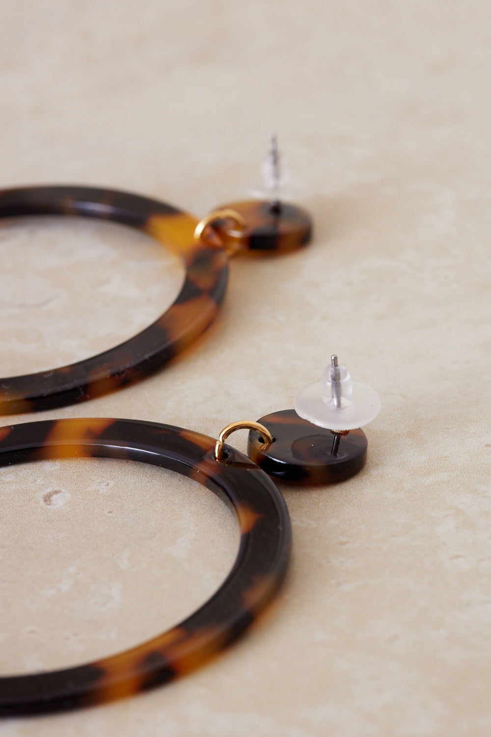 These earrings feature a classic tortoiseshell pattern in a lightweight resin material. The design consists of a small round stud connected to a large open circular hoop, creating a bold yet elegant statement piece. The warm brown and black tones of the tortoiseshell pattern add a touch of vintage-inspired charm, making these earrings versatile enough to pair with both casual and dressy outfits.