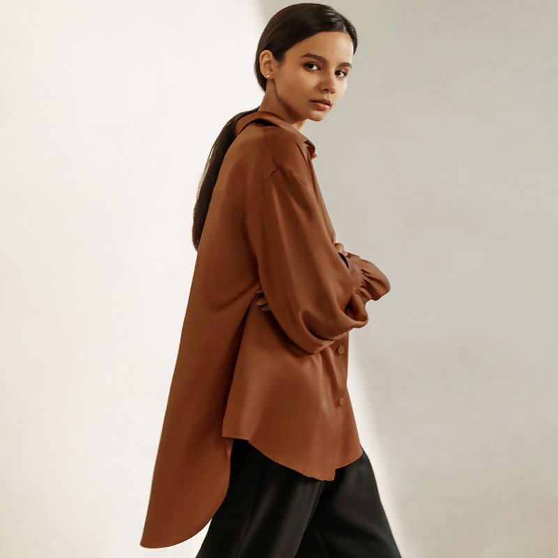 Glossy Satin Button Up Drop Shoulder Bishop Sleeve Pointed Collar Shirt - Brown