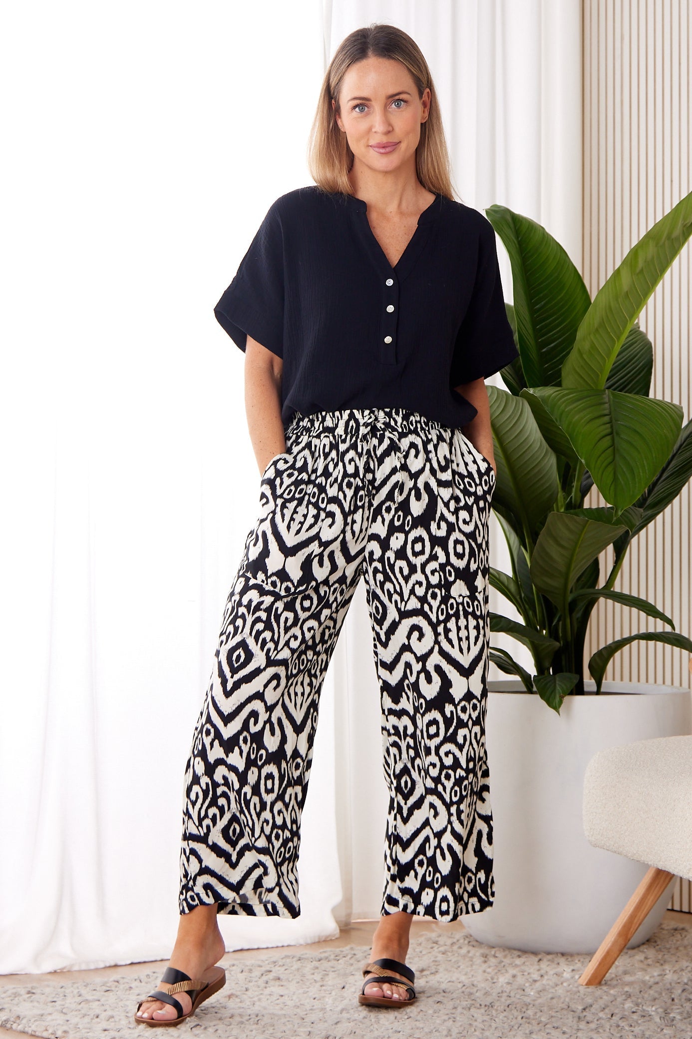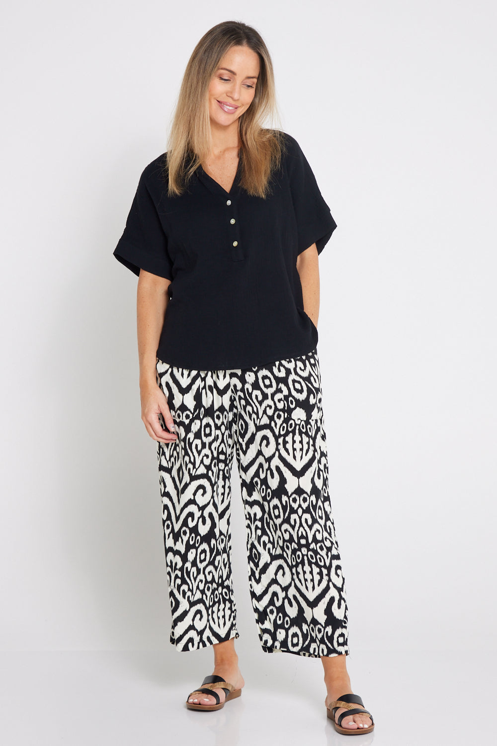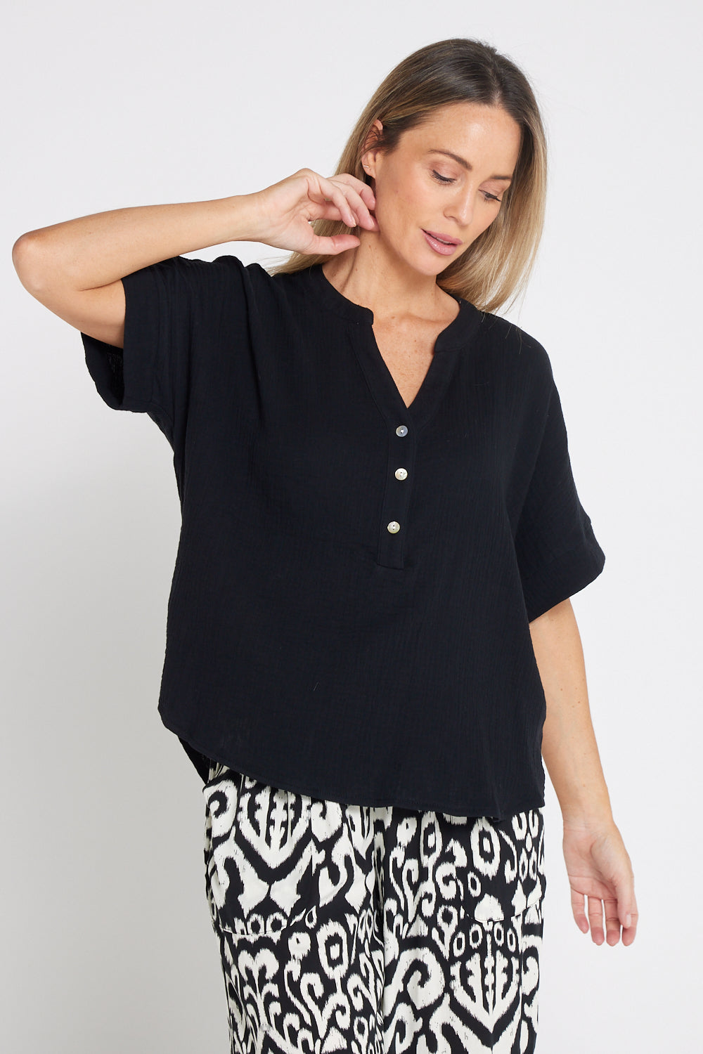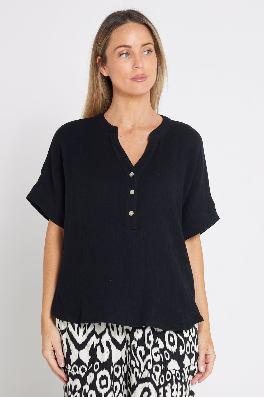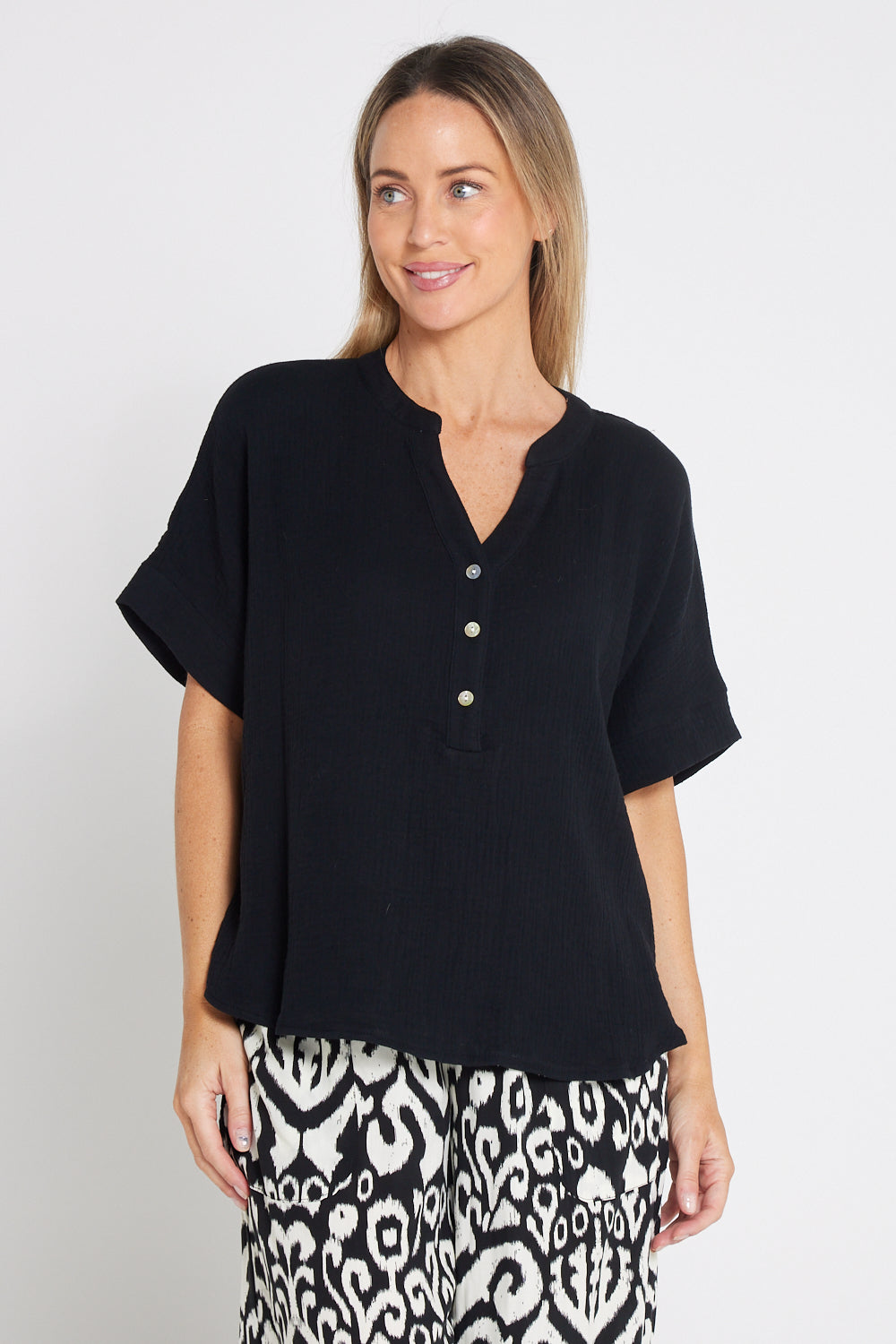 The Gracie Cotton Muslin Top in Black is a versatile wardrobe staple made from 100% cotton. It features an open grandad collar with a small V-neck, button details over the bust, and extended short sleeves for a relaxed fit. The muslin weave and curved hemline offer a lightweight, breathable feel, perfect for warm days.