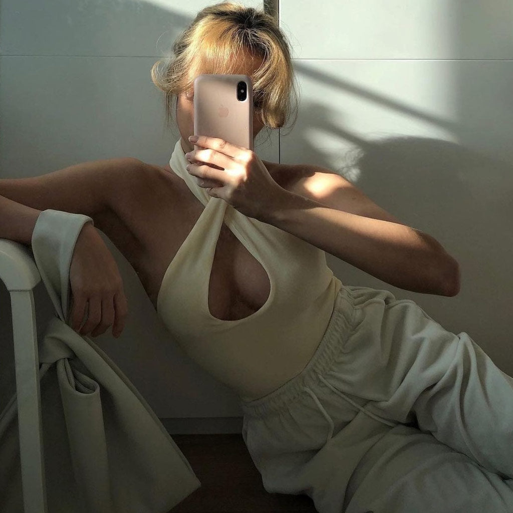 Halter Neck Cross Front Crop Tank Top - Beige