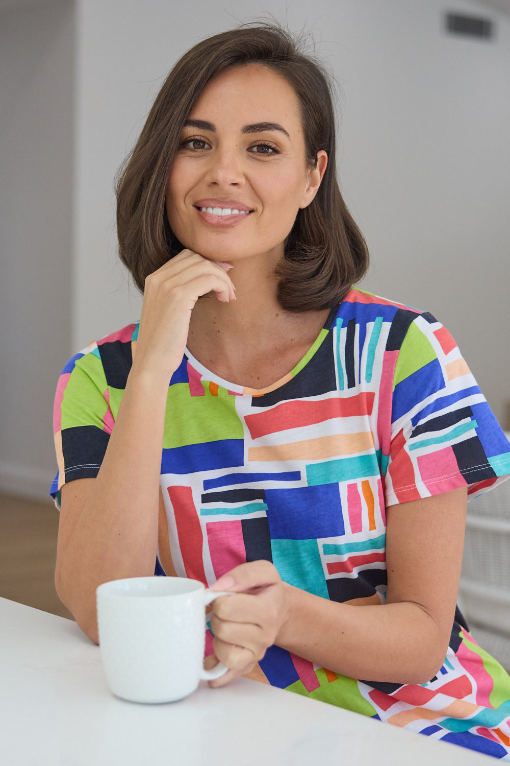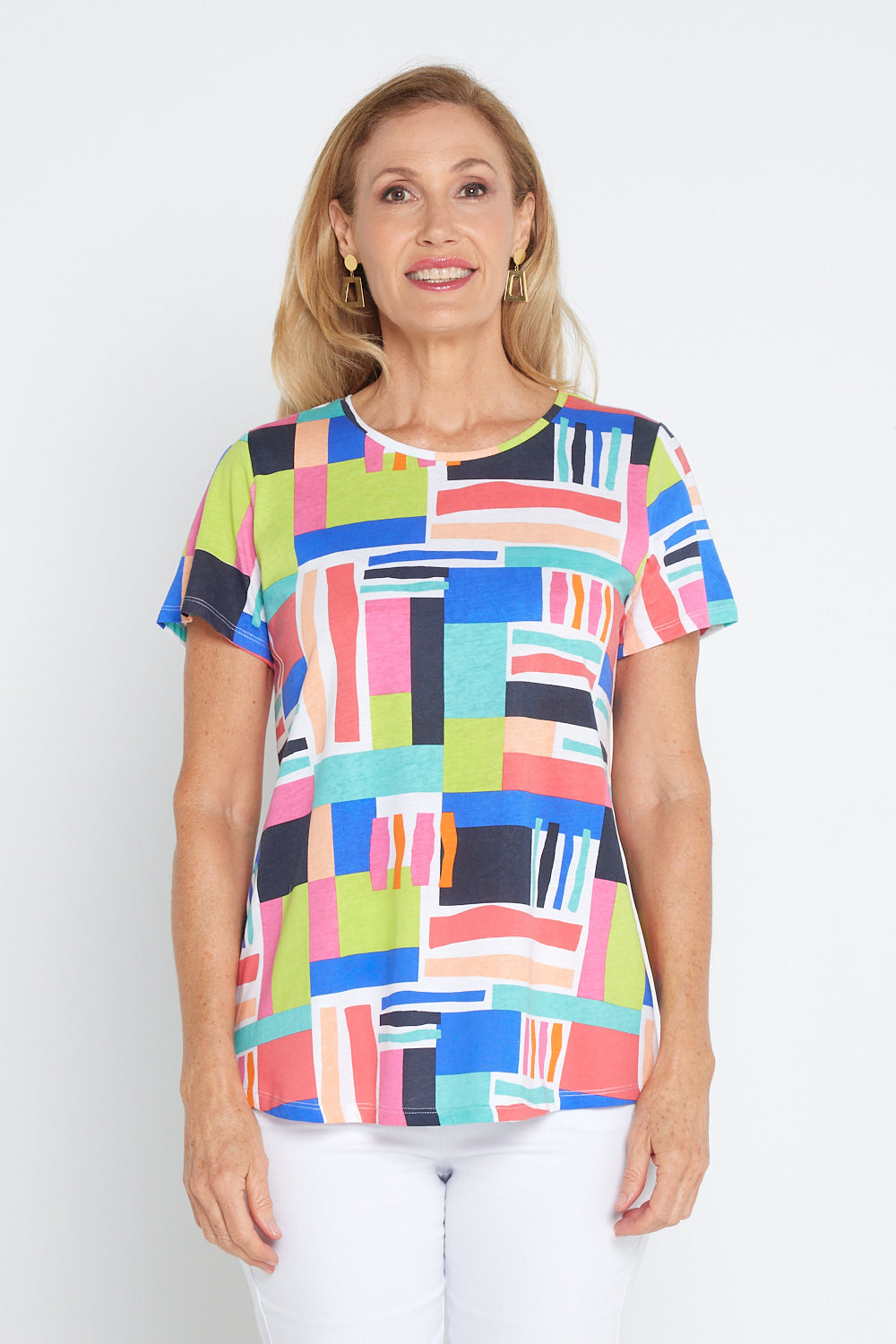 The "Here Comes Summer Tee" in Building Blocks is a vibrant and lively addition to your warm-weather wardrobe. Featuring a playful and colourful geometric print, this tee brings a burst of energy to any outfit. Made from a soft and breathable fabric, it ensures comfort throughout the day, whether you're out and about or relaxing at home.