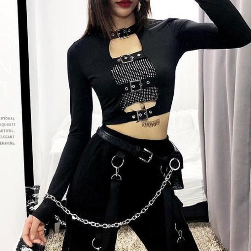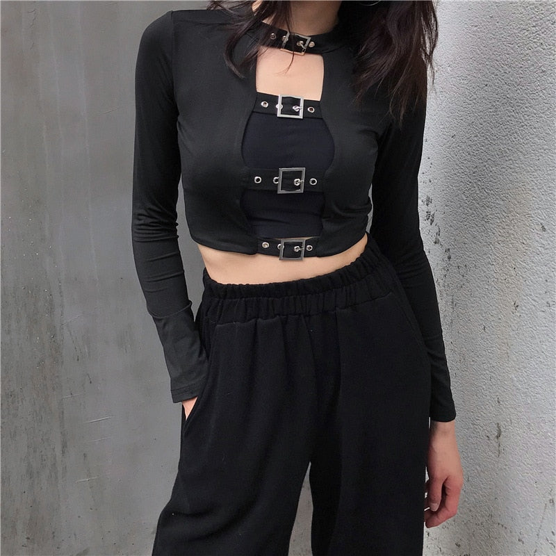 Long Sleeve O-Neck Collar Cropped T-Shirt with Hollow Out Decoration and Cotton Polyester Material