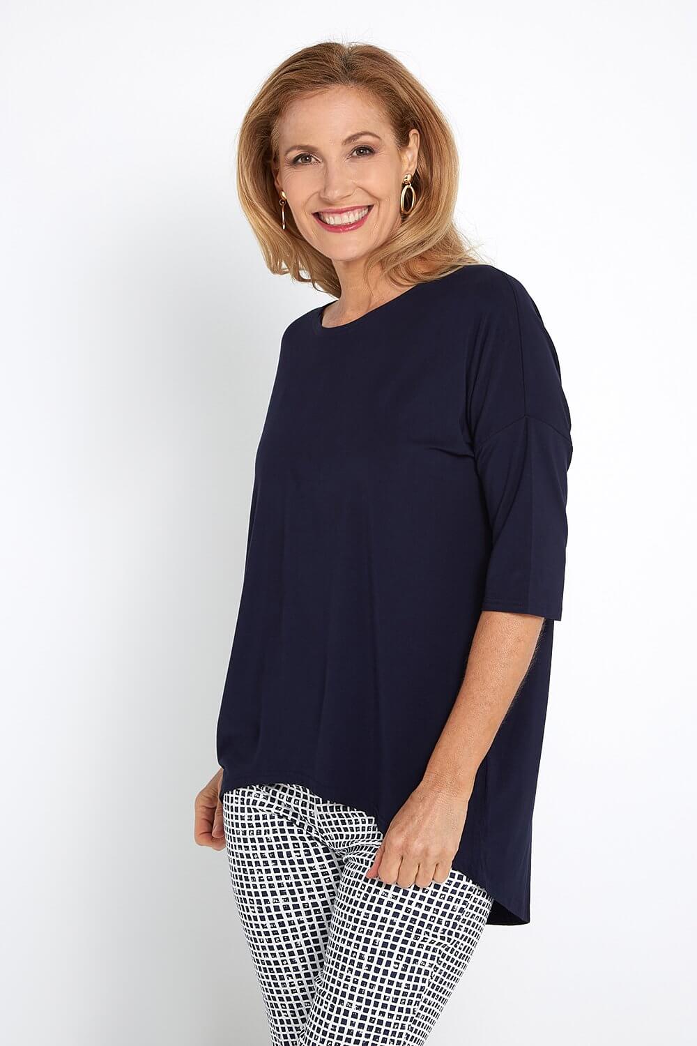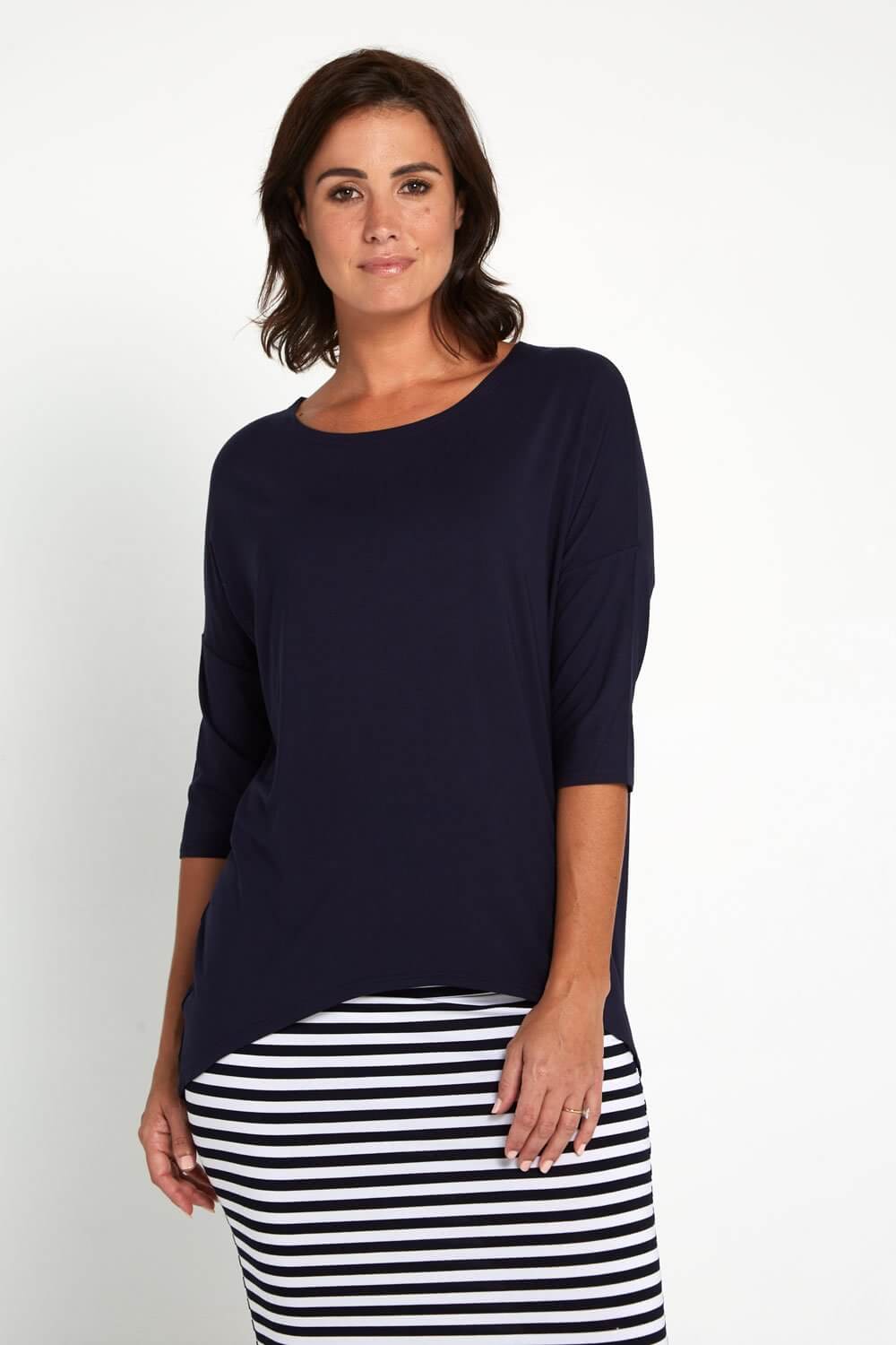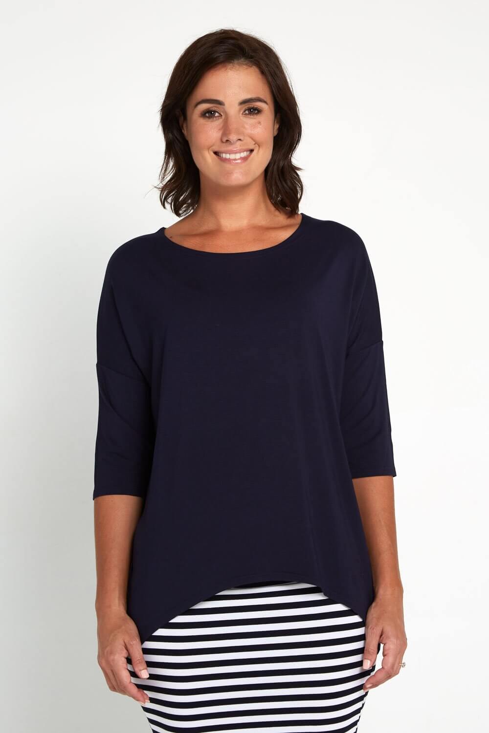 The super soft Irena Bamboo Top is now available in classic navy. Such a chic style to add to your collection. Crafted with a scoop neck, 3/4 dolman sleeves, a generous fit and a hi-low cut for added coverage at the back. The stretch bamboo jersey is incredibly so soft. Bamboo is also super breathable, antibacterial, anti-odour, hypoallergenic, moisture wicking and bamboo provides UV protection. Look stylish and feel fresh and comfortable in this elegant top, a must have wardrobe staple! Navy goes with so many things and never dates.