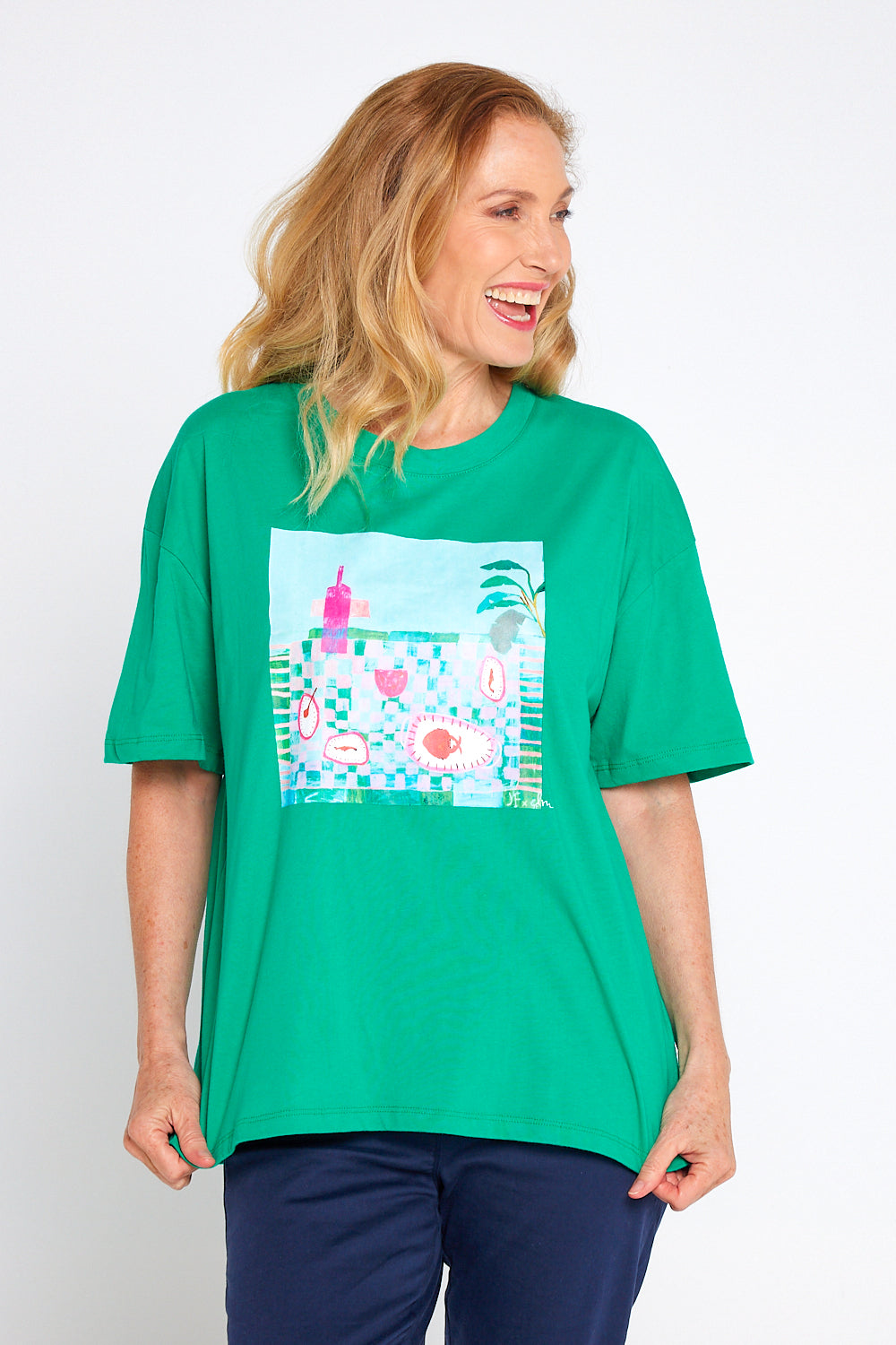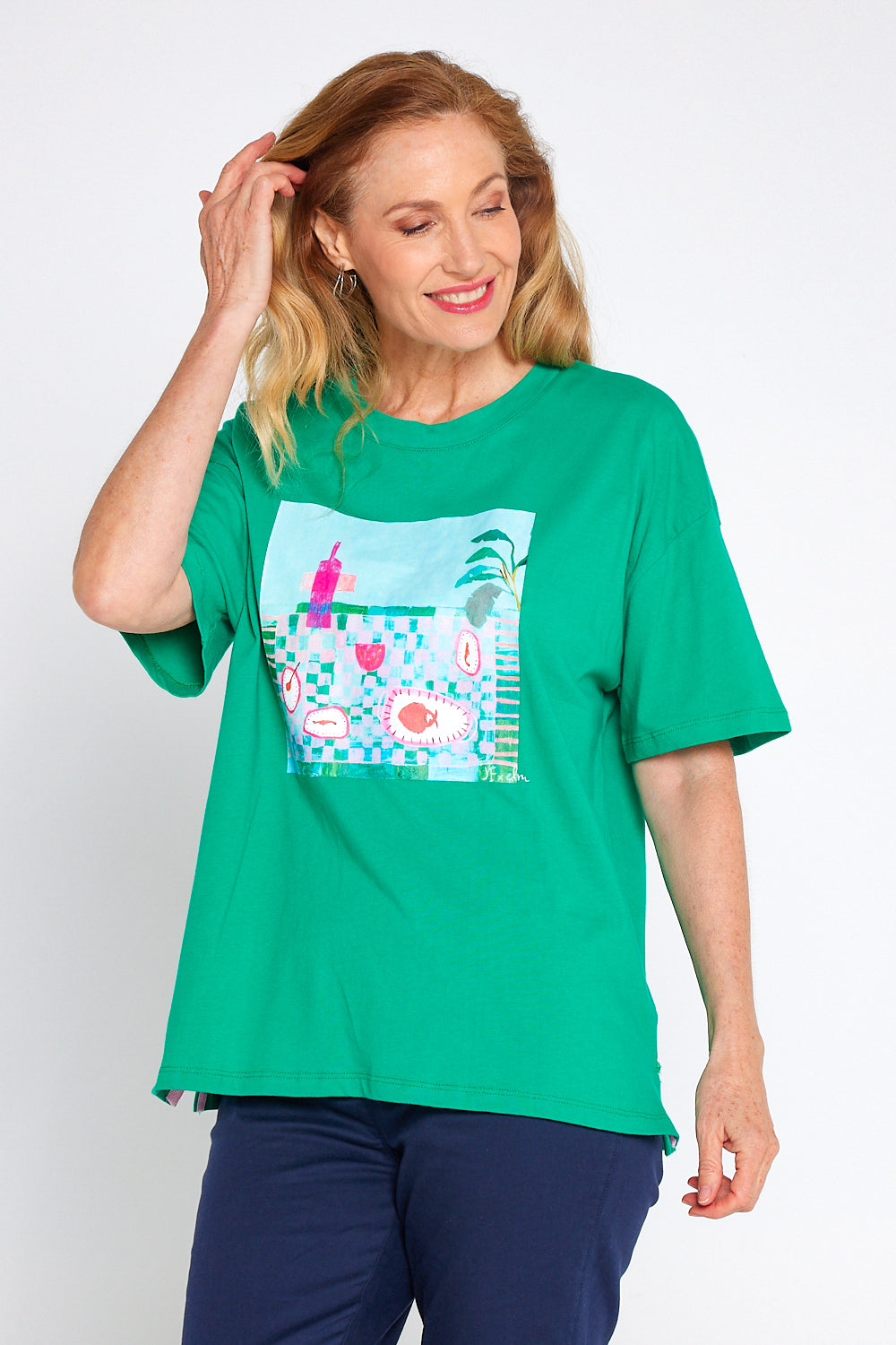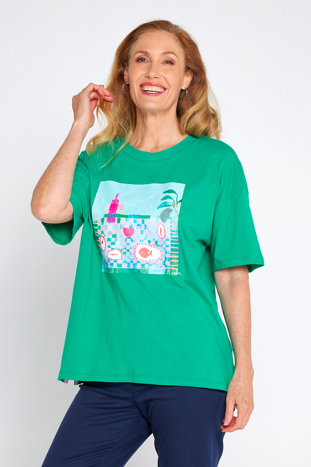 Introducing the Island in the Sun Tee - Goodness Green, a vibrant and artistic addition to your casual wardrobe. This tee features a stunning graphic print on the front, depicting a whimsical island scene with colourful and abstract elements that evoke a sense of tropical bliss. The rich green base of the tee enhances the playful and lively print, making it a standout piece.