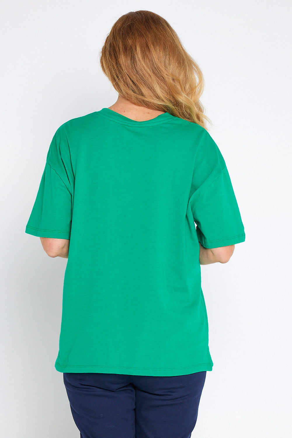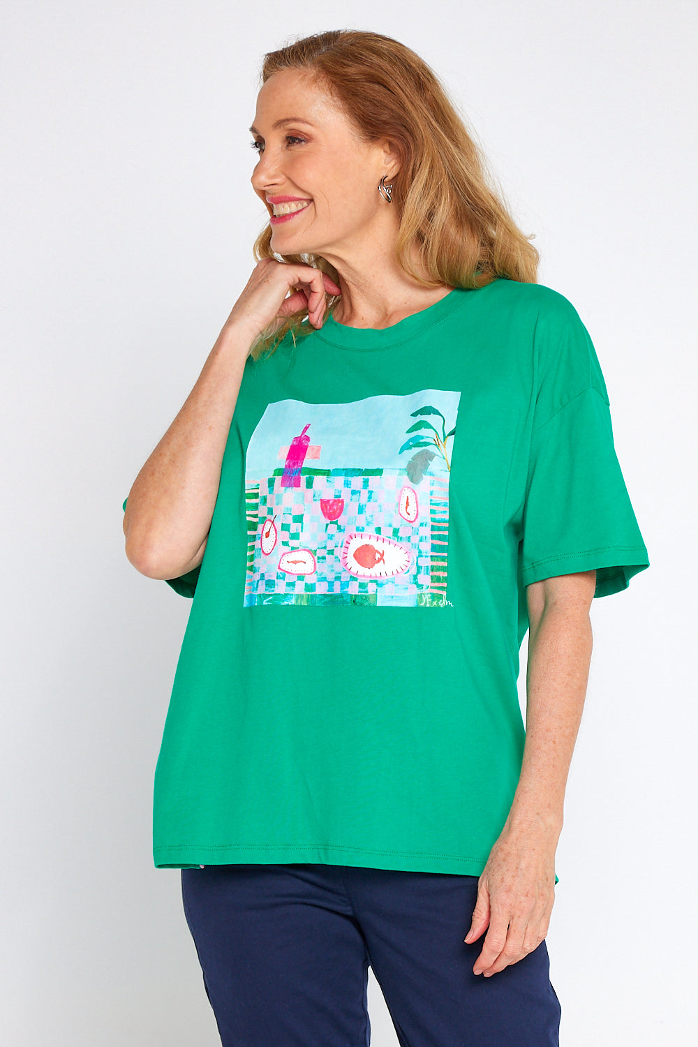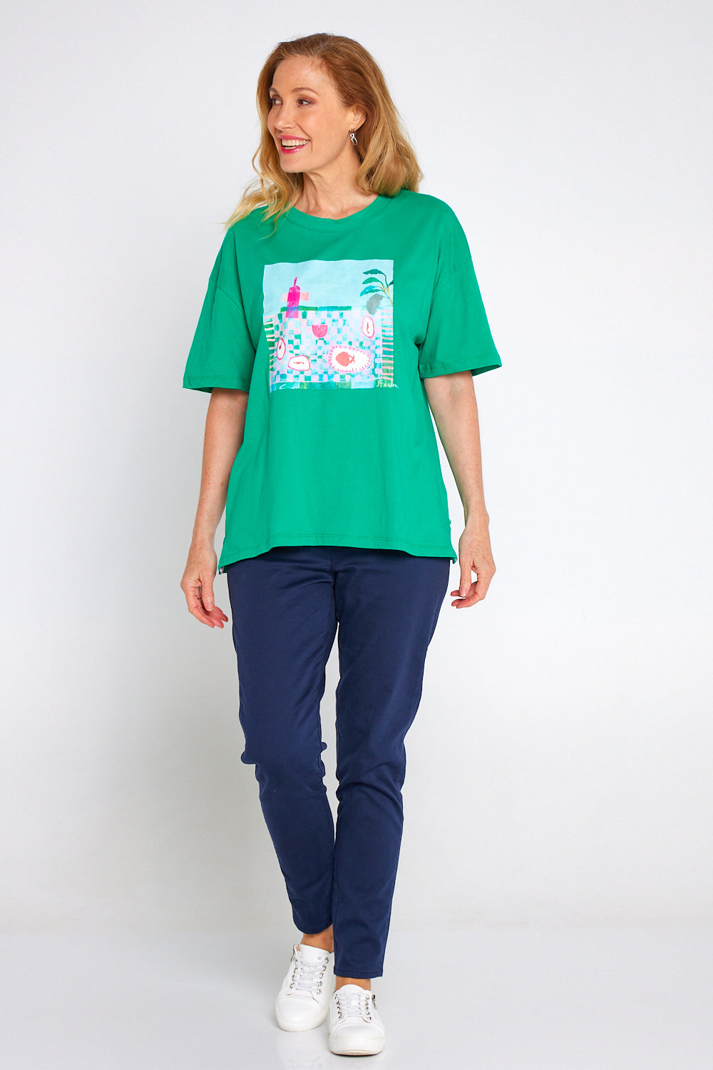 Introducing the Island in the Sun Tee - Goodness Green, a vibrant and artistic addition to your casual wardrobe. This tee features a stunning graphic print on the front, depicting a whimsical island scene with colourful and abstract elements that evoke a sense of tropical bliss. The rich green base of the tee enhances the playful and lively print, making it a standout piece.