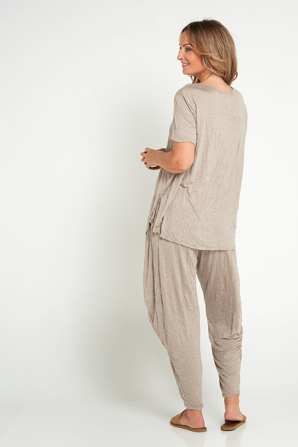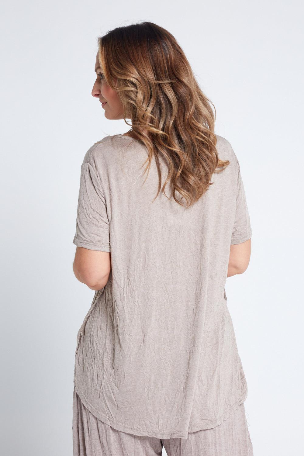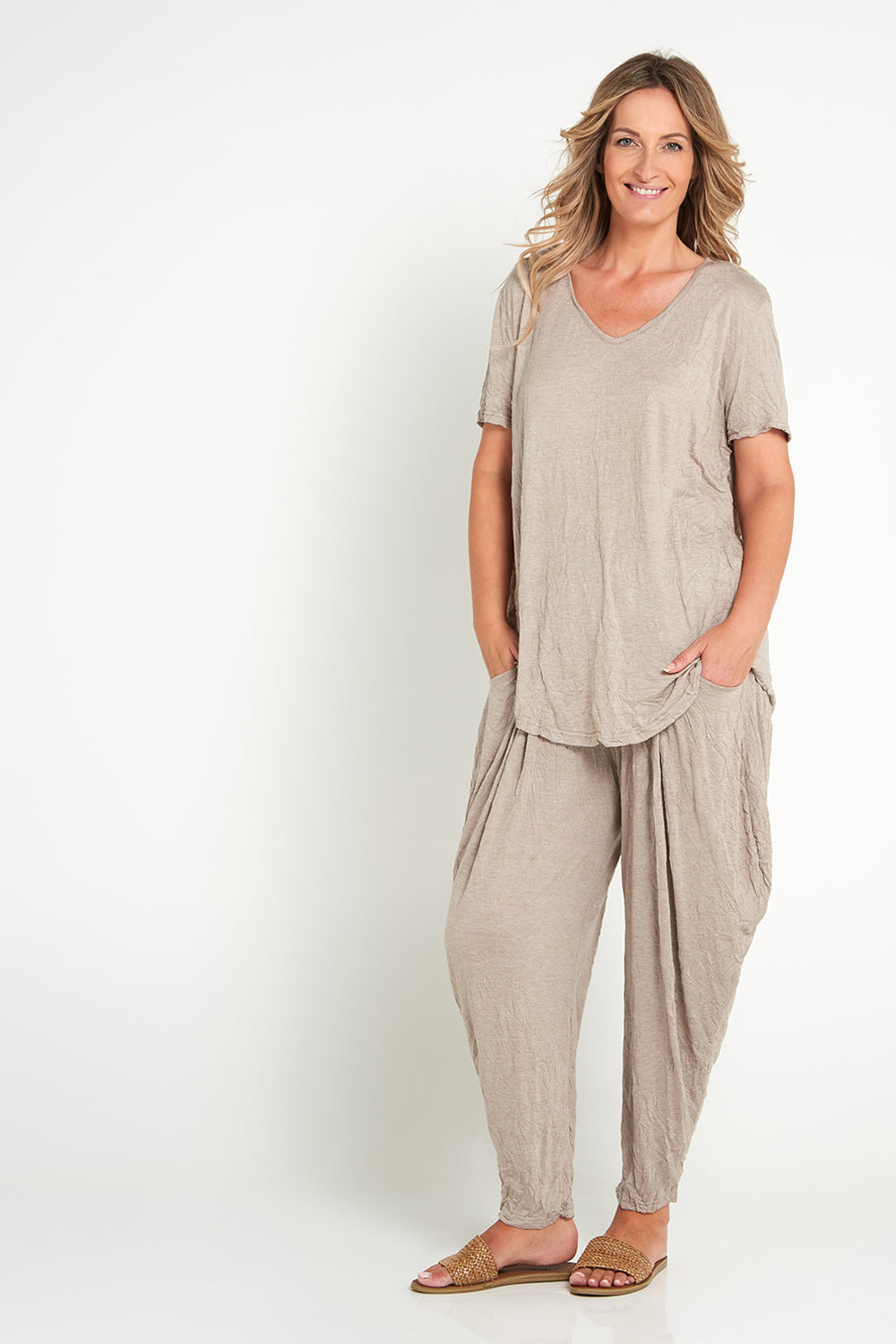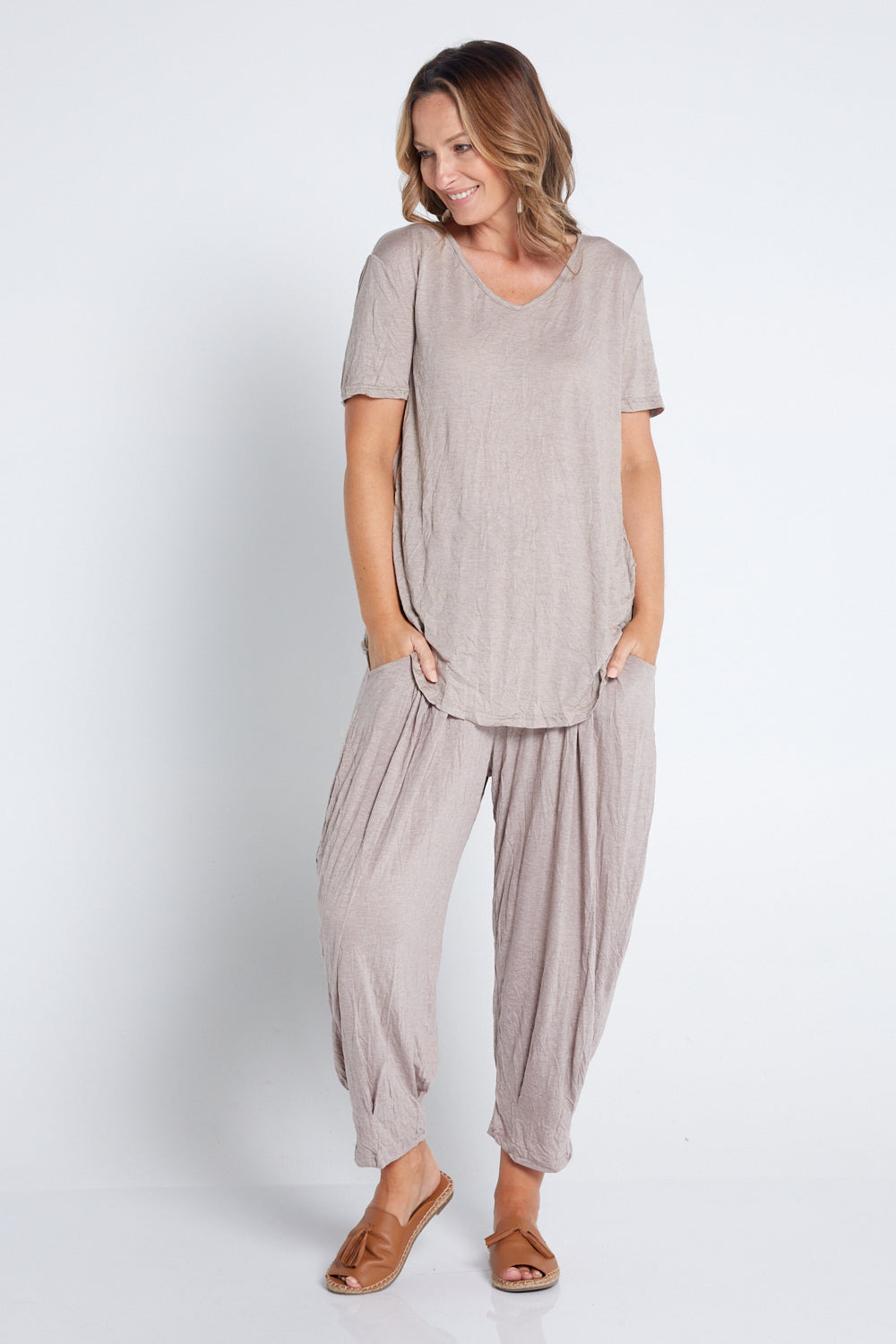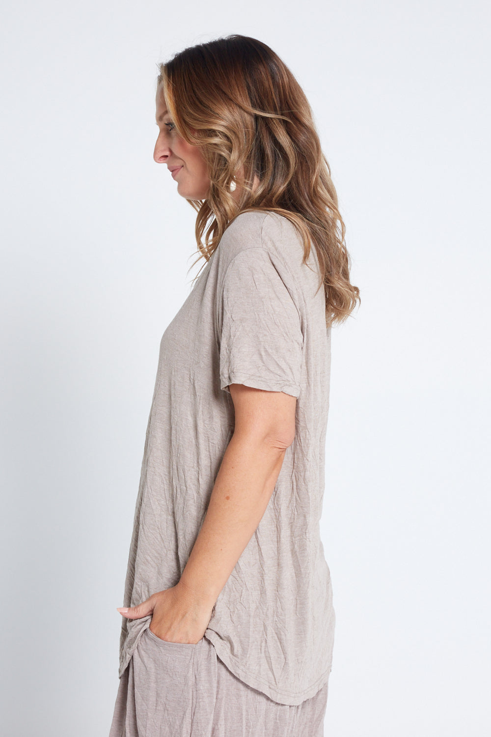 A simple new style from Cotton Village, the Jackie Top is a lovely basic tee. With a v neck, short sleeves and curved hem, the design is easy fitting and comfortable. The stretch cotton jersey is soft and low maintenance, you'll enjoy having this piece on hand for easily styled outfits. Now available in spelt, the perfect beige for easy styling year round that will outlast changing colour trends.
