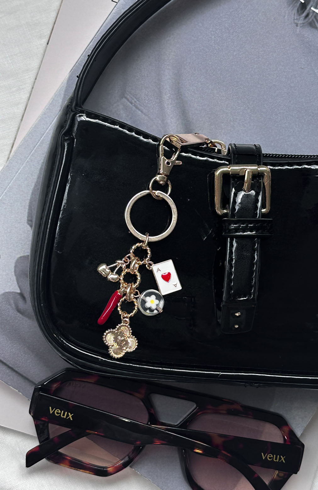 Add some spice to your keys, bag or purse with the Jamie Keychain Gold/Red! Features a gold plated design and fun charms- we are obsessed.