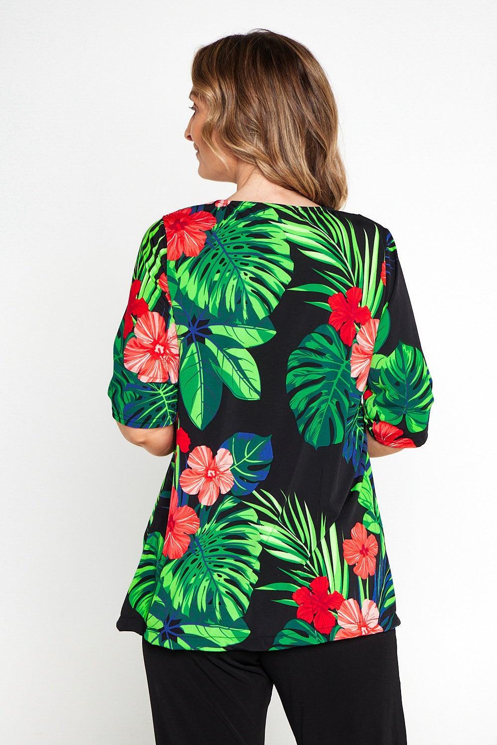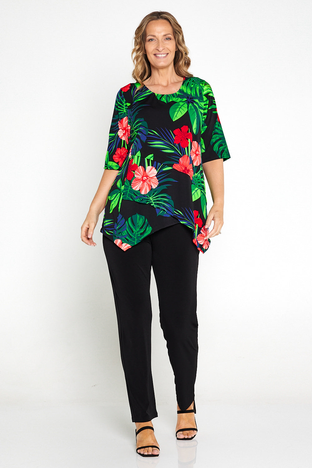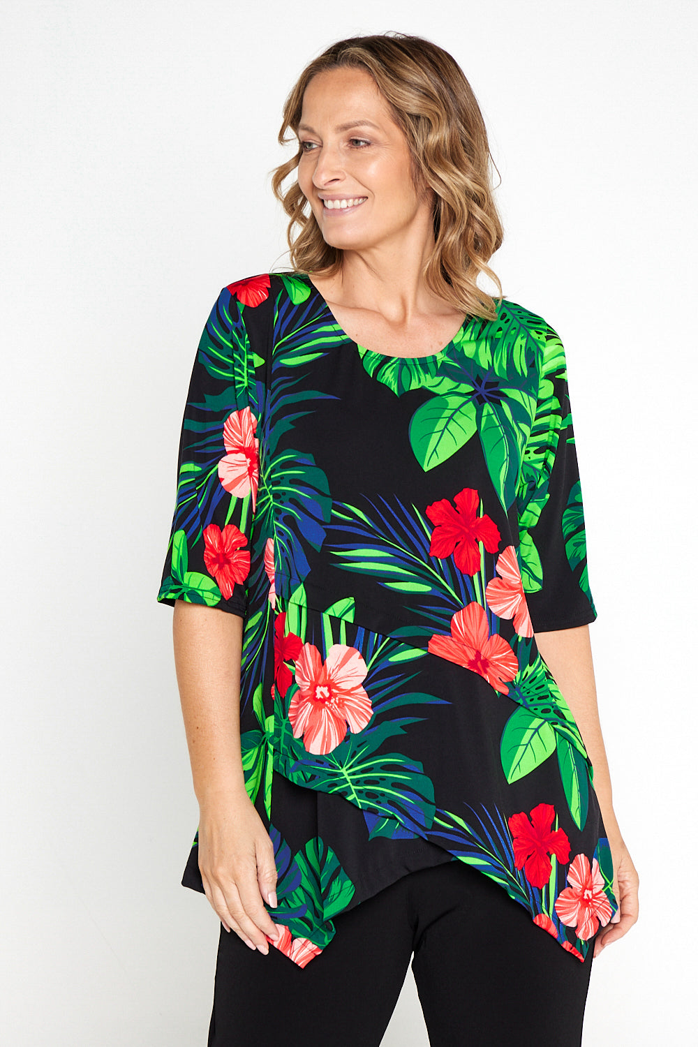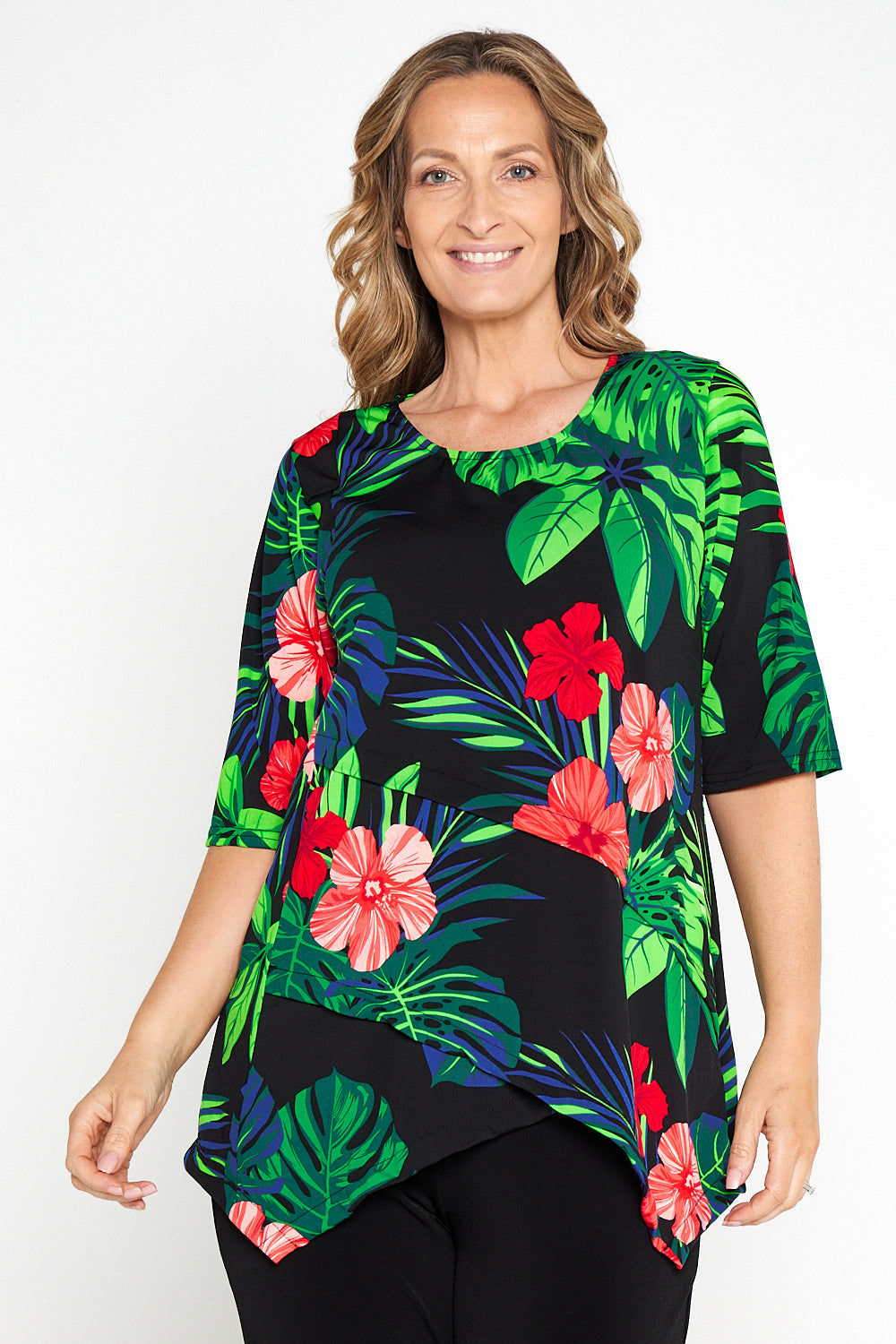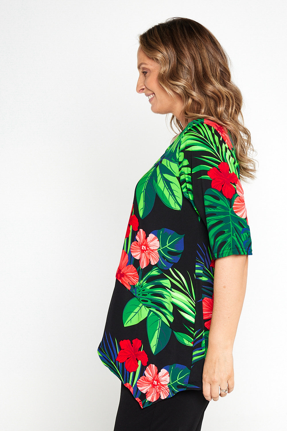 Sporting a stunning print that instantly catches the eye. The tropical pattern features vivid red hibiscus flowers, with lush green foliage and royal blue accents, all emphasised by the black backdrop