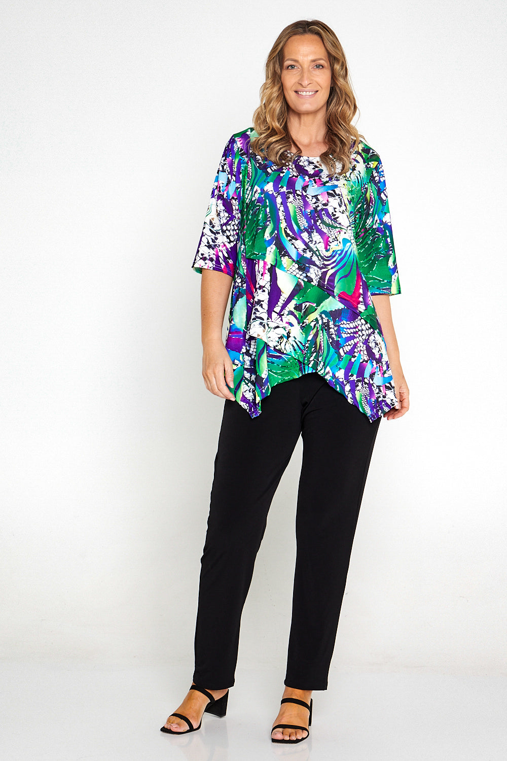 The Judith top is smart, yet easy care with wrinkle resistant stretch jersey. The clever cut manages to be both sharp and sleek while also easy fitting.