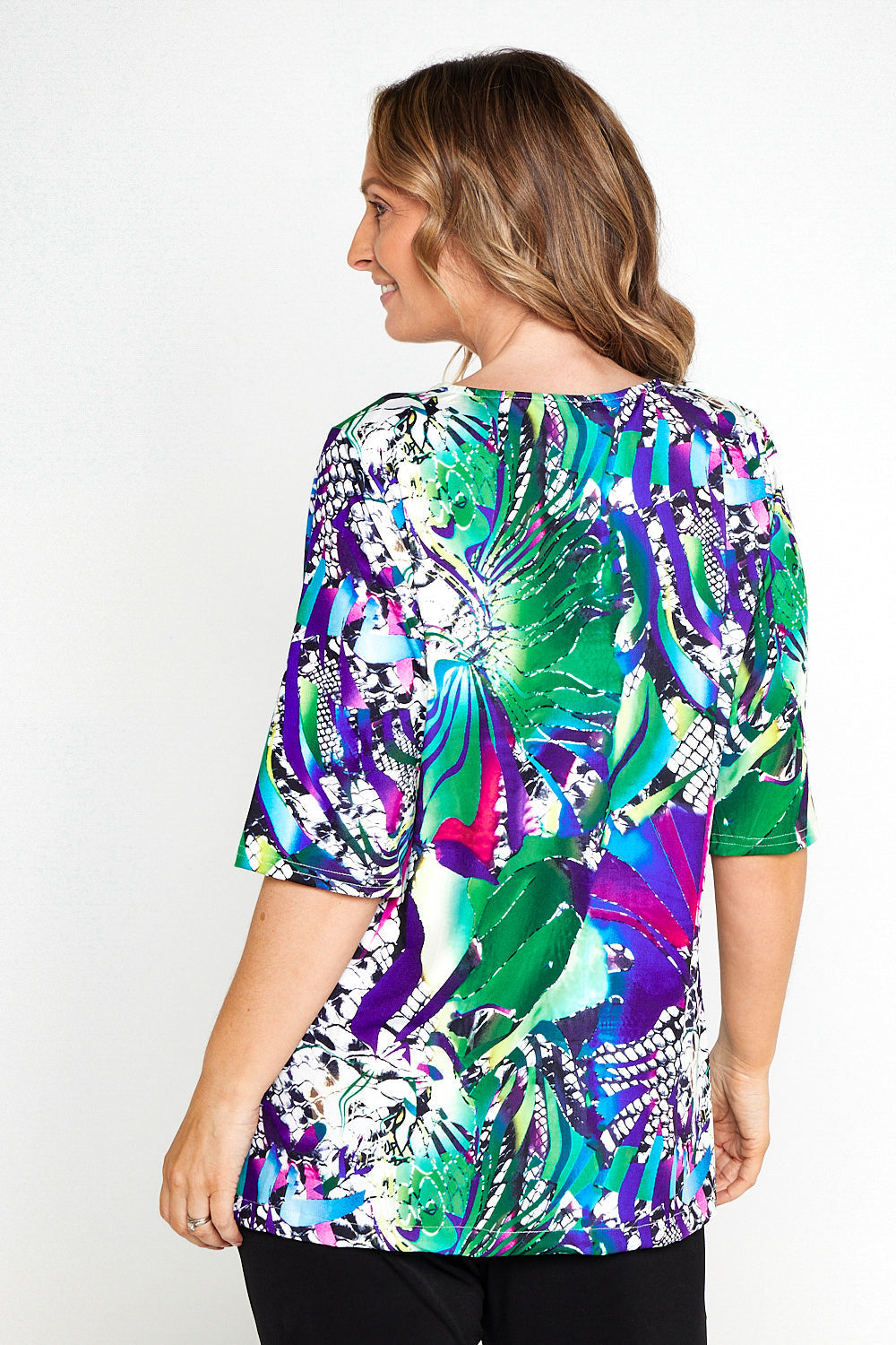 This gorgeous print combines jewel tones of the vivid greens and purples create an opulent look, with an exotic touch added with the hints of animal print.