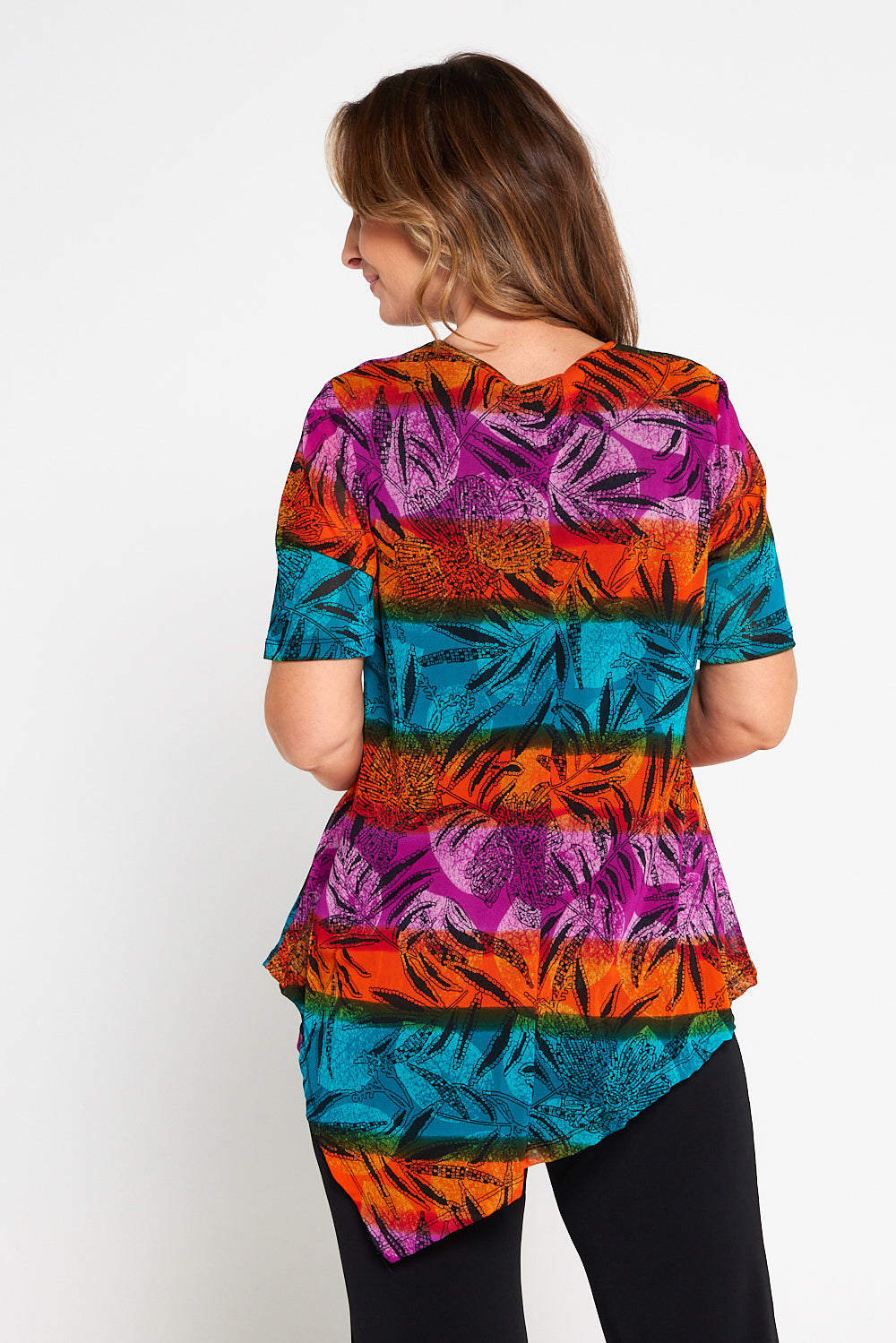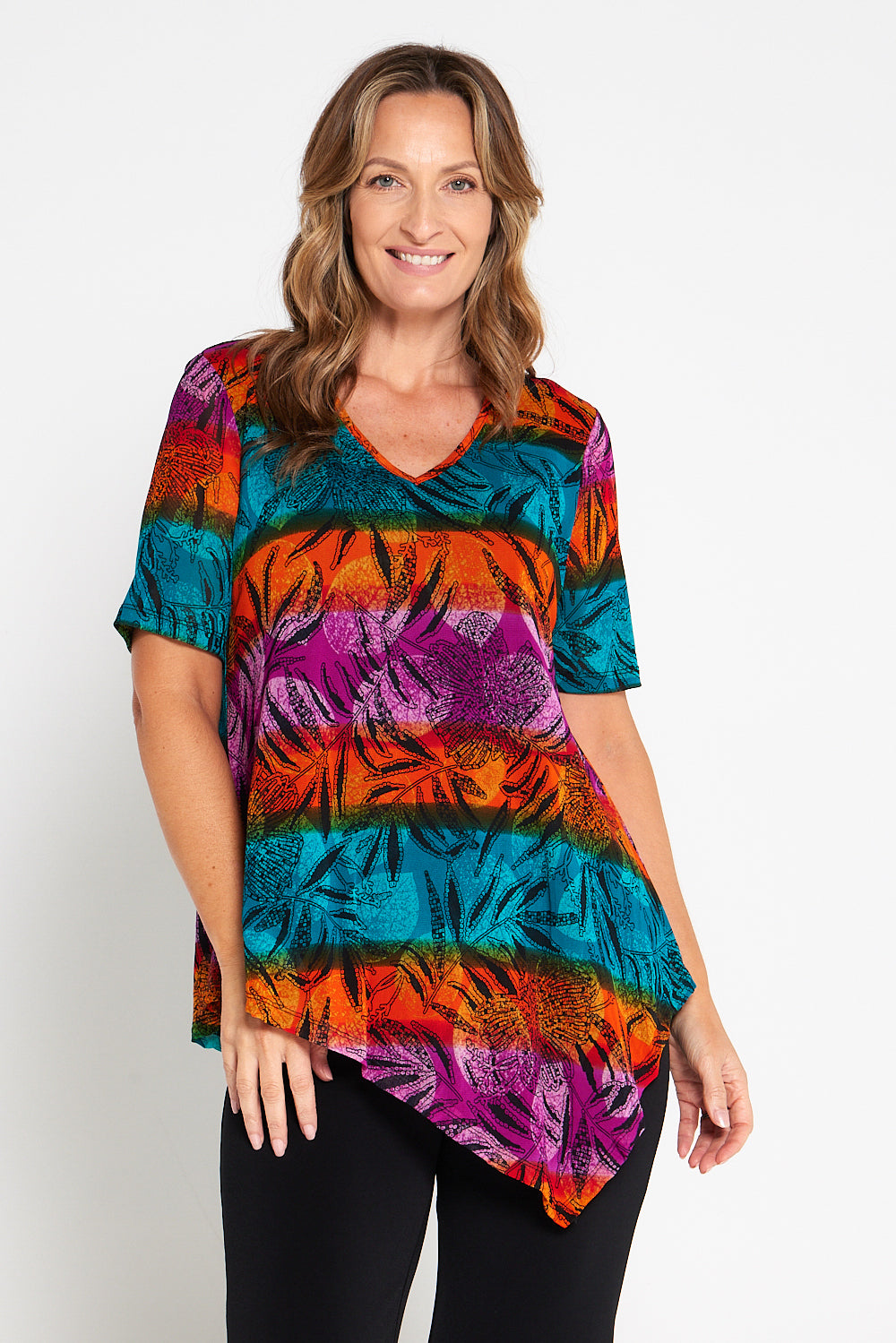 The Jupiter Top is now available in our stunning Bold Botanical print. Combining vivid shades of orange, teal and magenta with detailed botanicals in black, it will completely transform even the most basic outfits.  Stand out from the crowd with its asymmetrical hemline and make a statement in comfort with the mesh outer layer and stretchy jersey lining.