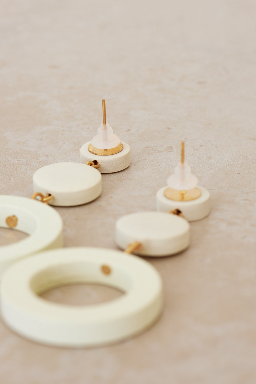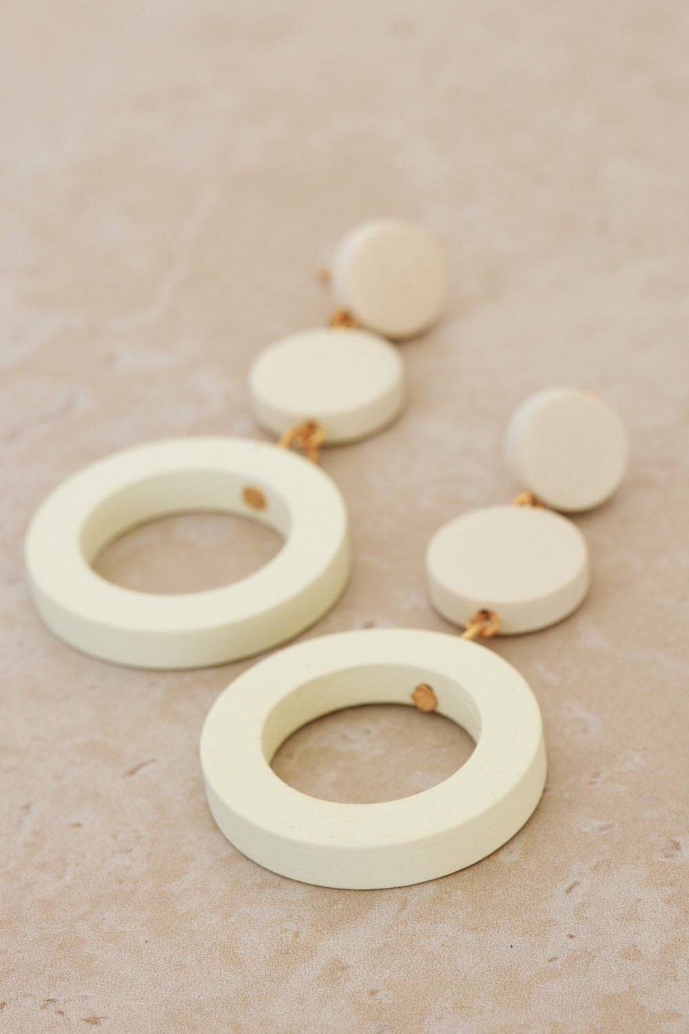These Kendra Statement Earrings in ivory are a chic addition to any jewellery collection. Crafted with a modern triple-circle drop design, these earrings feature gold-tone hardware for a touch of elegance. The lightweight construction ensures comfortable wear, while the secure post back keeps them in place all day. Perfect for adding a sophisticated touch to your outfit, these earrings are versatile enough for both casual and formal occasions. Make a statement with these stylish and contemporary earrings.