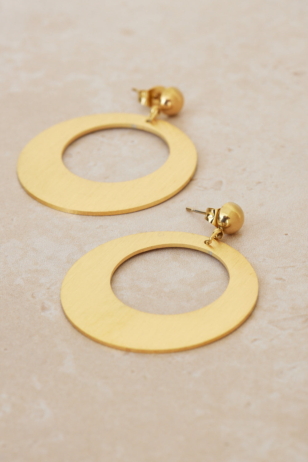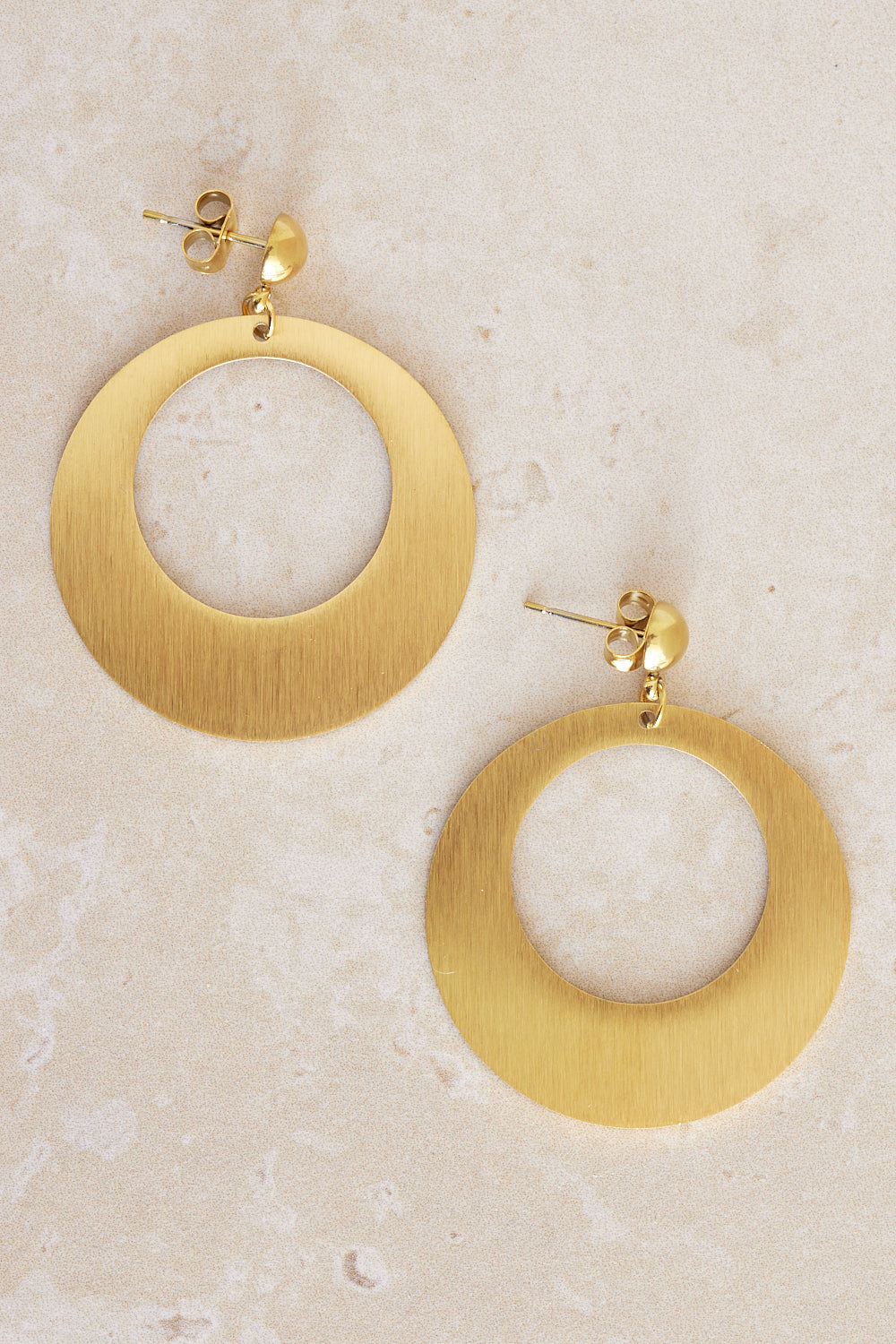 Elevate your look with these stunning gold-tone earrings, perfect for adding a touch of glamour to any outfit. These earrings feature a sleek, circular design with a cut-out centre, giving them a modern and elegant appeal. The brushed gold finish provides a sophisticated matte look, while the secure post backs ensure comfortable wear. Ideal for both casual and formal occasions, these lightweight earrings are a versatile addition to any jewellery collection.