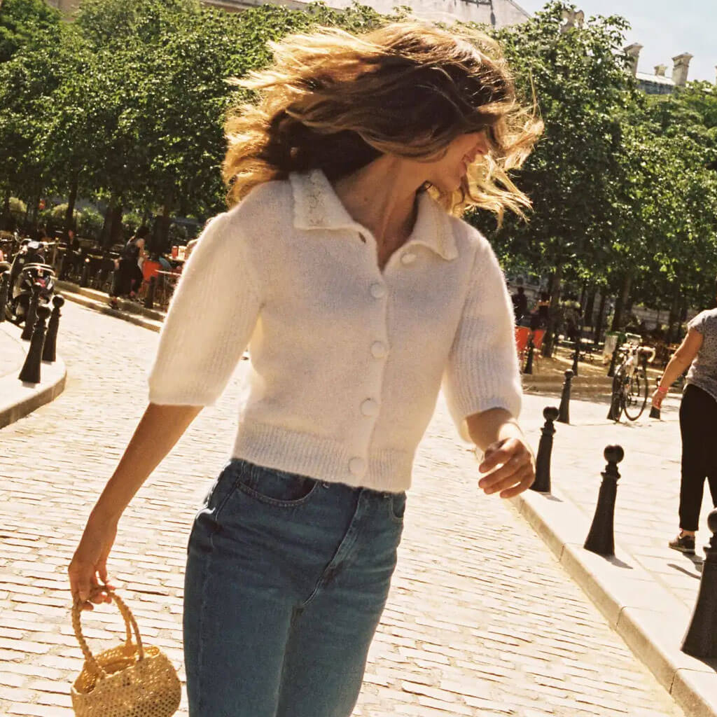 There's nothing prettier than this fuzzy sweater to cozy up in the fall. The fluffy mohair-blend fabric is popular for its versatility and feminine balance. We adore the pretty collar that's trimmed with white lace accent and the rounded button closure adds a cute finishing touch. The slightly puffed sleeve comes with a voluminous silhouette showcasing a sense of coziness and a romantic impression. It gives you the right length to the waist which is perfect to match with a variety of bottoms. For a fresh laid-back touch. add straight-leg jeans and heeled mules.