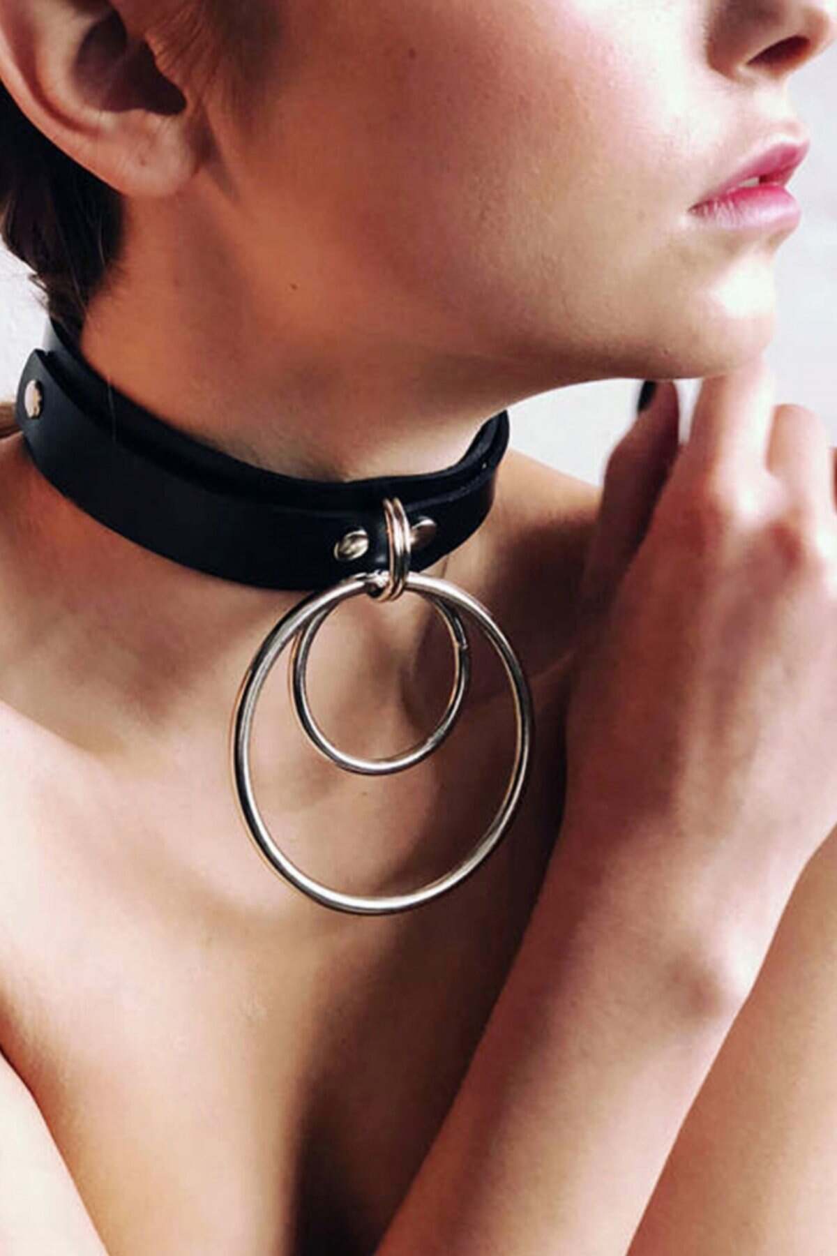 Large and Small Ring Detailed Adjustable Stylish Leather Choker
