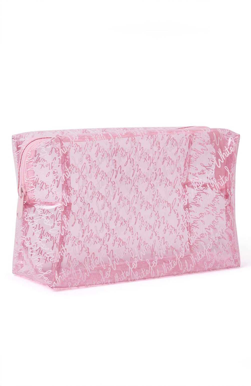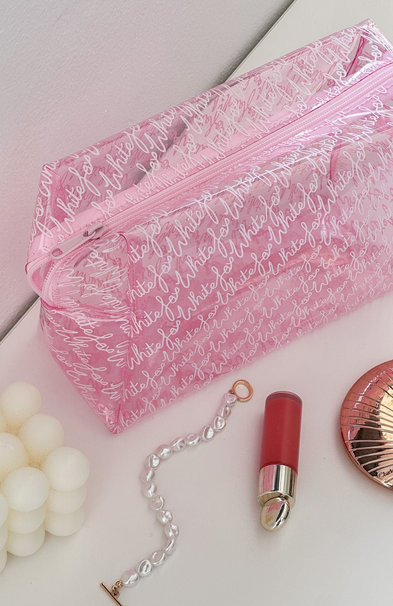 We are obsessing over the Late Notice Cosmetic Case Baby Pink! Featuring a zipper closure, clear PVC case, printed heart detailing and plated WF logo top front. An essential for your everyday.
