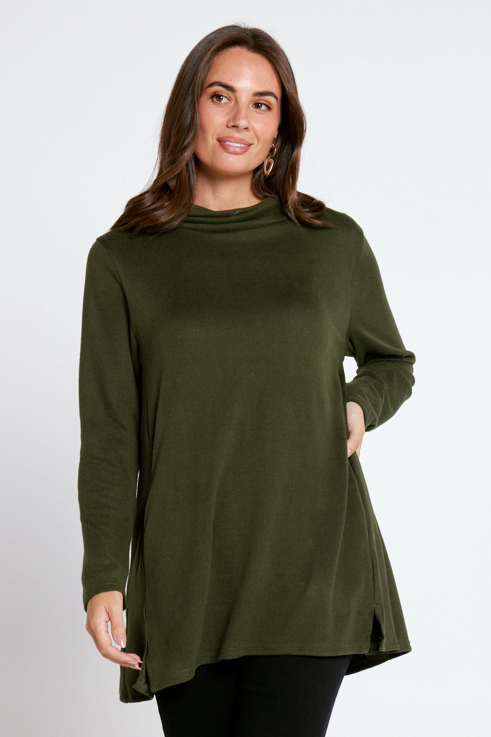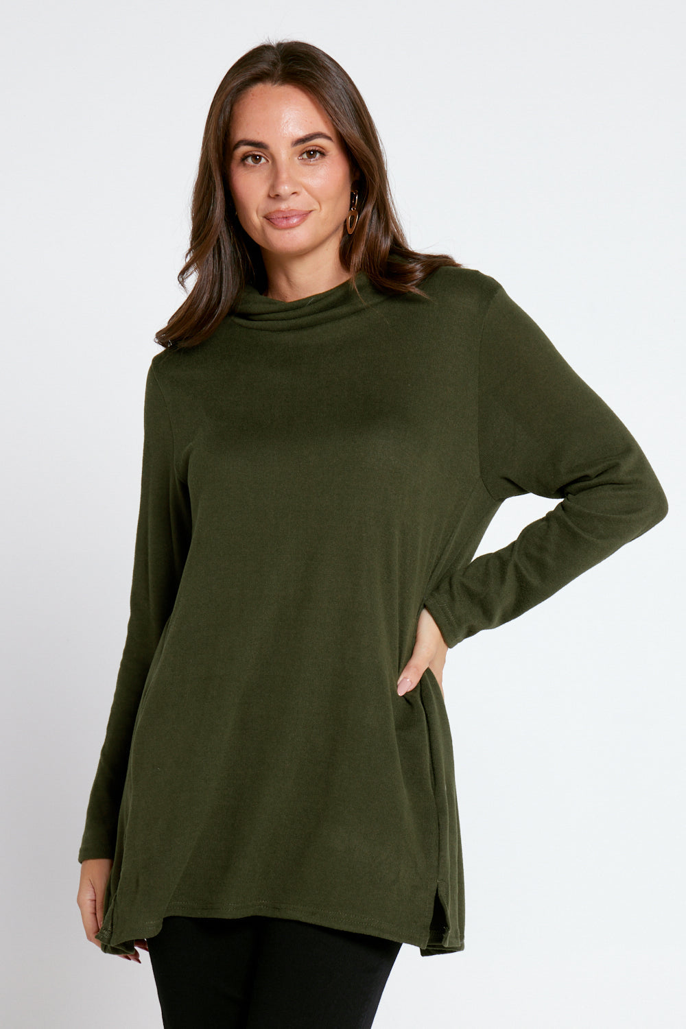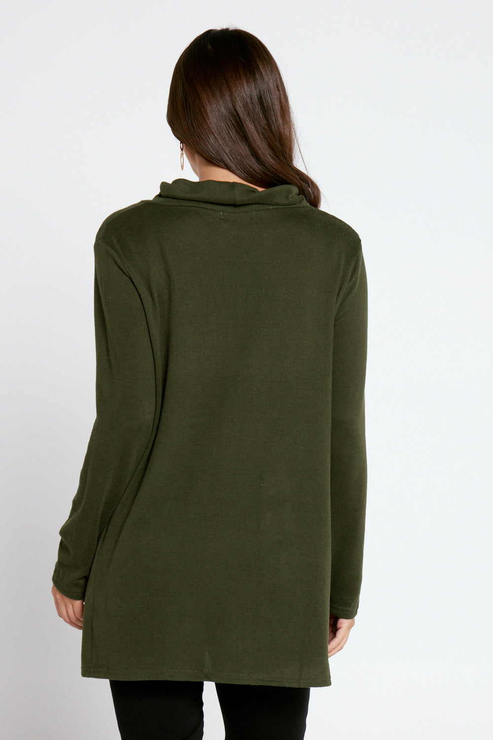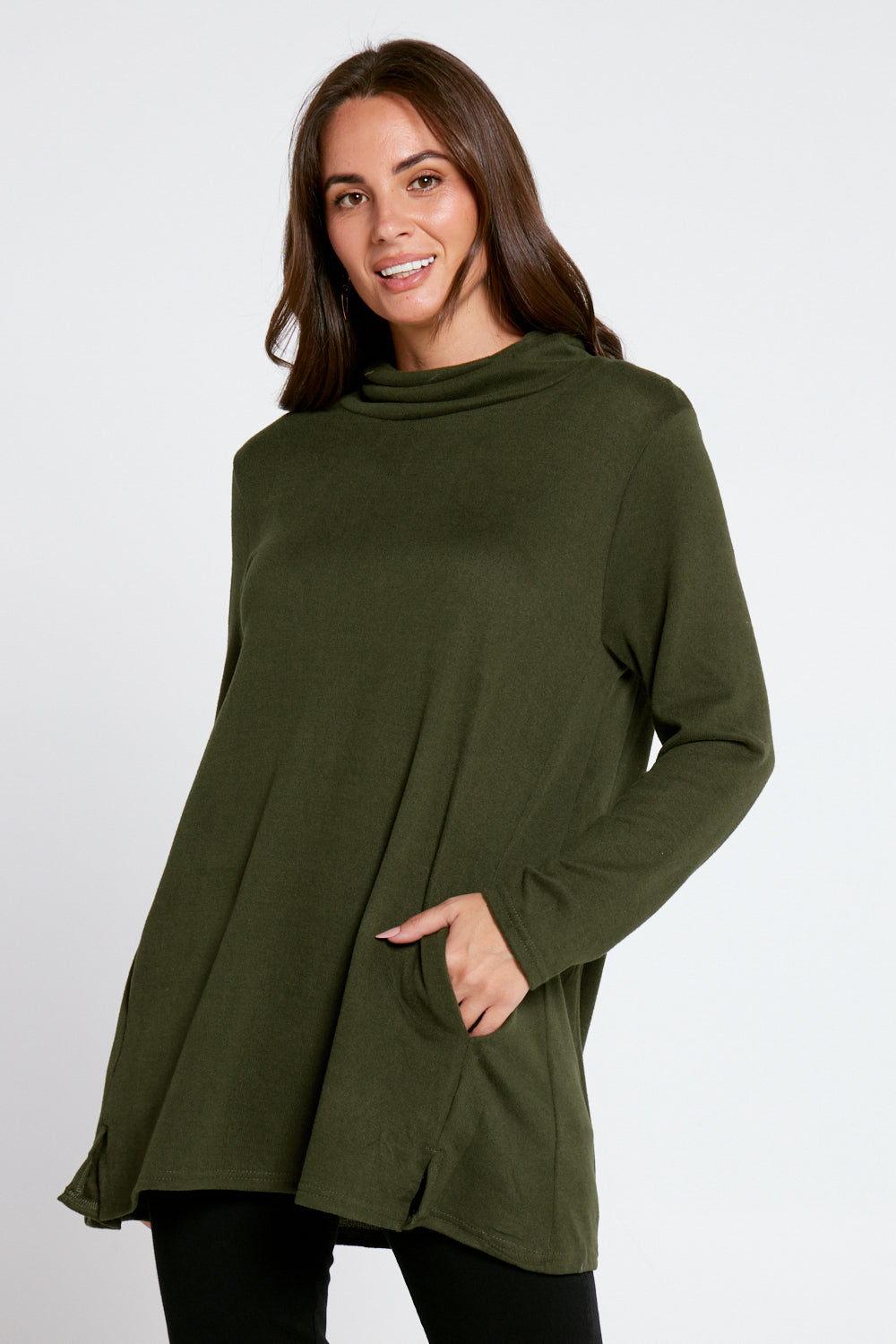 The Lina Cowl Knit Tunic in a deep khaki green is a must-have addition to your wardrobe. Stay cozy and stylish with its cowl neck, long sleeves, and relaxed fit. Keep your essentials close with convenient in seam pockets. Made with lightweight knit, this tunic is perfect for any occasion.