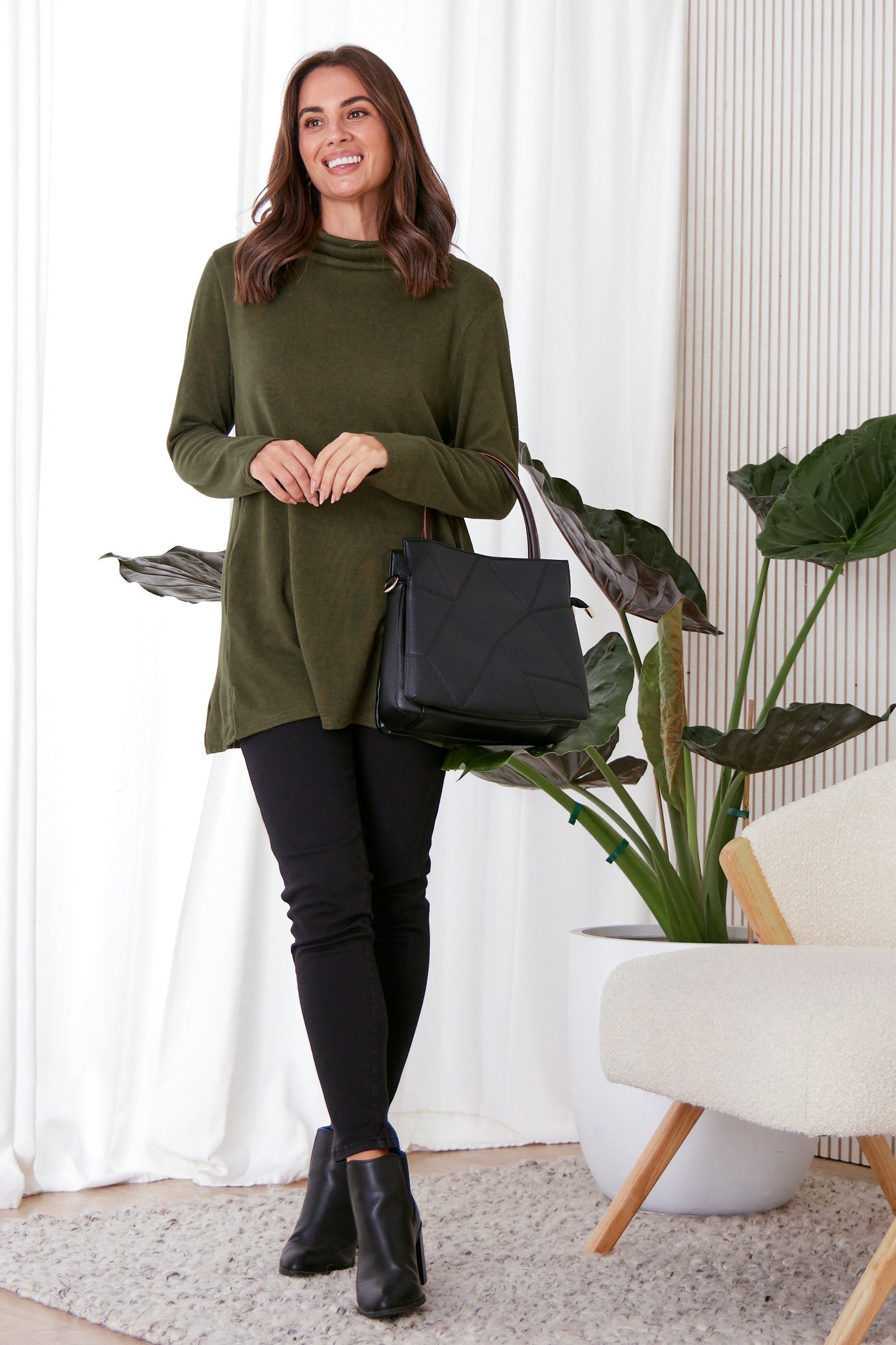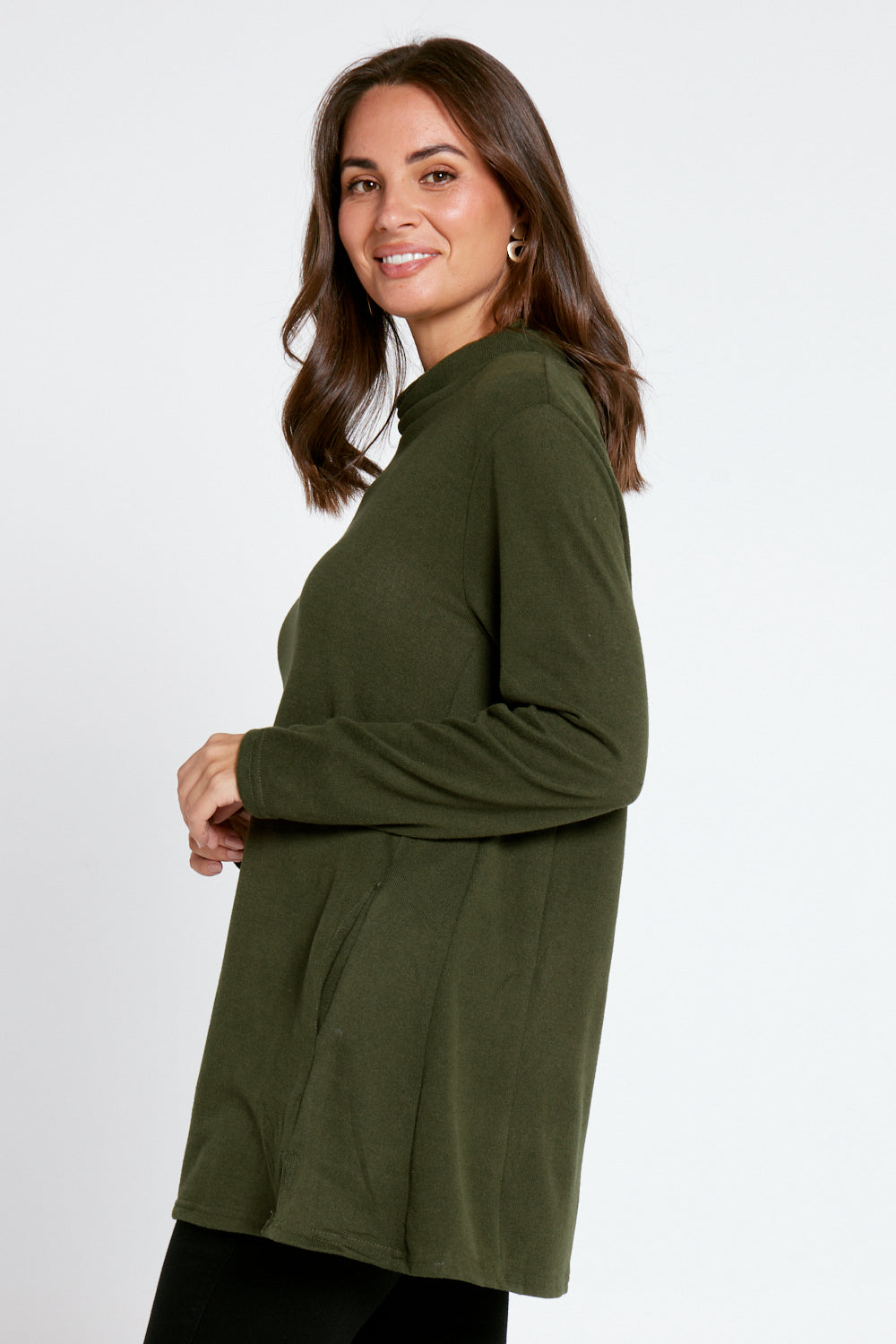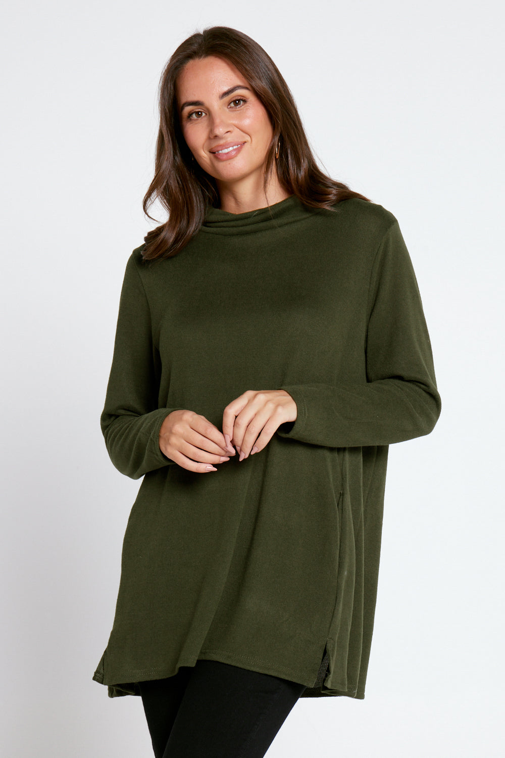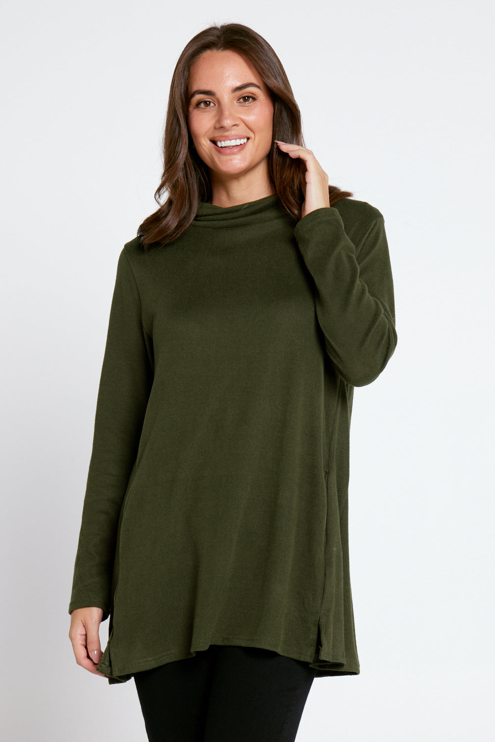 The Lina Cowl Knit Tunic in a deep khaki green is a must-have addition to your wardrobe. Stay cozy and stylish with its cowl neck, long sleeves, and relaxed fit. Keep your essentials close with convenient in seam pockets. Made with lightweight knit, this tunic is perfect for any occasion.
