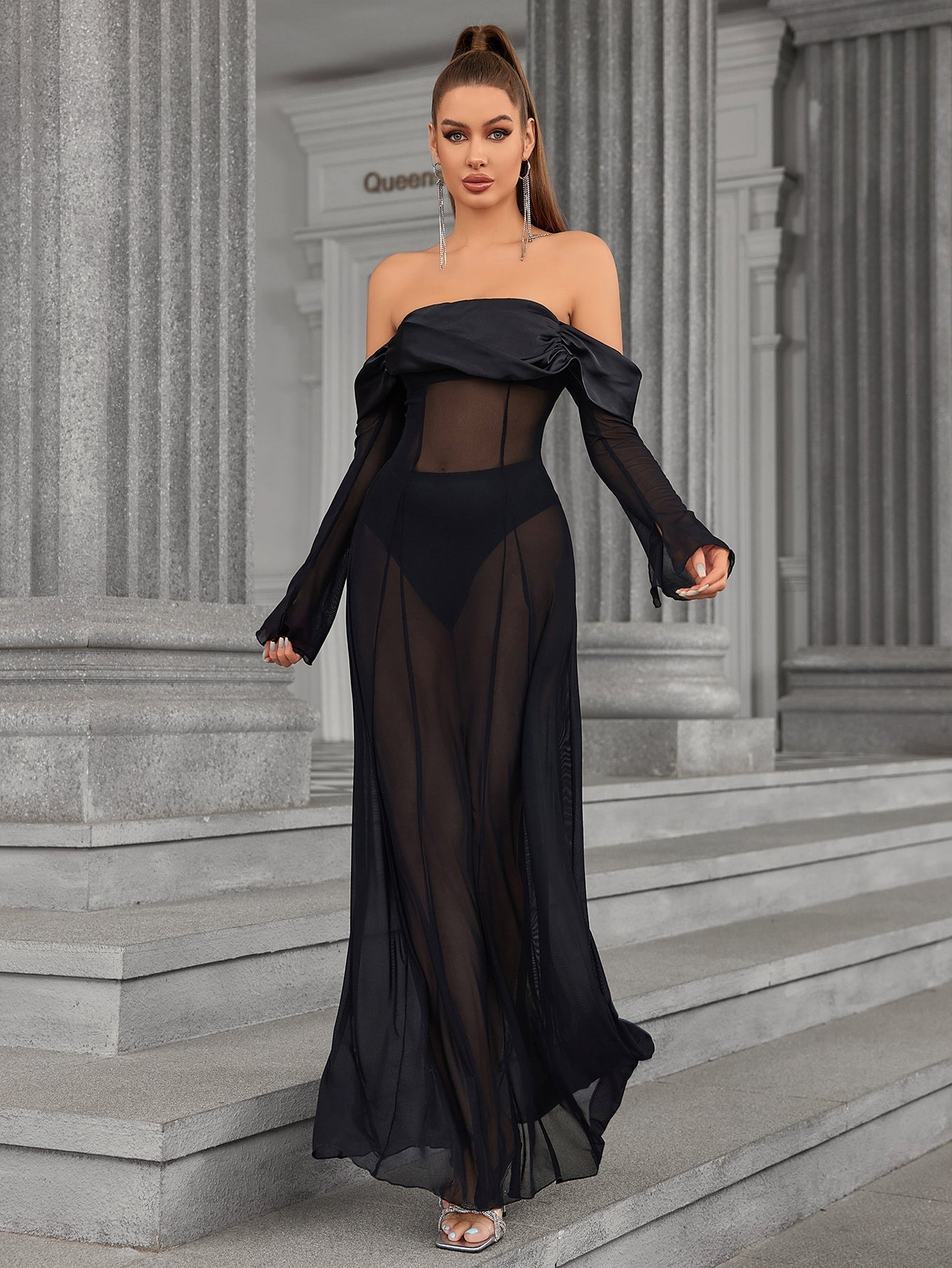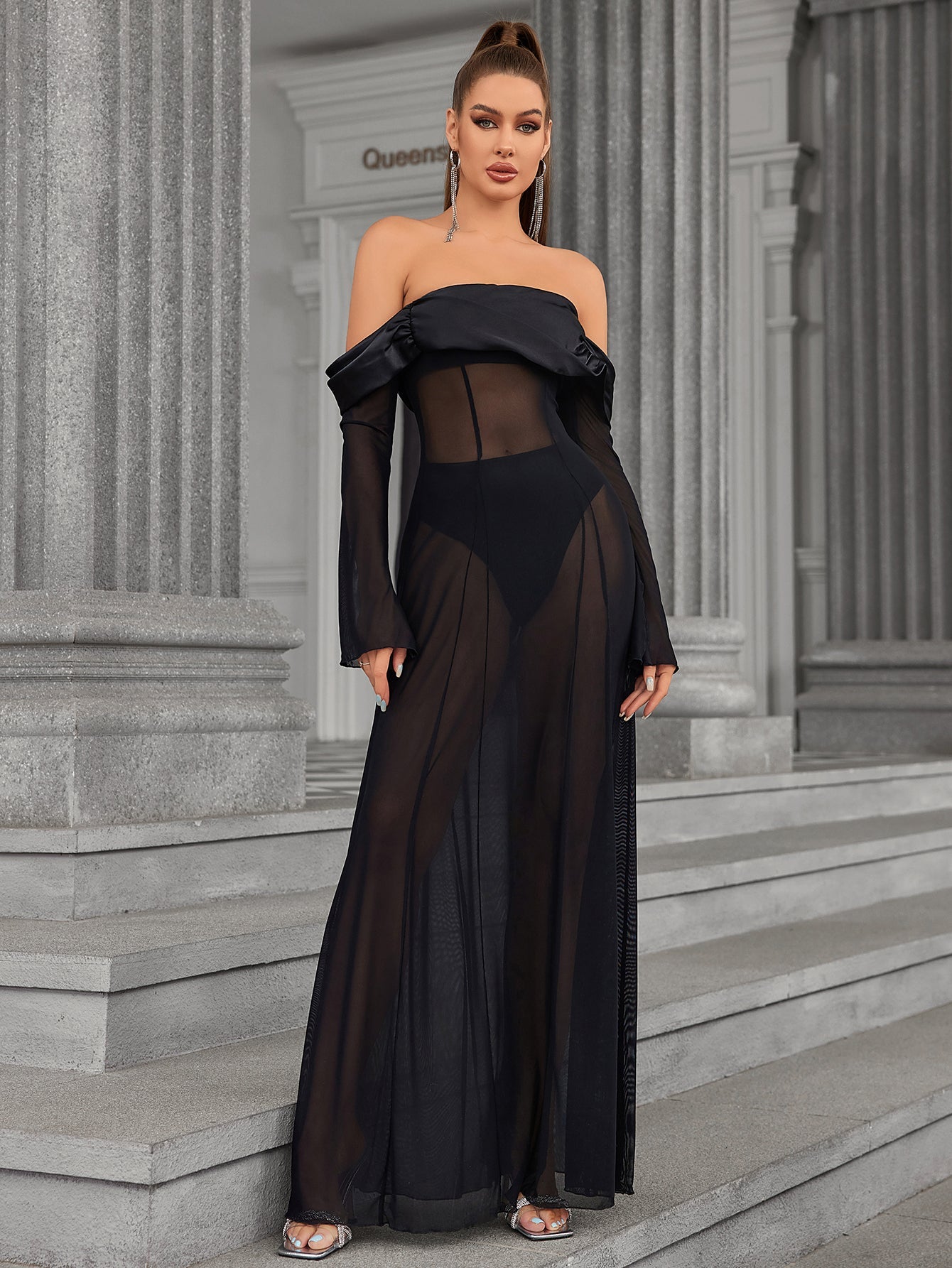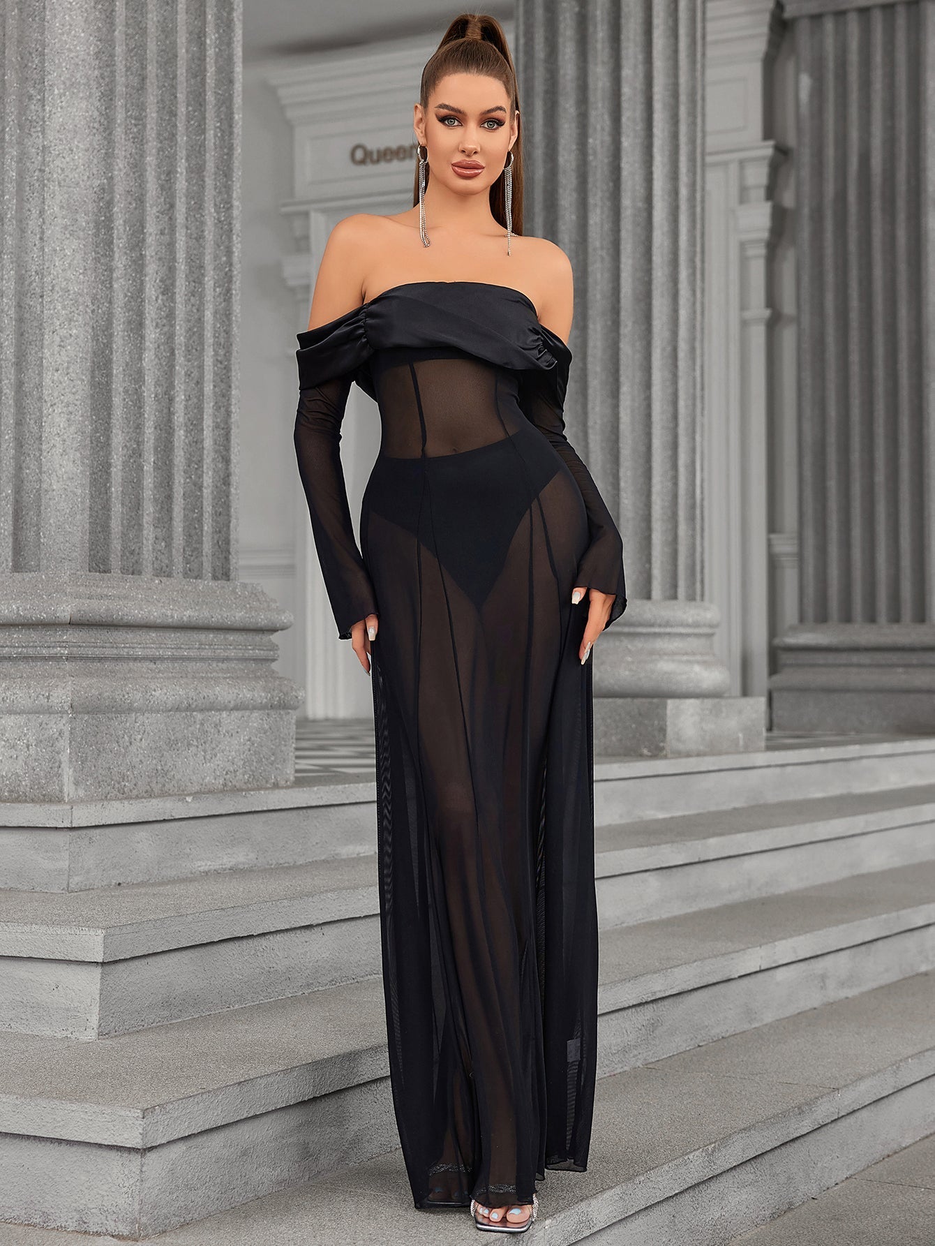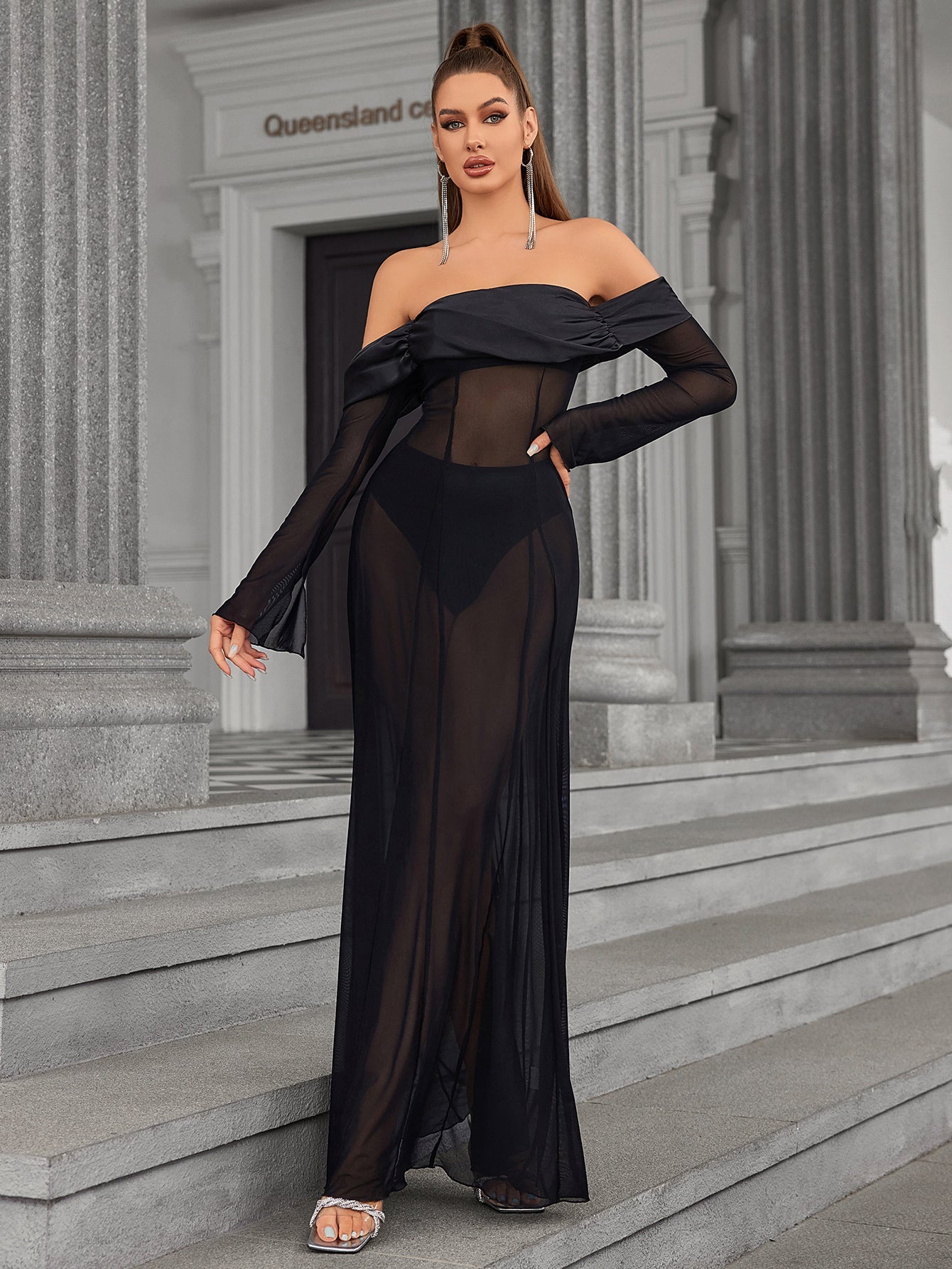 Long Sleeve Off Shoulder Satin Patchwork Mesh Dress
