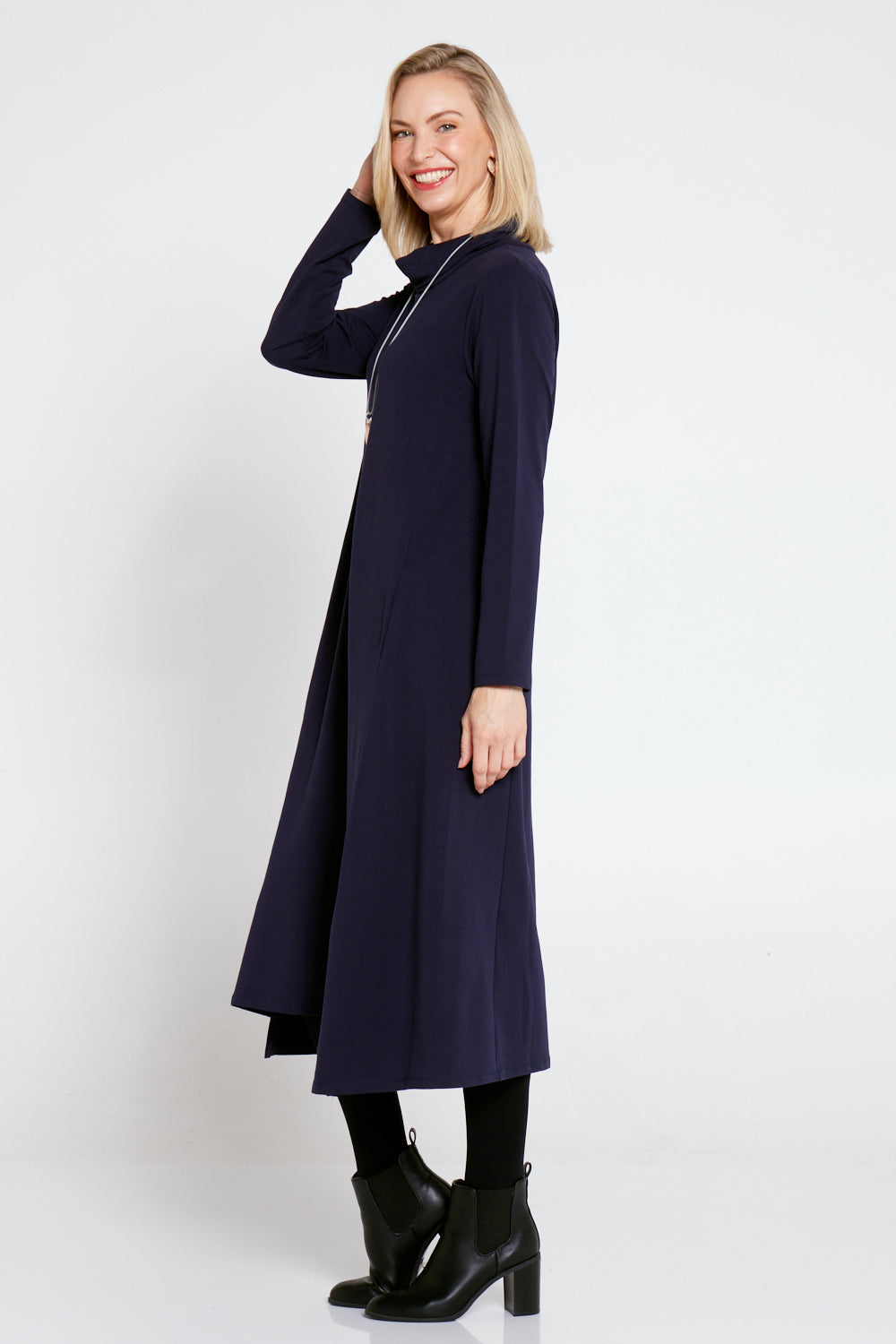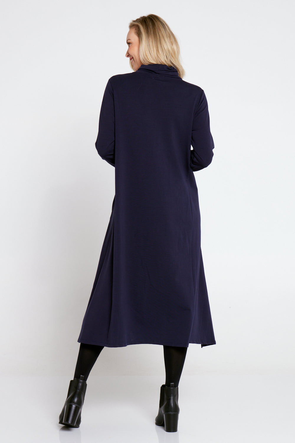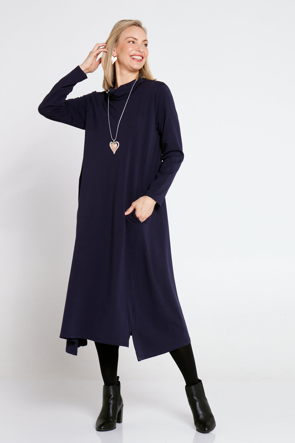 You've asked, we've listened! Introducing the Margie Cowl Pocket Dress, the sister to the Joslin Cowl Tunic! Crafted with all the same design details, but now in the length of a midi dress. The fine French Terry jersey is smooth for a flattering effect, while boasting enough weight to accentuate the silhouette and to make this style warm and cosy for autumn and winter. The deep navy is a timeless option for any wardrobe.