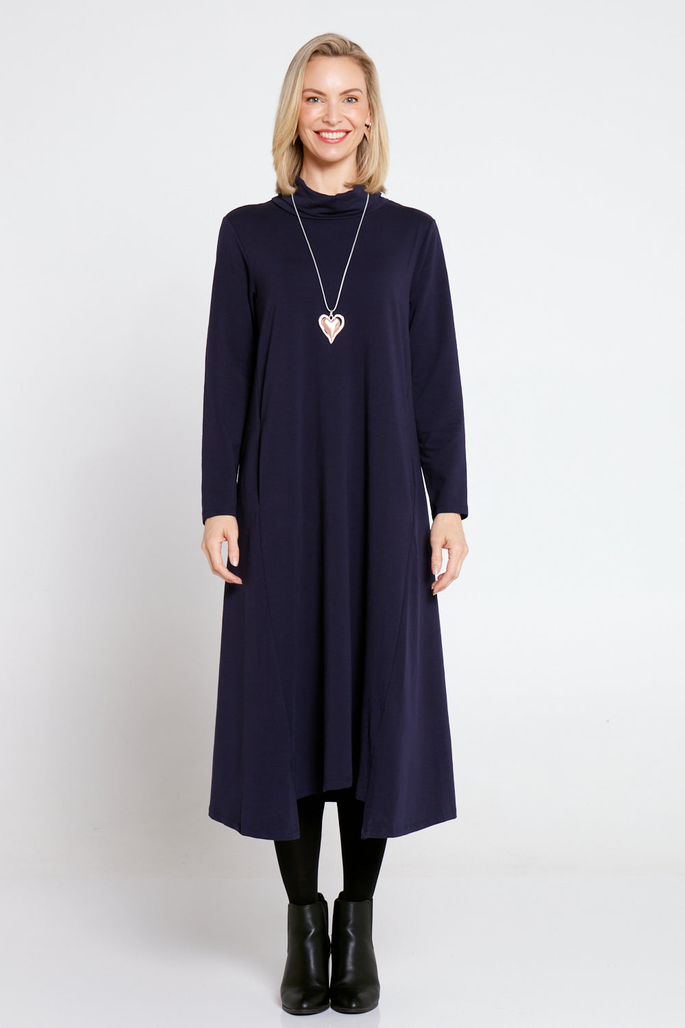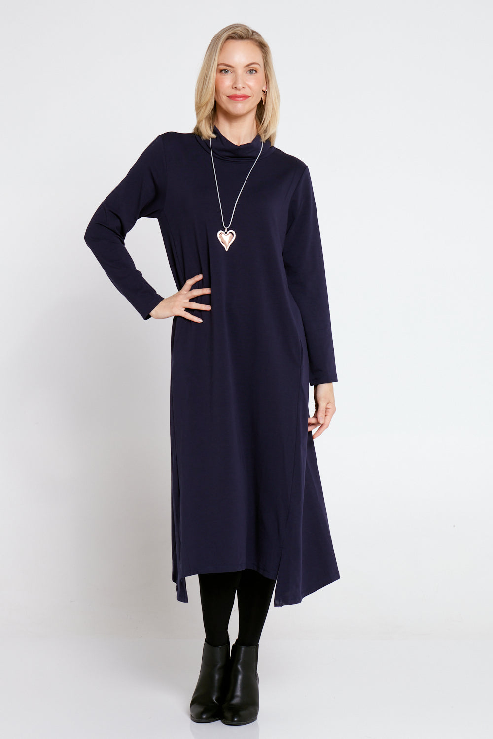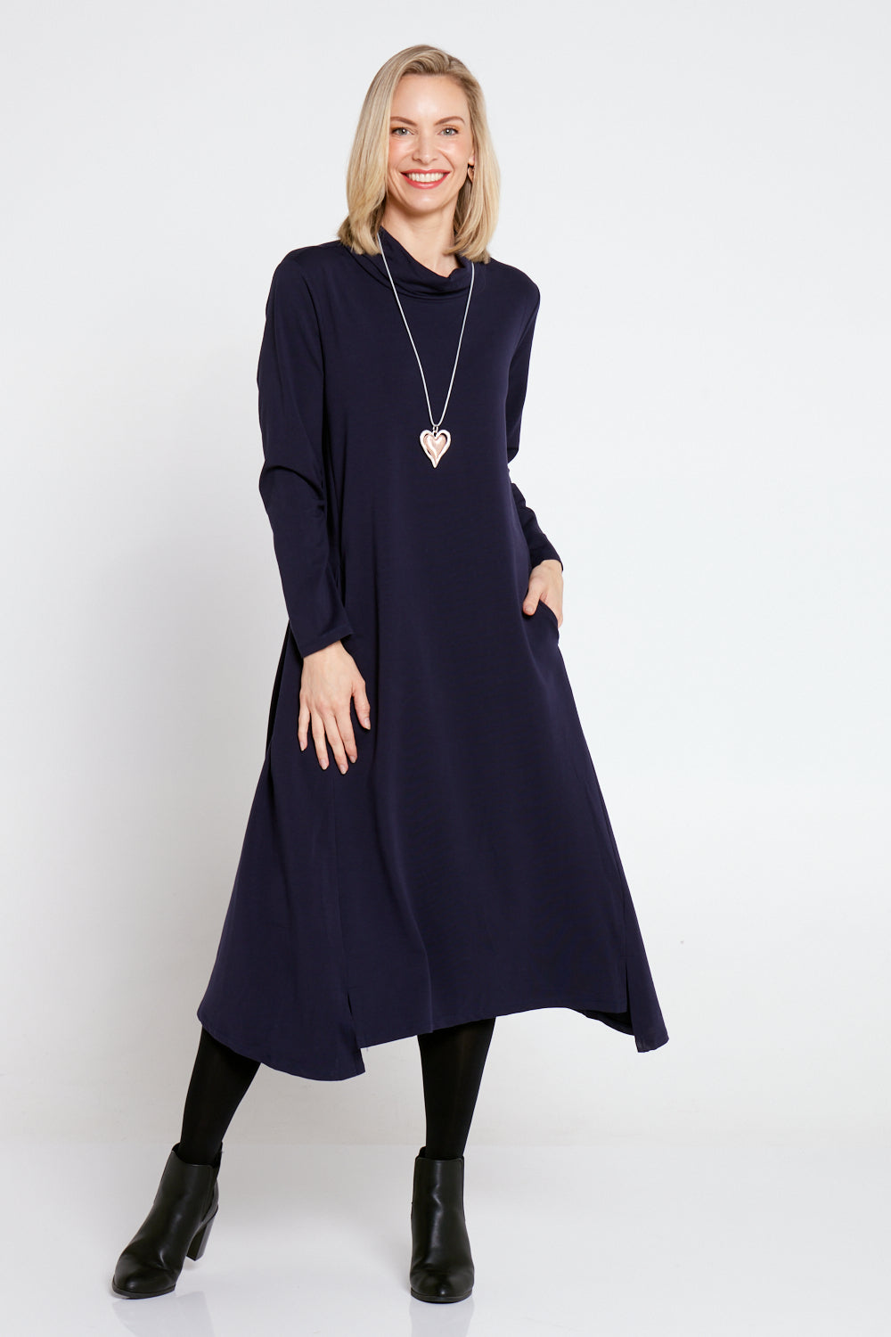 You've asked, we've listened! Introducing the Margie Cowl Pocket Dress, the sister to the Joslin Cowl Tunic! Crafted with all the same design details, but now in the length of a midi dress. The fine French Terry jersey is smooth for a flattering effect, while boasting enough weight to accentuate the silhouette and to make this style warm and cosy for autumn and winter. The deep navy is a timeless option for any wardrobe.