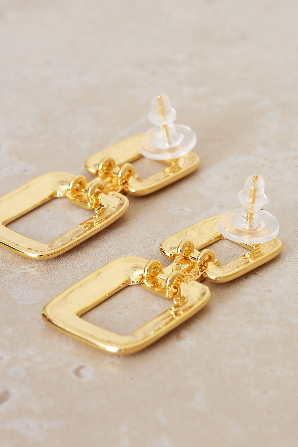 Make a bold statement with these striking gold-tone earrings. Featuring a geometric design, they boast a polished, double-link structure with open square shapes, creating a modern and eye-catching look. The shiny gold finish adds a touch of luxury, while the secure post backs ensure comfortable and easy wear. Perfect for adding a contemporary edge to any outfit, these lightweight earrings are a versatile and stylish addition to your jewellery collection.