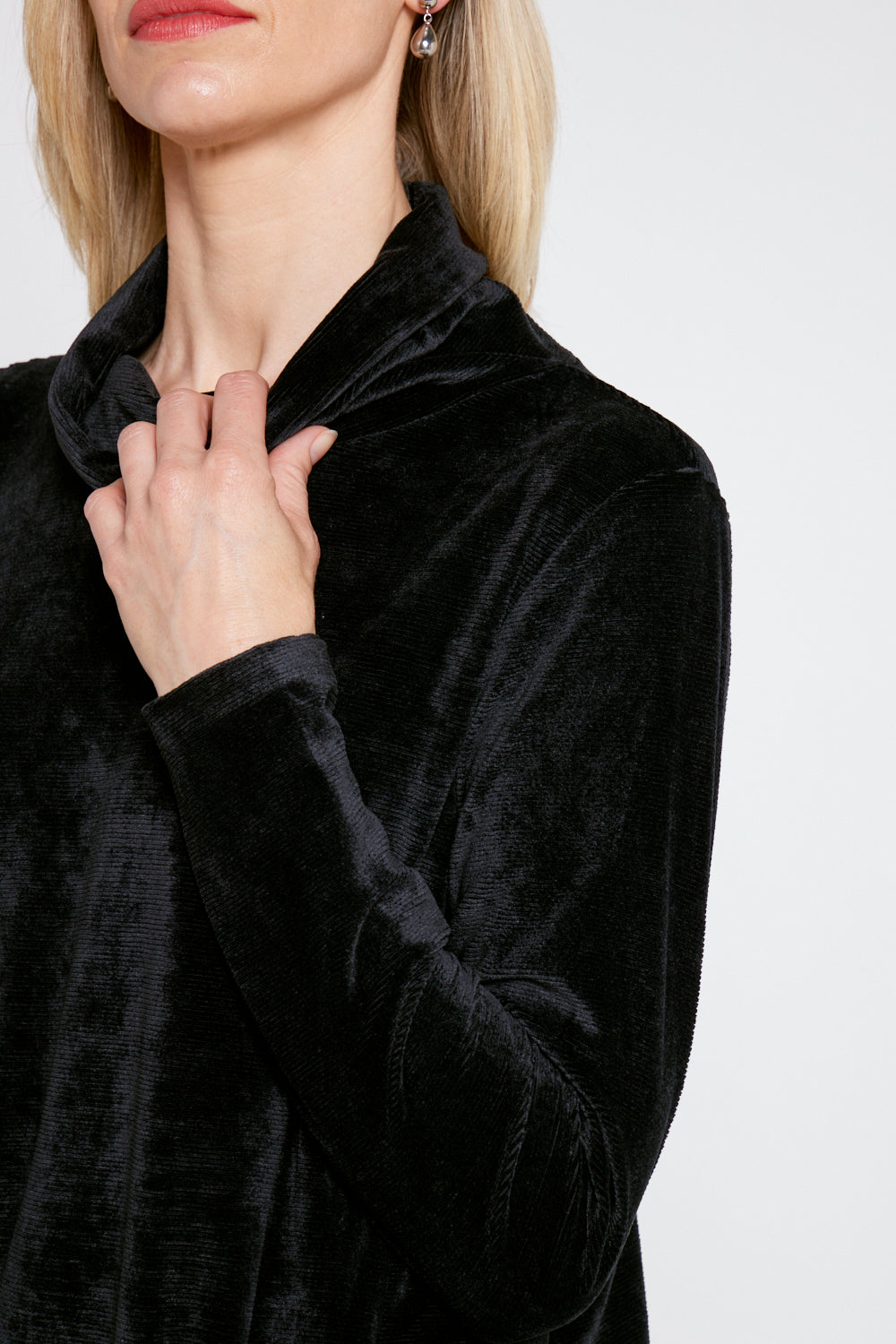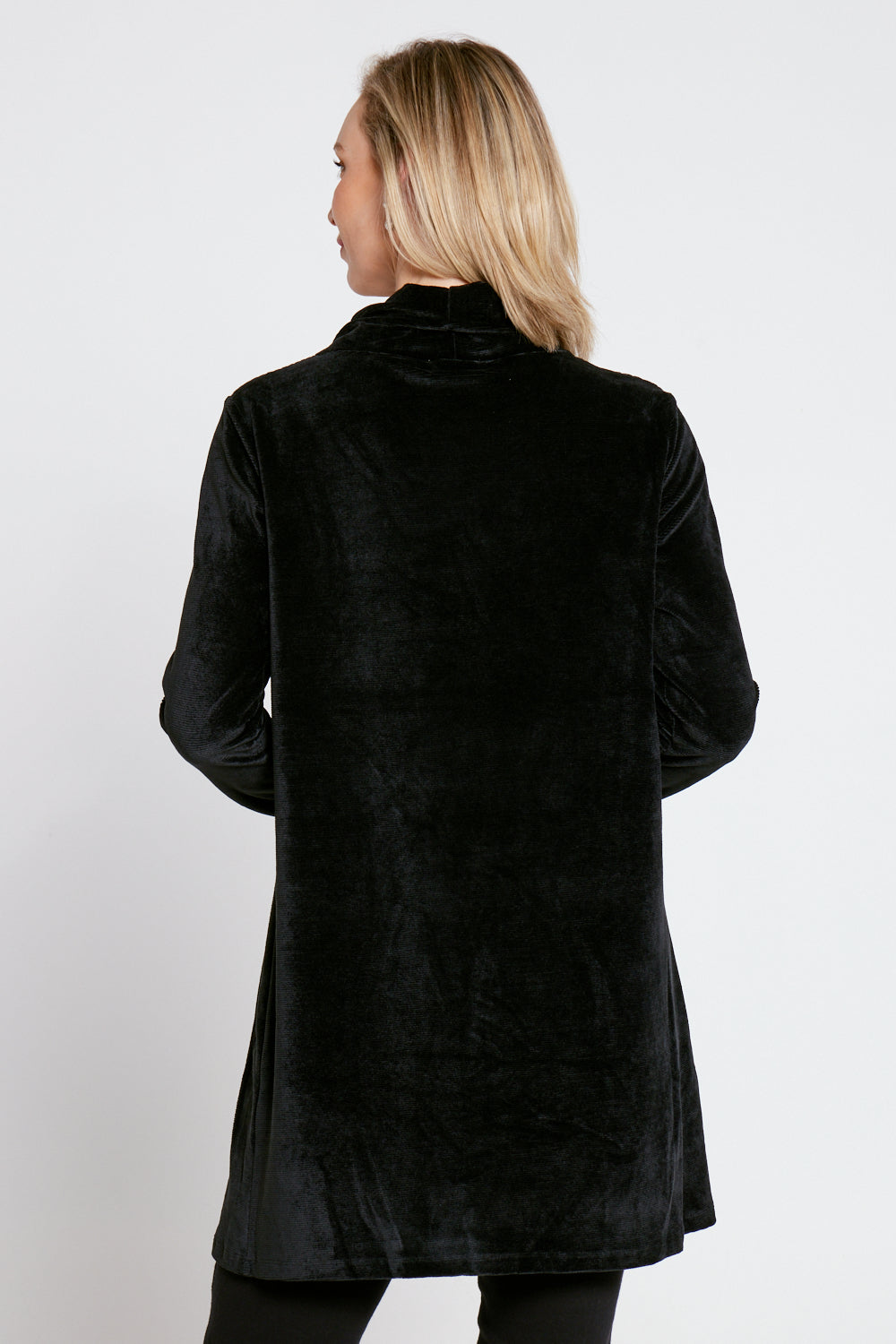 Velvet has become a huge trend right now, from fashion to homeware, it exudes a sense of opulent elegance. So rich and luxurious, it softly reflects the light and falls in thick, draping folds. With a cowl neck, drop shoulders and pouch pocket that adds to the draping look. The plain black is utterly timeless, so you can add this style to your collection knowing you will be able to wear it year after year.