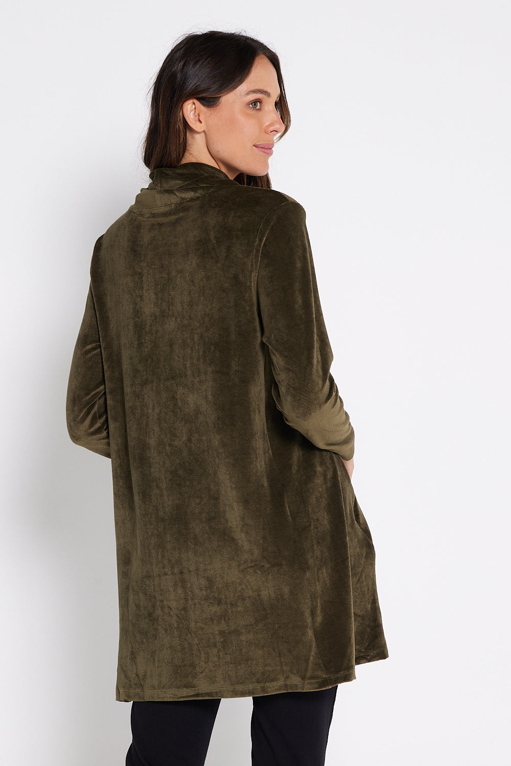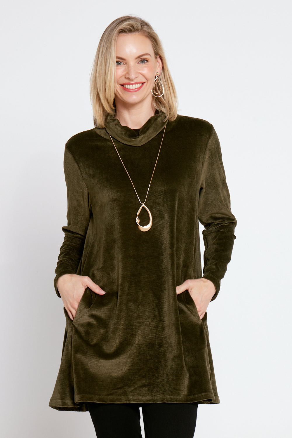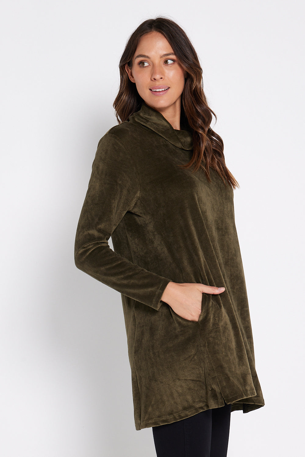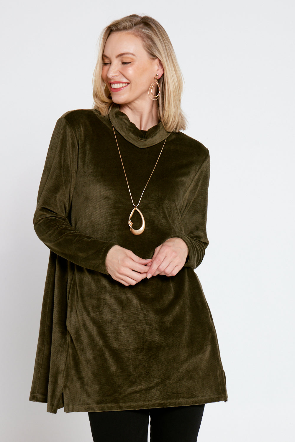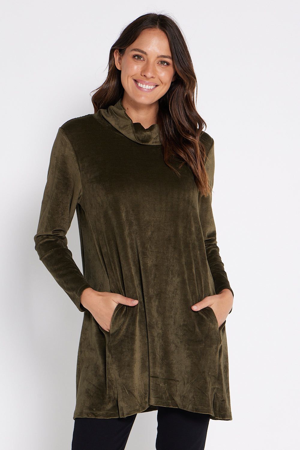 Velvet has become a huge trend right now, from fashion to homeware, it exudes a sense of opulent elegance. So rich and luxurious, it softly reflects the light and falls in thick, draping folds. With a cowl neck, drop shoulders and pouch pocket that adds to the draping look. The dark khaki is just perfection, a timeless colour for autumn and winter. You can add this style to your collection knowing you will be able to wear it year after year.