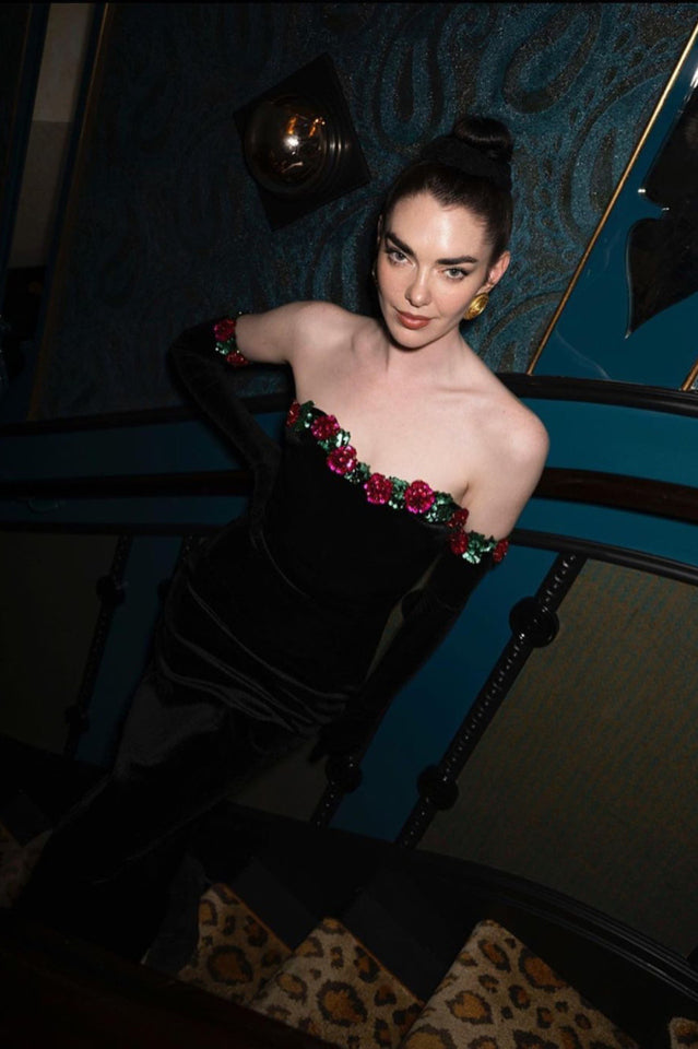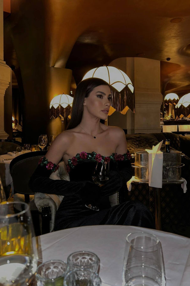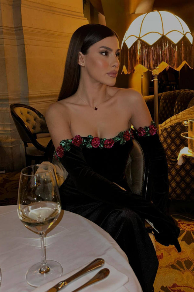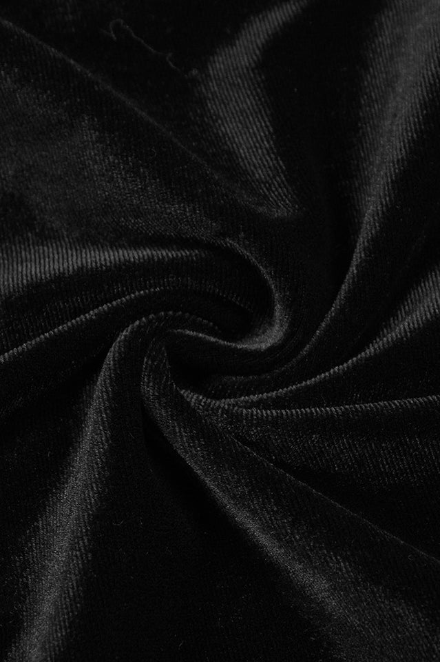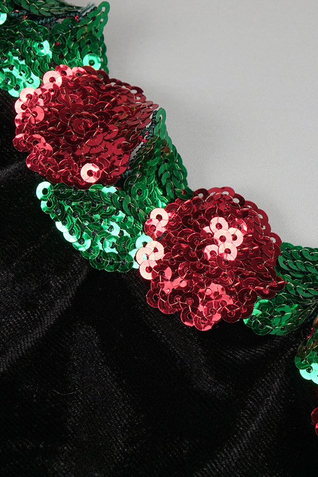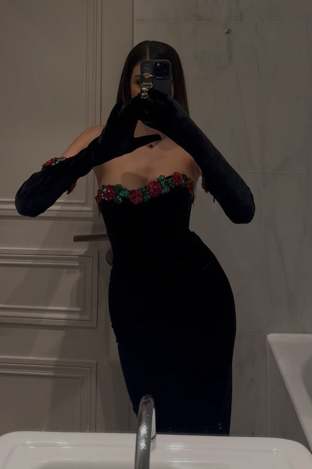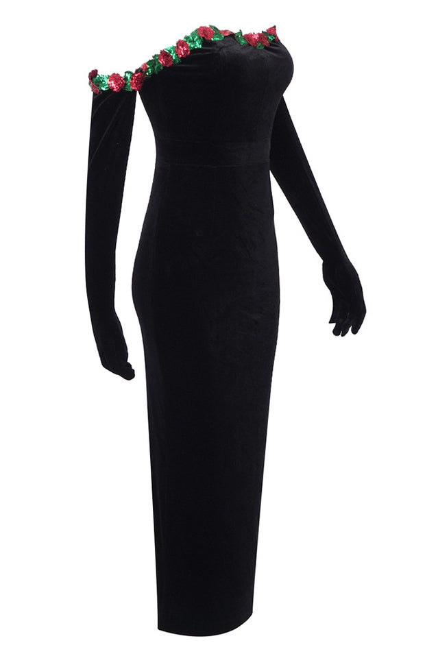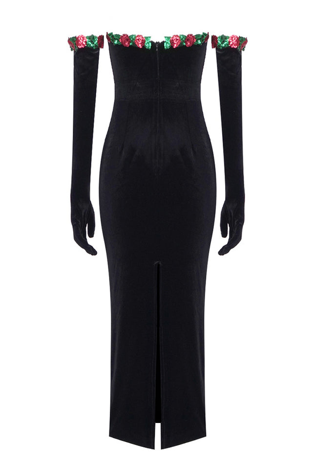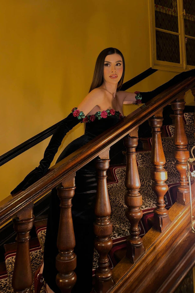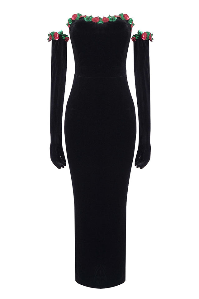 This stunning black dress features intricate floral detailing and a flattering strapless design. Made with luxurious velvet material, it's perfect for any special occasion. Make a statement and turn heads in this elegant and eye-catching dress!