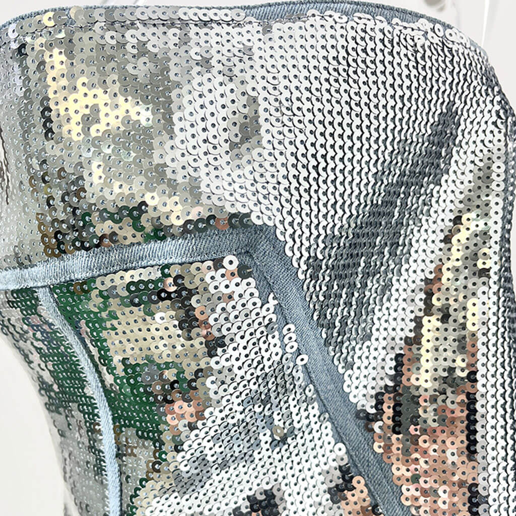 Metallic Sequin Embellished Sleeveless Denim Bustier Crop Top