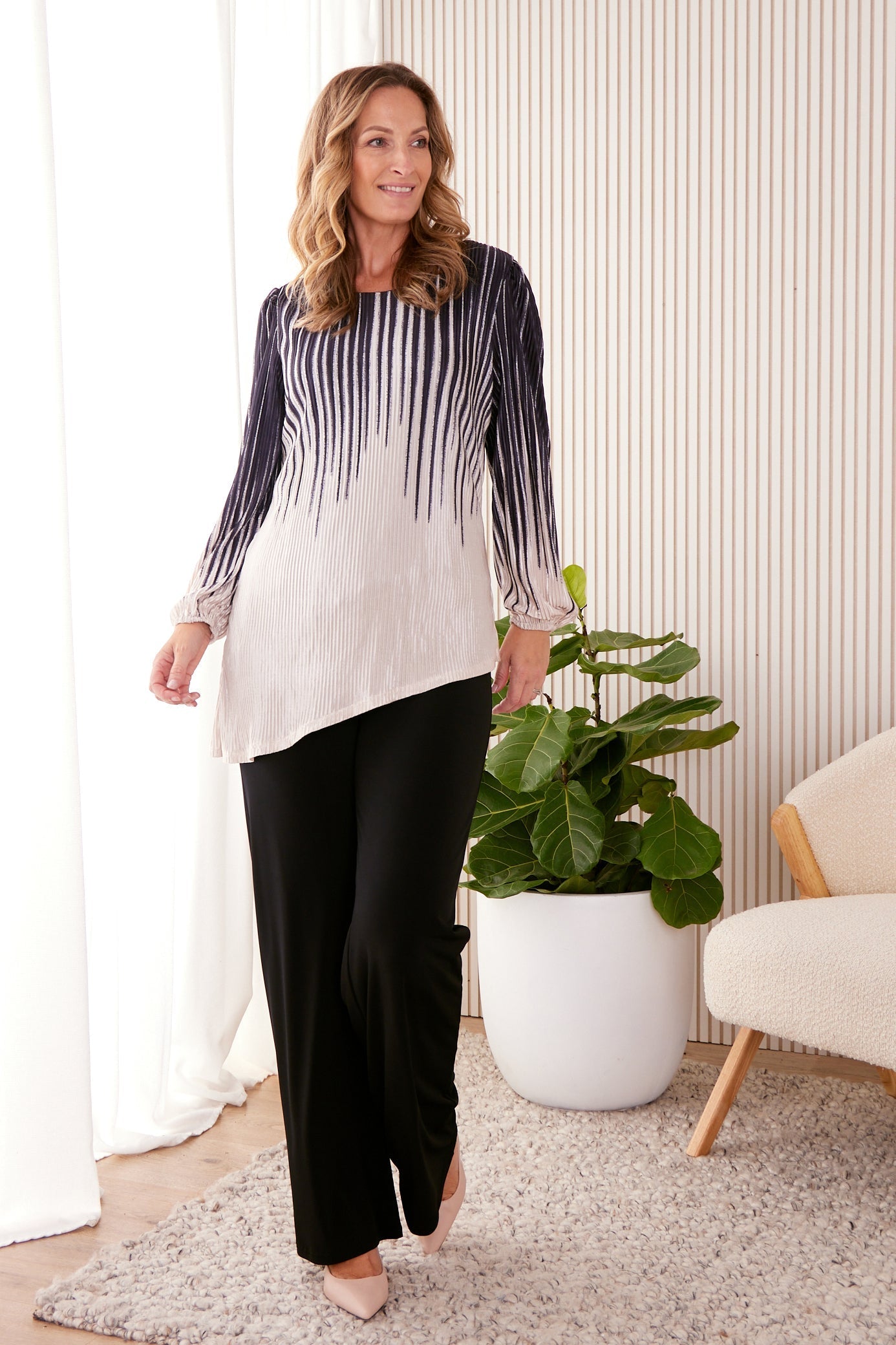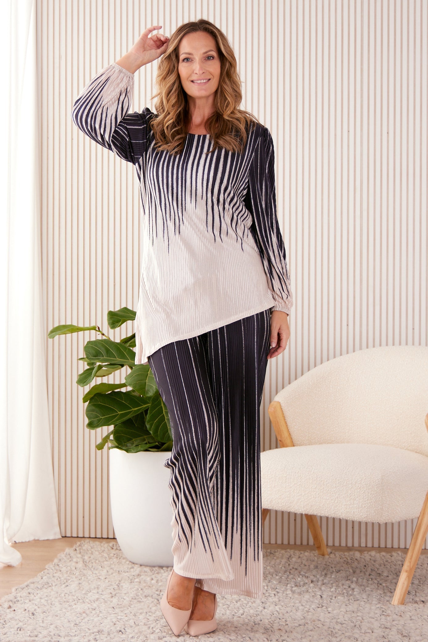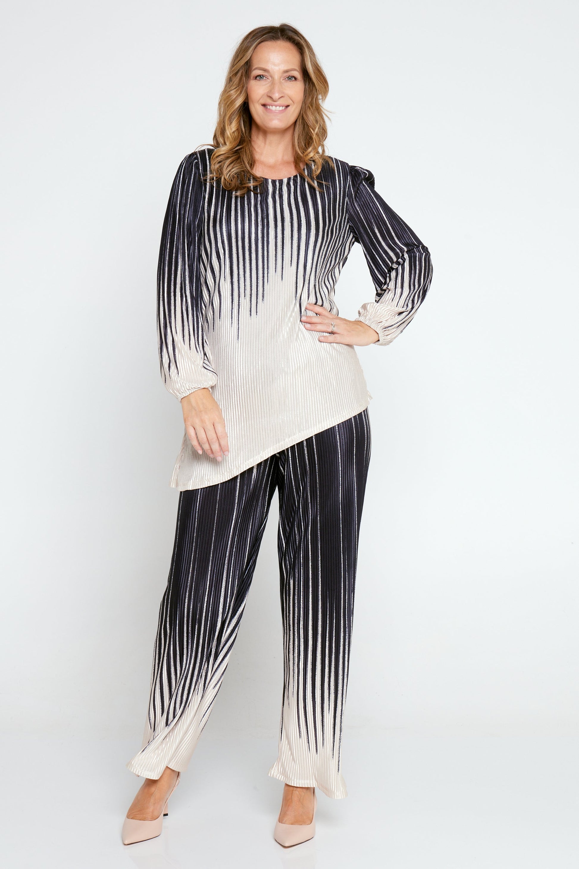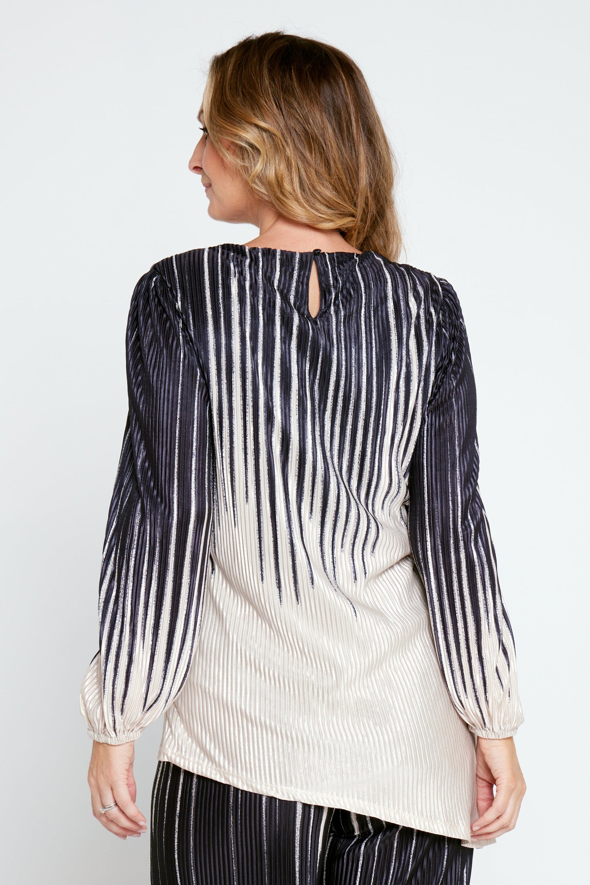 Make a striking statement with our Mohini Satin Pleat Tunic in Black/Champagne, ideal for parties and special occasions. Featuring a luxurious creamy champagne and black colorway with a unique vertical stripe color block design, this tunic exudes elegance. It showcases a round neck, puffed shoulders, long sleeves with gathered cuffs, and an asymmetric hemline. Adorned with micro accordion pleats and crafted from satin feel fabric, it's a must-have for those seeking bold sophistication. Complete your ensemble with this stunning statement piece.