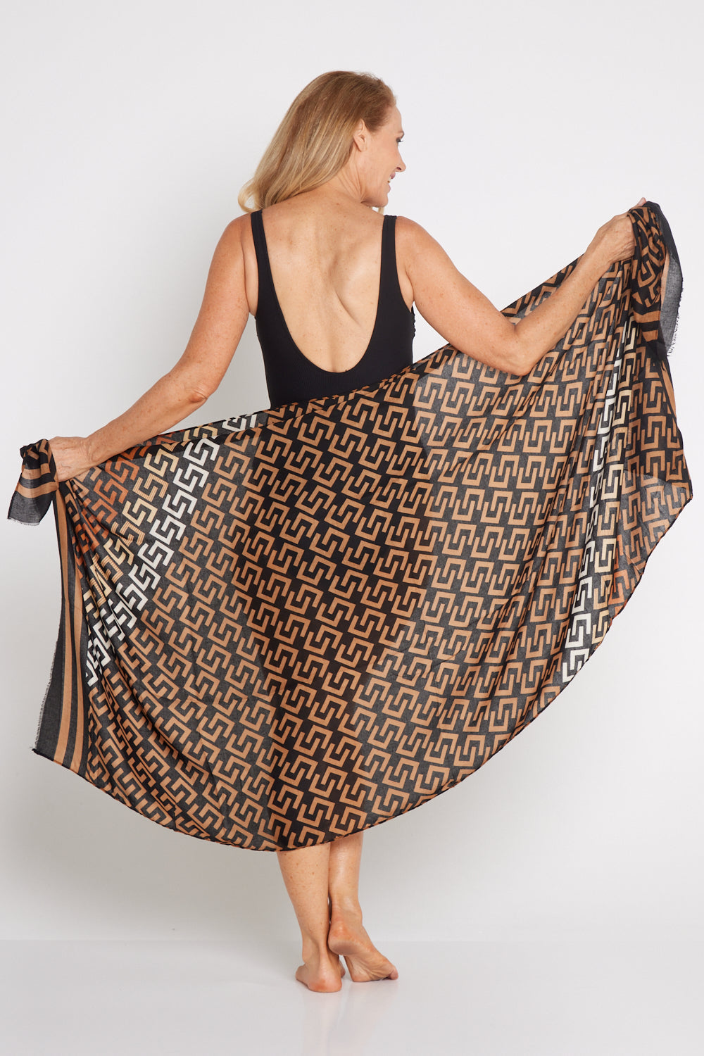 Introducing the Nadia Wrap, a vibrant and eye-catching accessory designed to add style and sophistication to your wardrobe. This beautiful design can be used as a scarf or sarong, perfect for any time of year. It features a striking mocha and black pattern with white highlights, creating a versatile piece that can elevate any outfit.