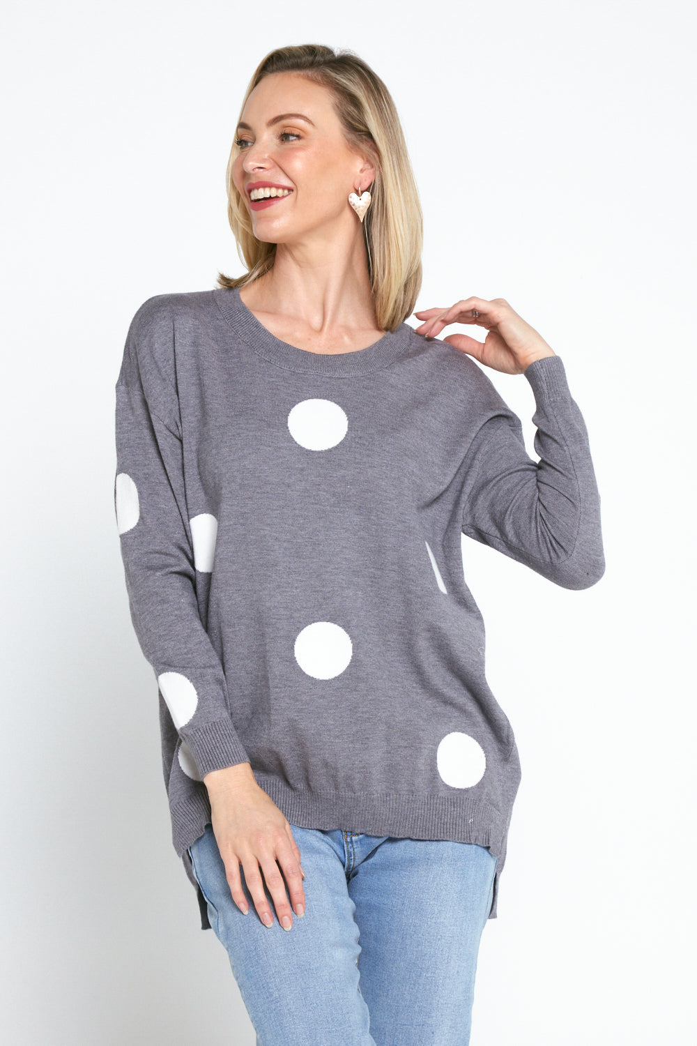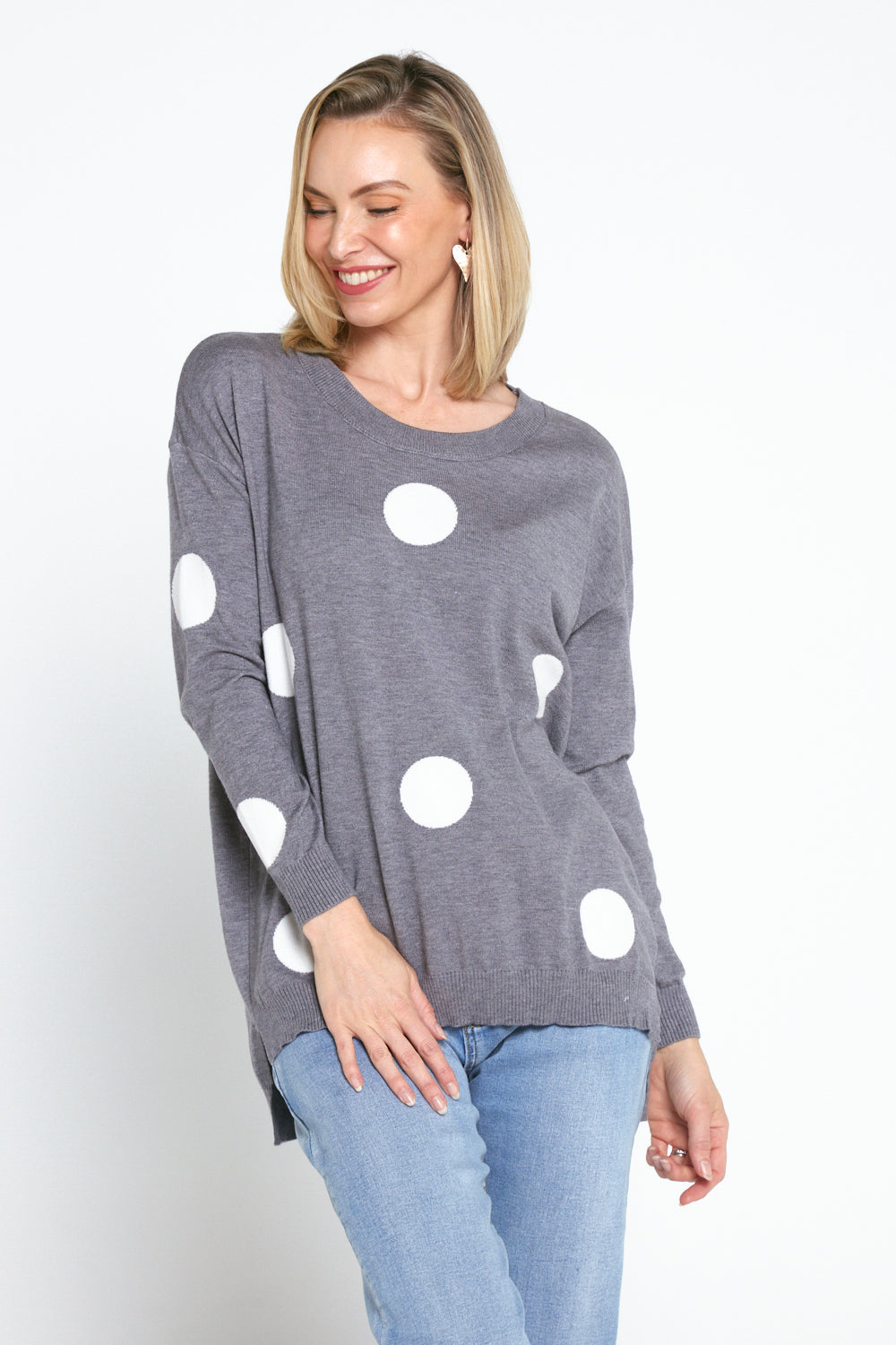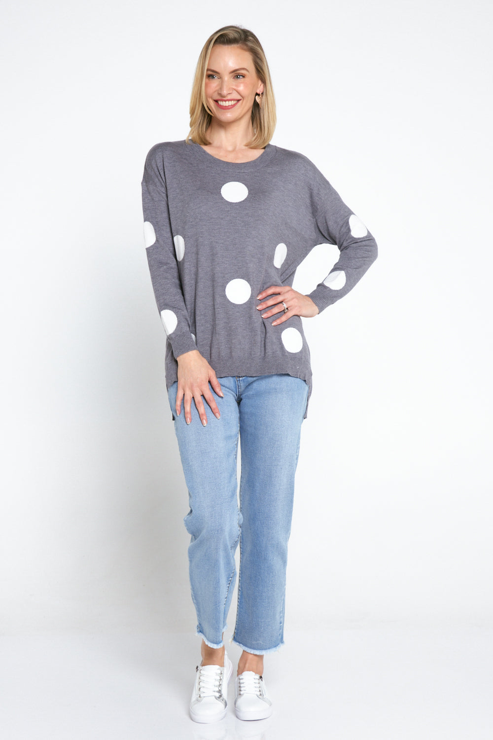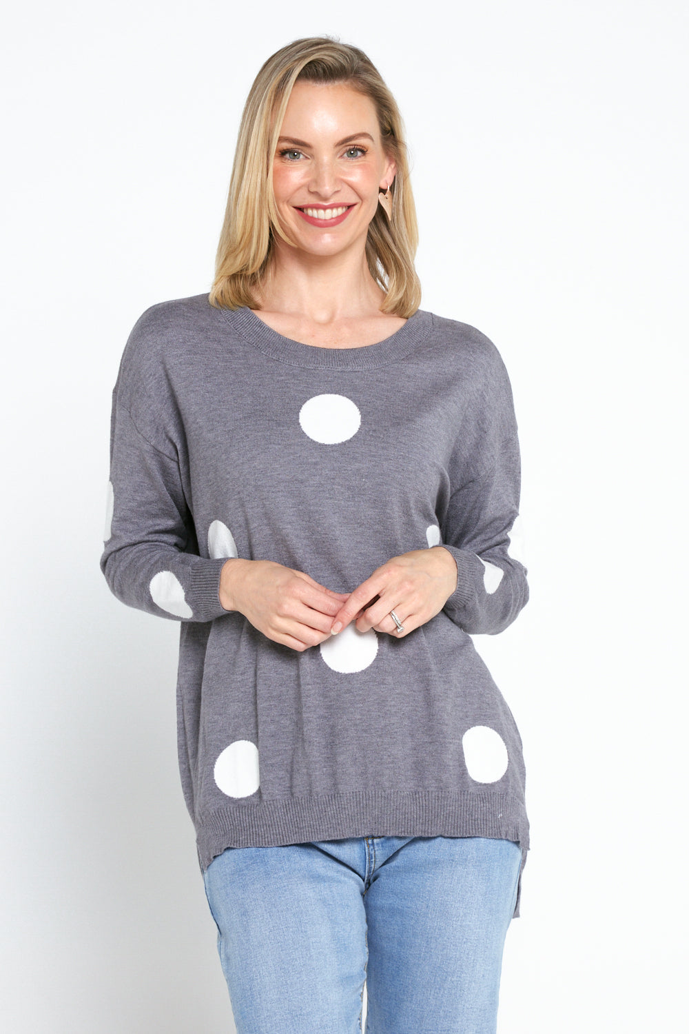 The Naomi Jumper in Grey Spot is the perfect addition to your wardrobe for an easy chic look. Featuring a crew neck, drop shoulders, stepped hemline with small side splits, and a relaxed fit, this fine knit jumper keeps you stylish and comfortable. The mid grey with large white spots adds a touch of playfulness to any outfit.