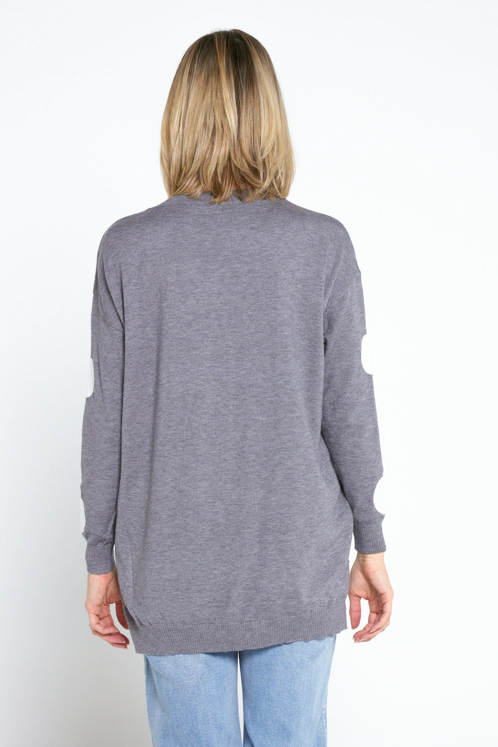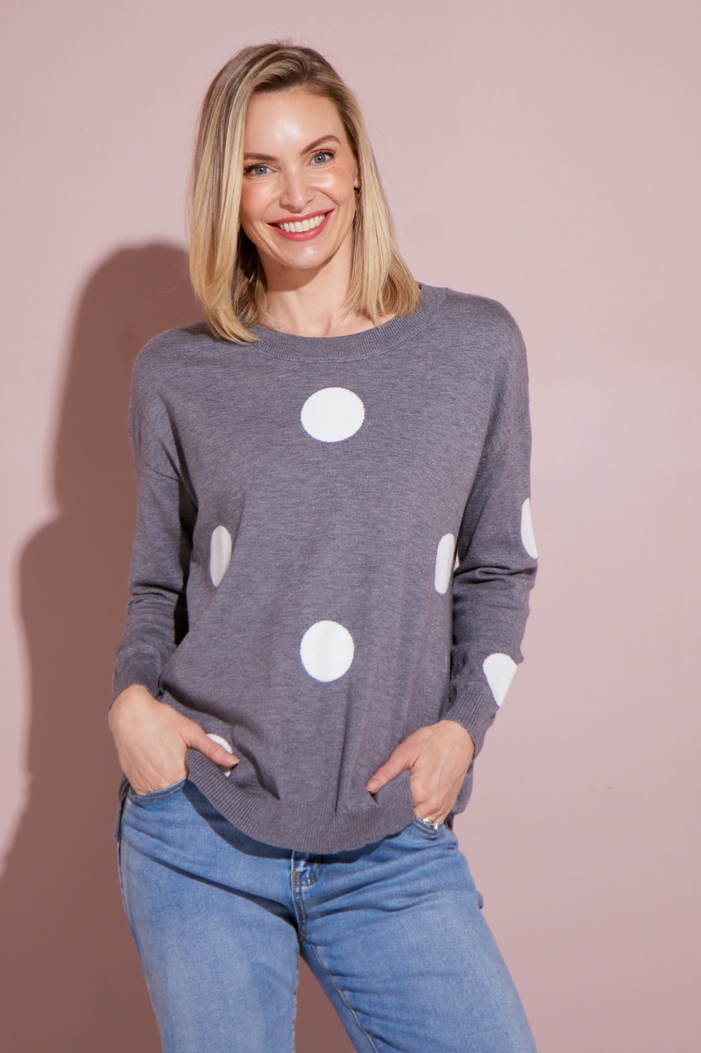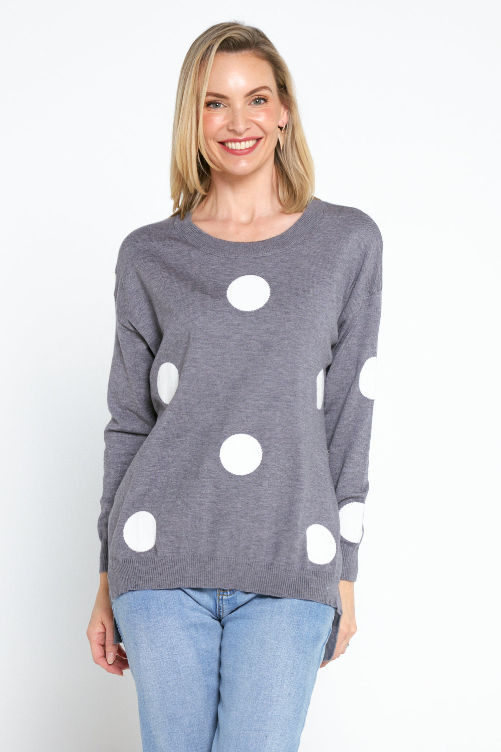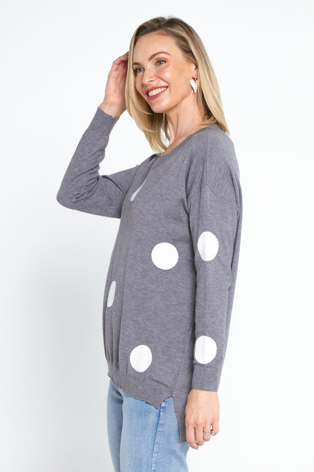 The Naomi Jumper in Grey Spot is the perfect addition to your wardrobe for an easy chic look. Featuring a crew neck, drop shoulders, stepped hemline with small side splits, and a relaxed fit, this fine knit jumper keeps you stylish and comfortable. The mid grey with large white spots adds a touch of playfulness to any outfit.