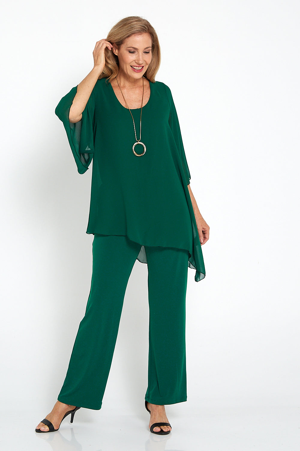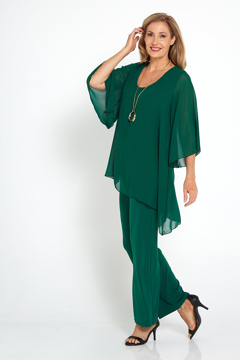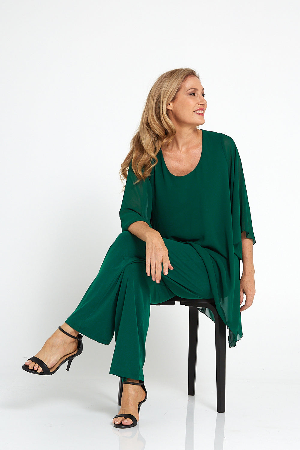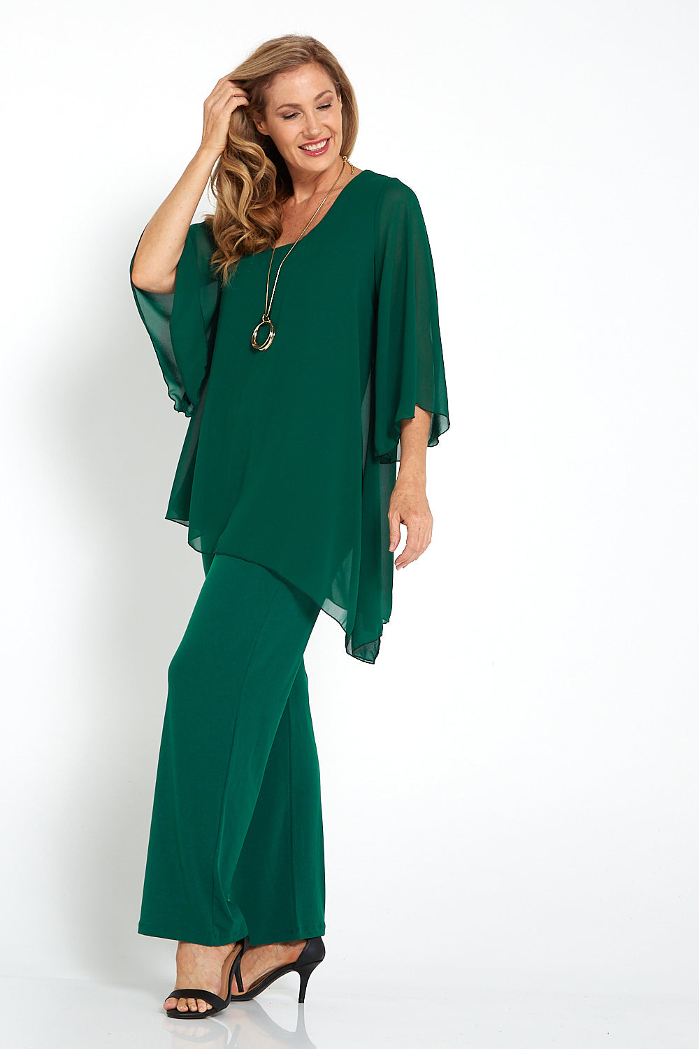 Sitting close to the body without feeling tight, the inner garment is sleeveless with an elasticised waist seam, easy-fit straight leg pant, and invisible back zip. A sheer overlay is attached at the shoulder, with an asymmetrical hem, wide 3/4 sleeves, and back split which enables you to easily access the inner zip. Adorn with you sparkliest accessories for festive special occasions.
