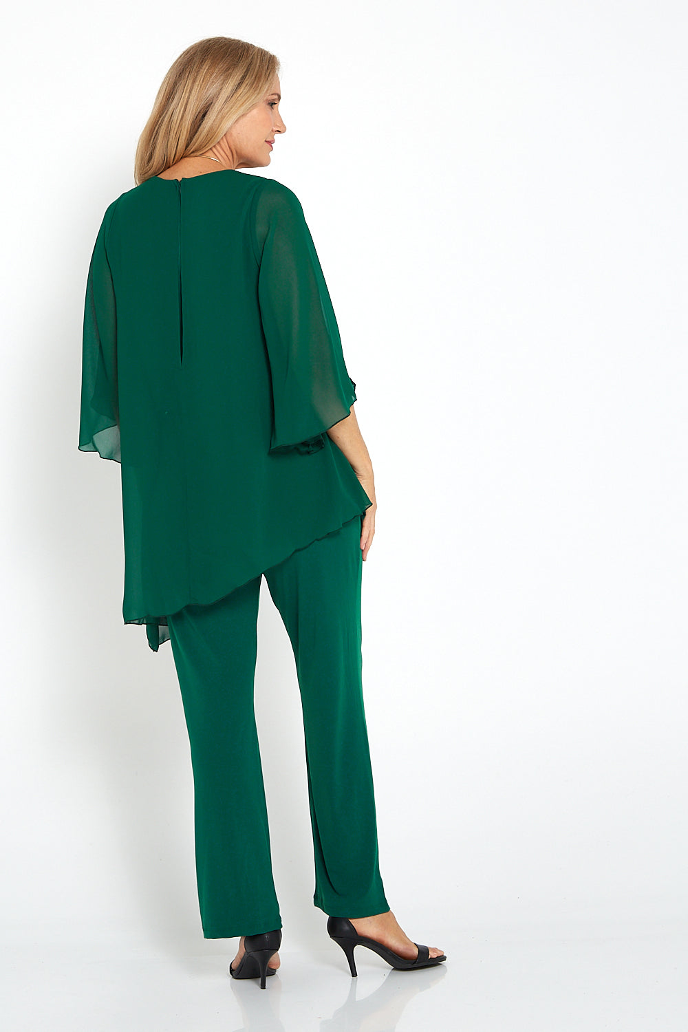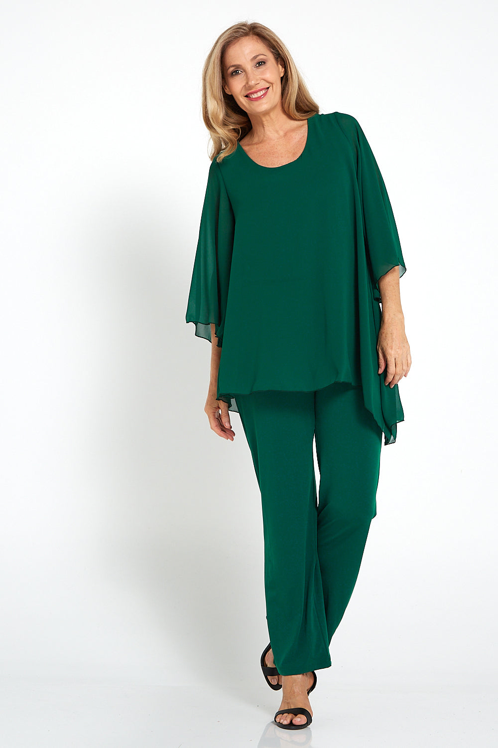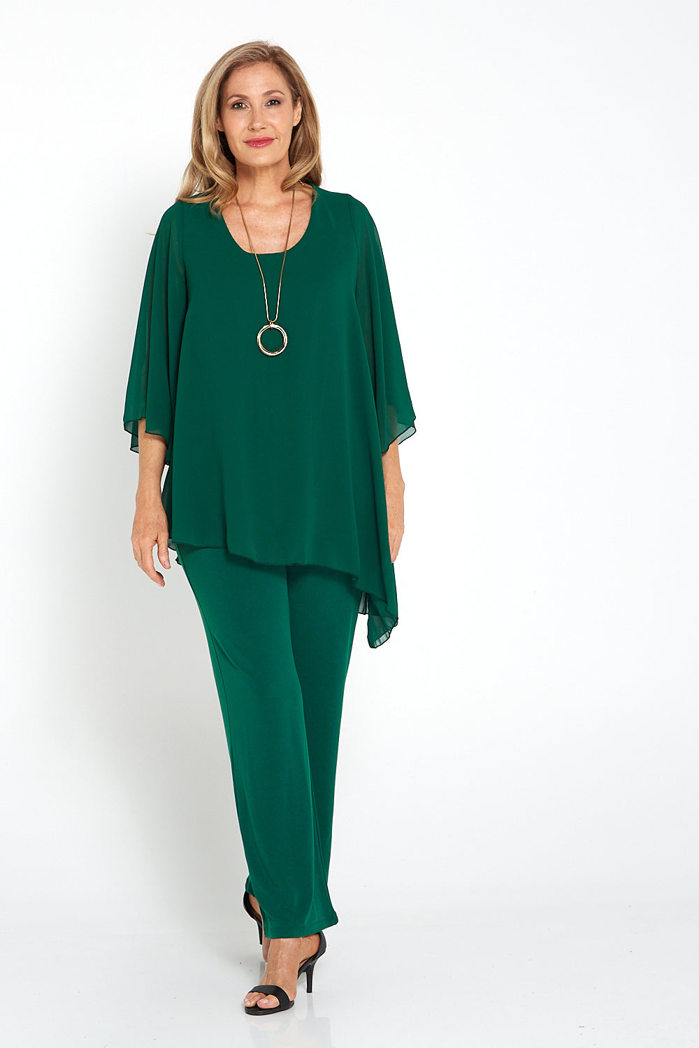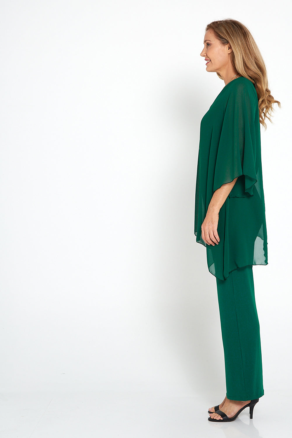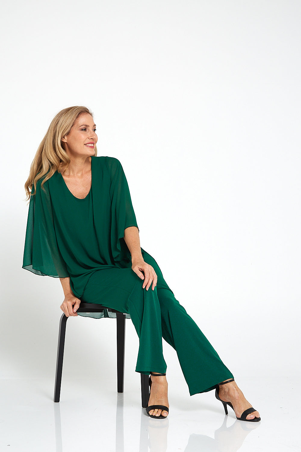 Sitting close to the body without feeling tight, the inner garment is sleeveless with an elasticised waist seam, easy-fit straight leg pant, and invisible back zip. A sheer overlay is attached at the shoulder, with an asymmetrical hem, wide 3/4 sleeves, and back split which enables you to easily access the inner zip. Adorn with you sparkliest accessories for festive special occasions.