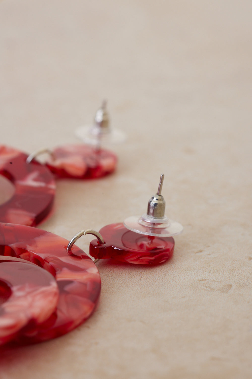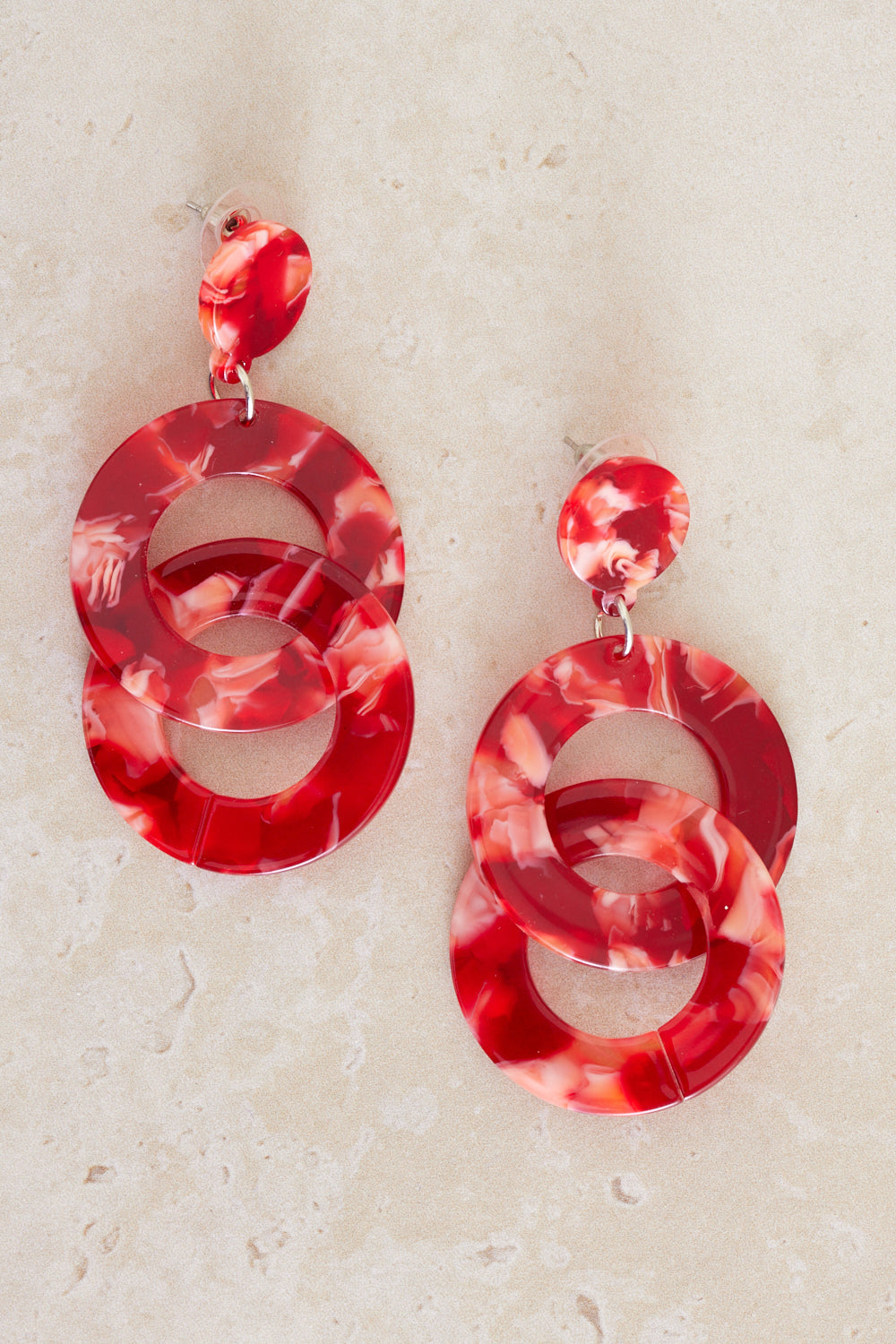 Make a bold statement with the Crimson Link Drop Earrings in vibrant red. These striking earrings feature interlocking circular links with a marbled effect, adding a unique and eye-catching touch to any outfit. Perfect for both casual and formal occasions, their lightweight construction ensures comfort throughout the day. Elevate your jewellery collection with these chic and contemporary earrings, perfect for adding a pop of colour and flair to your ensemble.