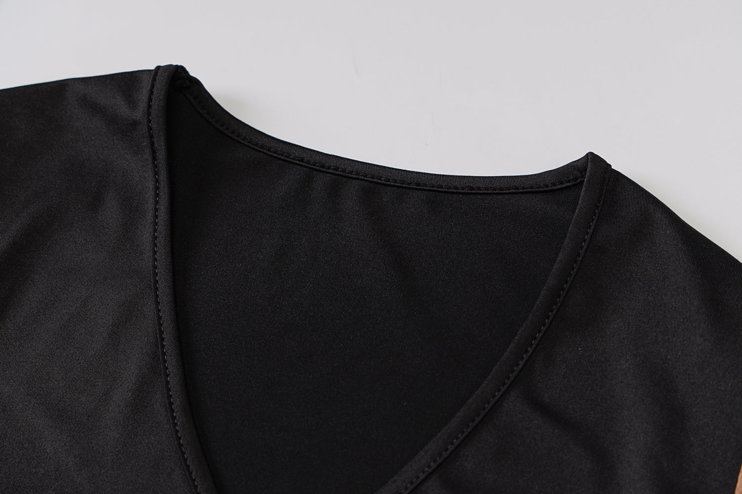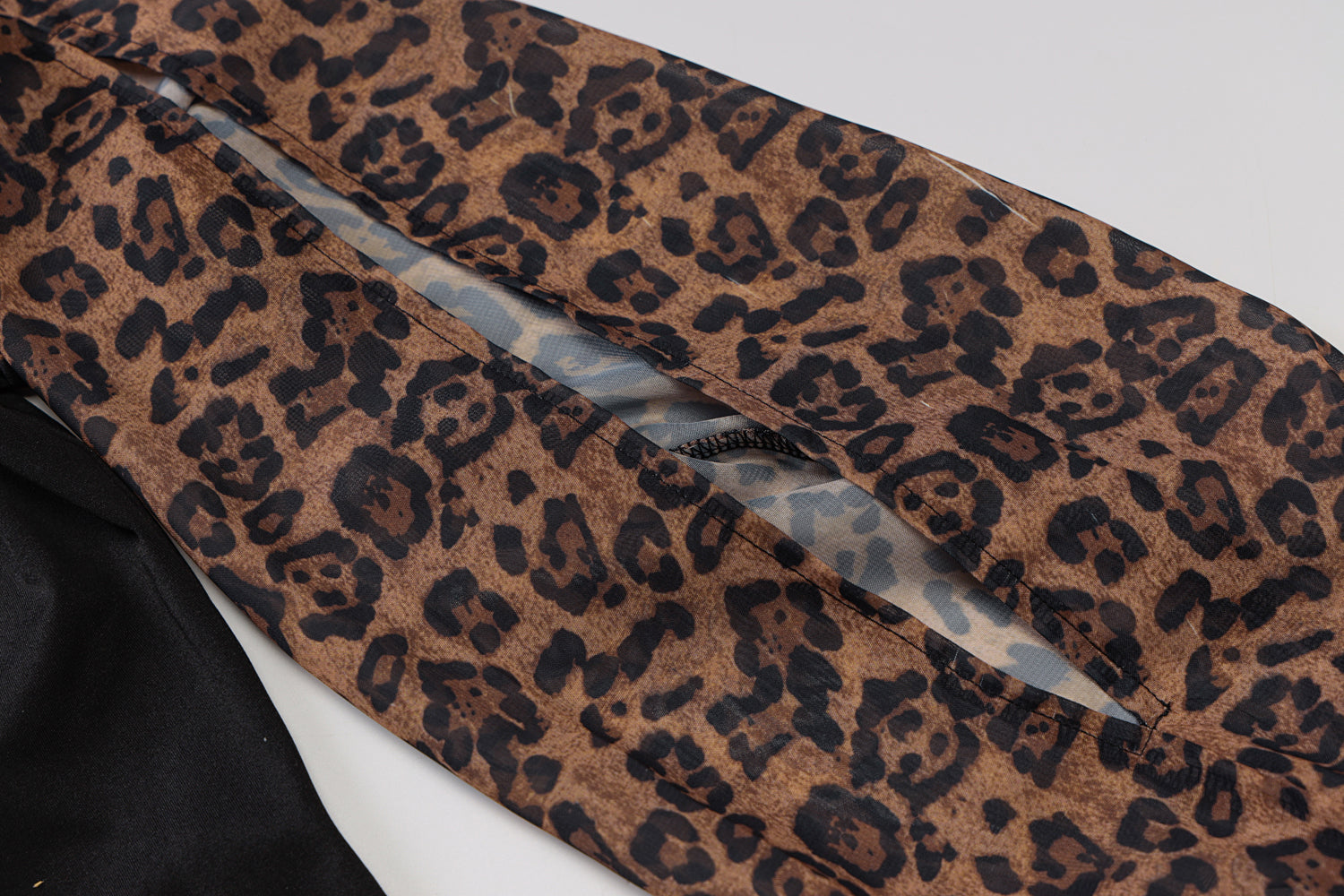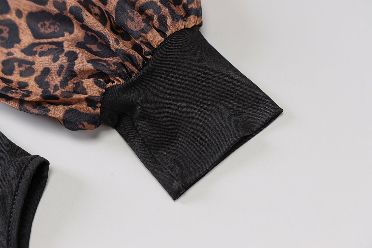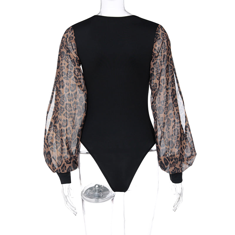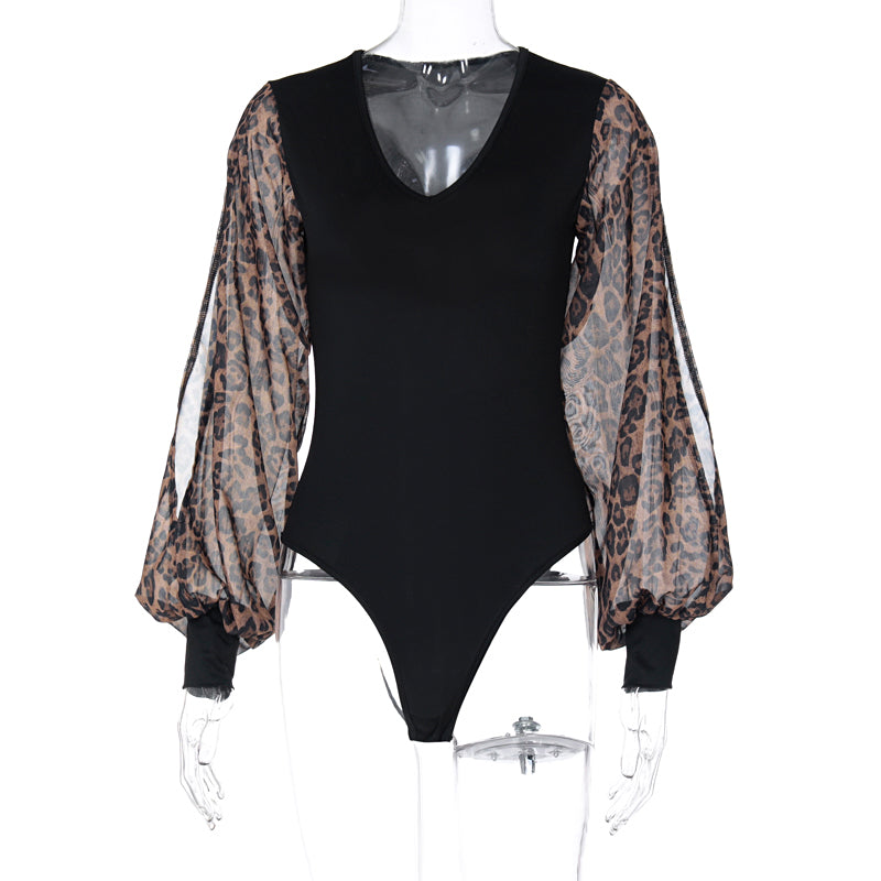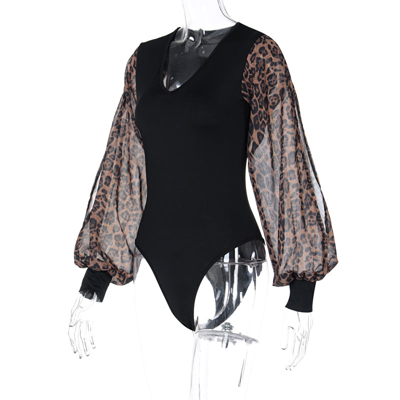 The bodysuit is made of a stretchy, body-hugging material that hugs the curves of the body. The solid black bodysuit is the perfect complement to leopard patterned lantern sleeves in a hollow-out style.