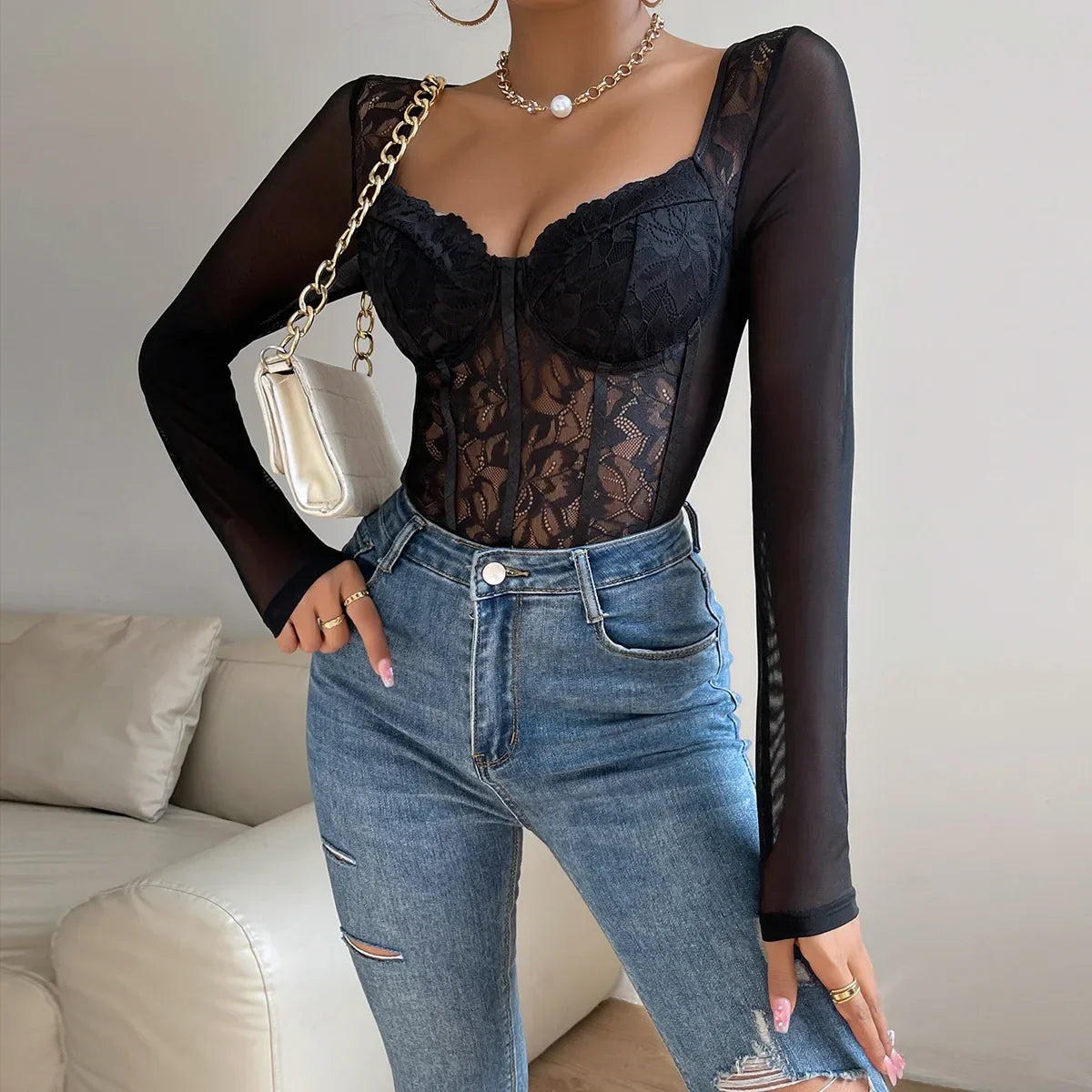 Enhance your curves with our Picture In Frames Bodysuit. The intricate lace decoration and solid pattern exude a sexy and club-like vibe. Made from a comfortable blend of polyester and spandex, this bodysuit features full sleeves for a chic look. Perfect for a night out on the town!