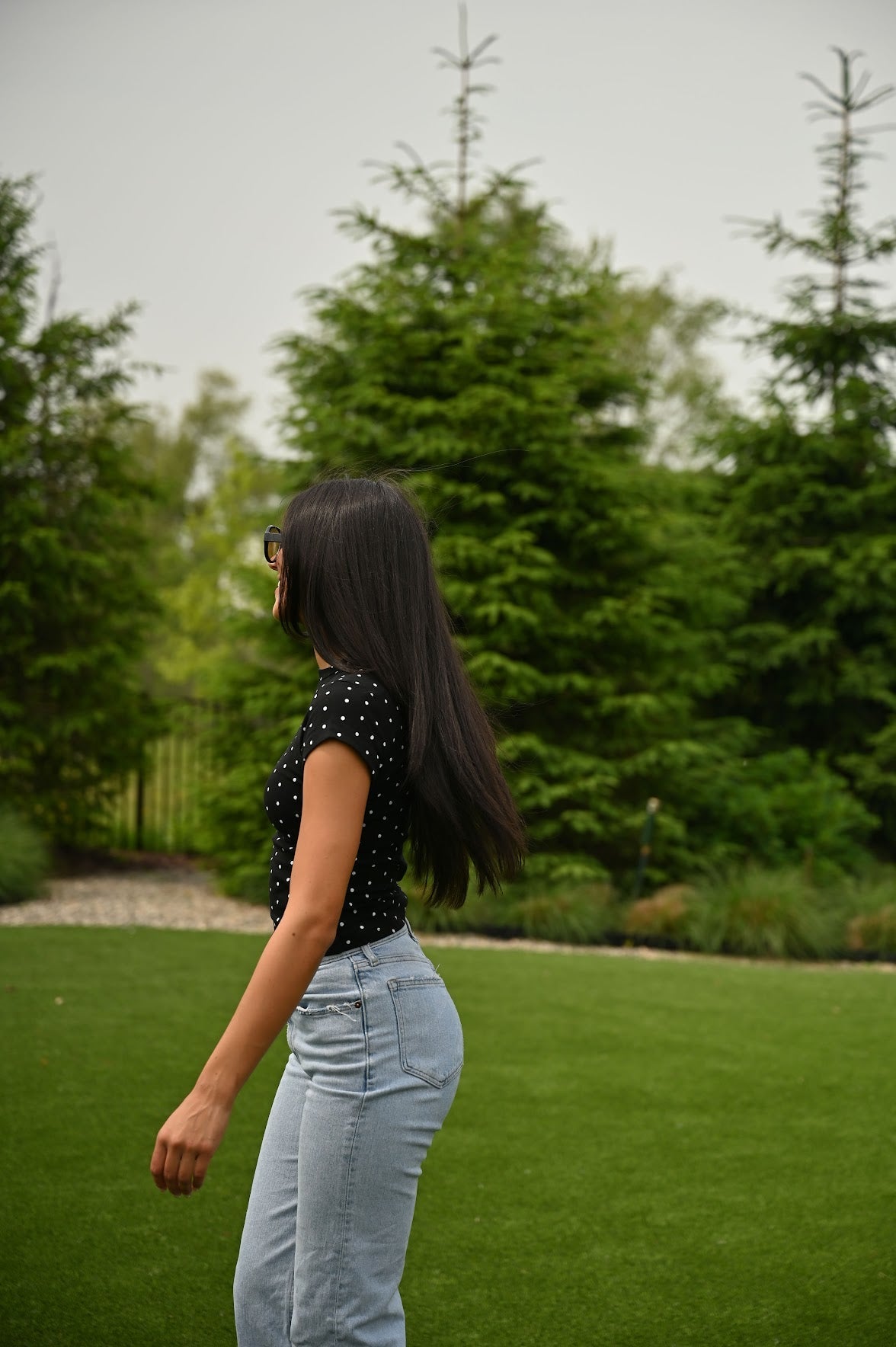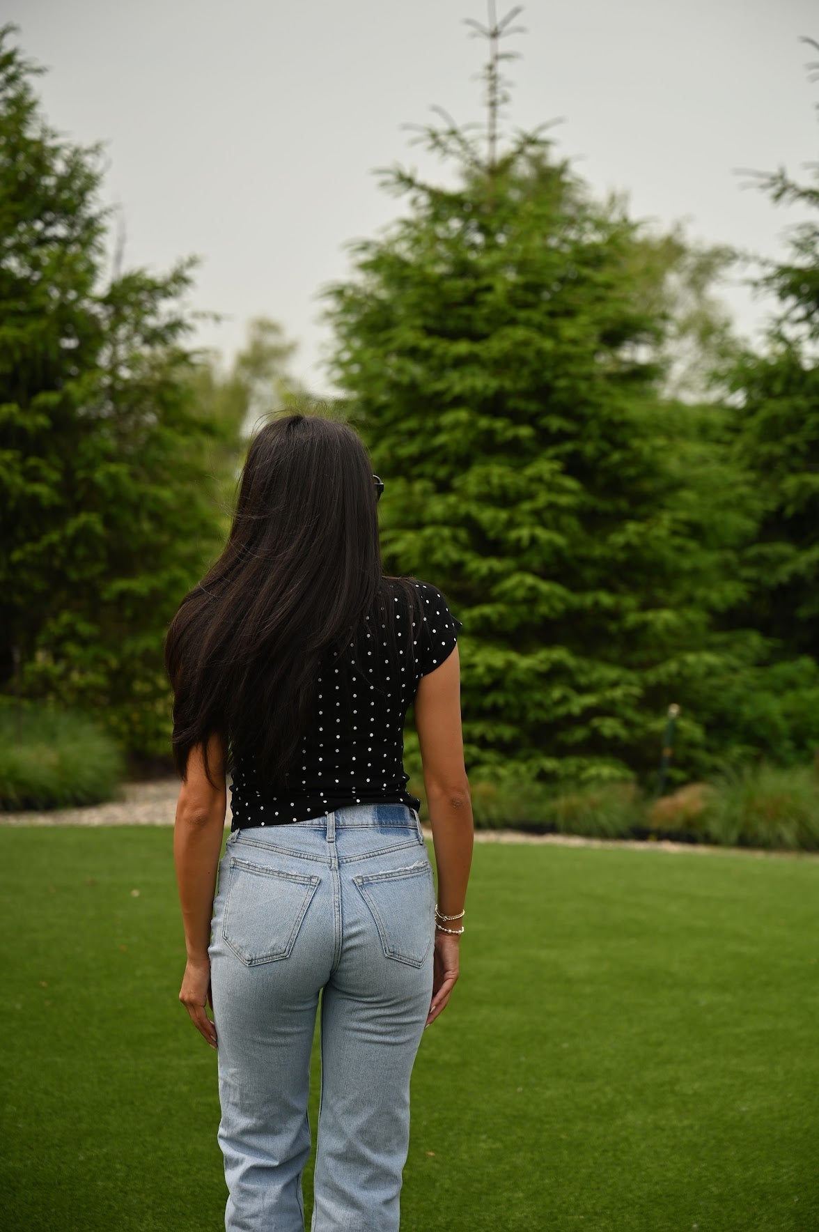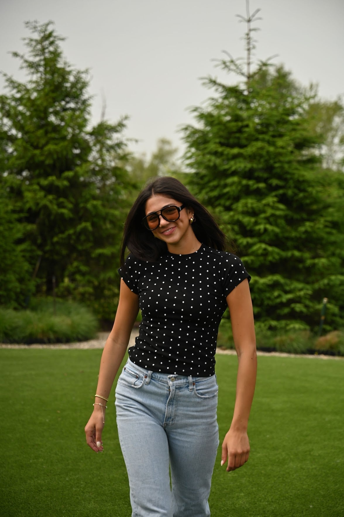 Get spotted in style with this black and white polka dot tee shirt. Perfect for adding a playful touch to any outfit, this tee will have you standing out from the crowd. Embrace the dots and show off your fun side!