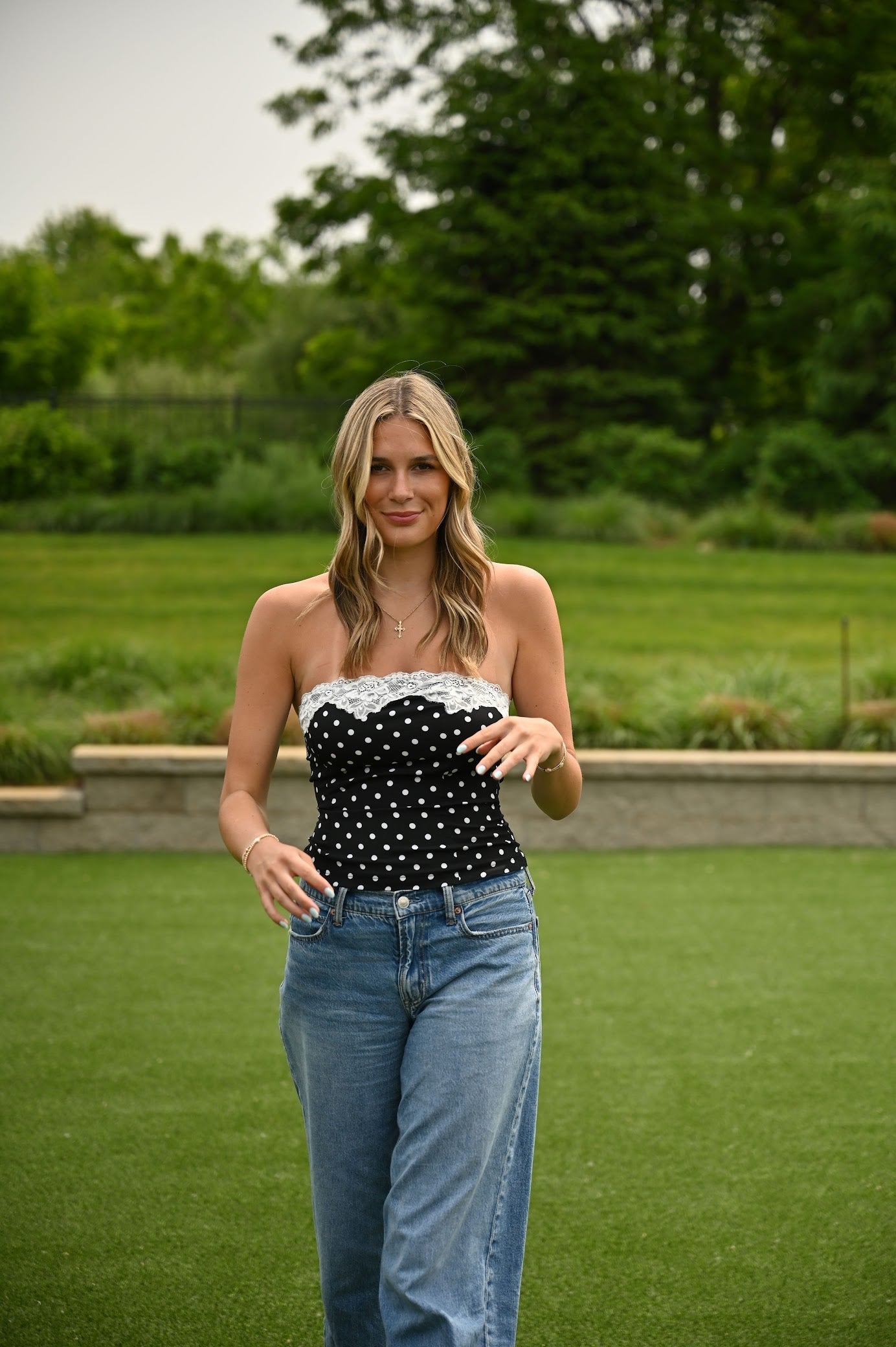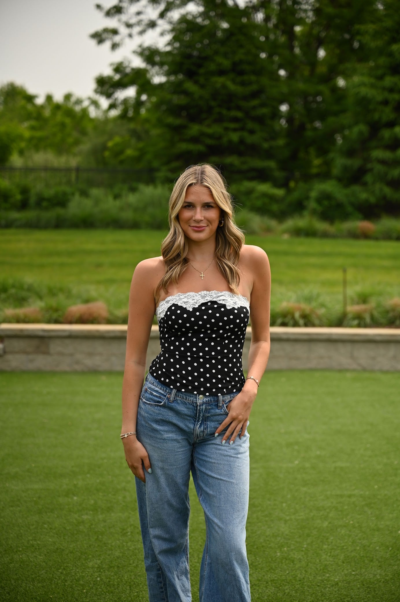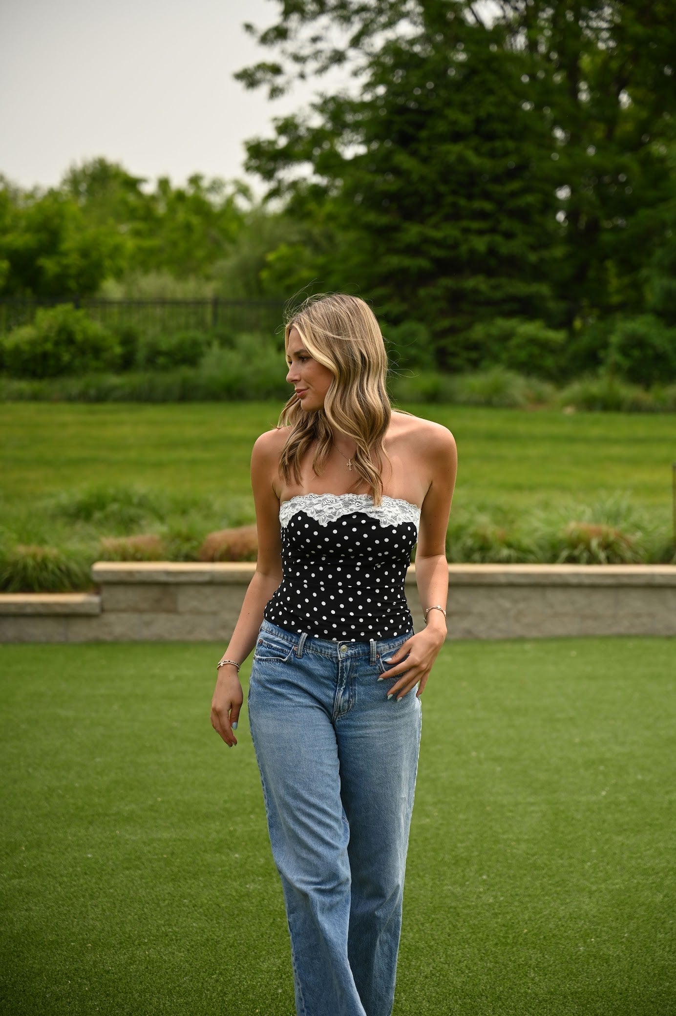 Embrace retro vibes with our Polka Dot Top! This women's lace trim tube top features a chic, strapless design with a slim fit and zip-up closure. Perfect for adding a playful touch to any outfit, the dots print and vintage-inspired details will have you looking and feeling like a stylish lady. (Groovy, right?)