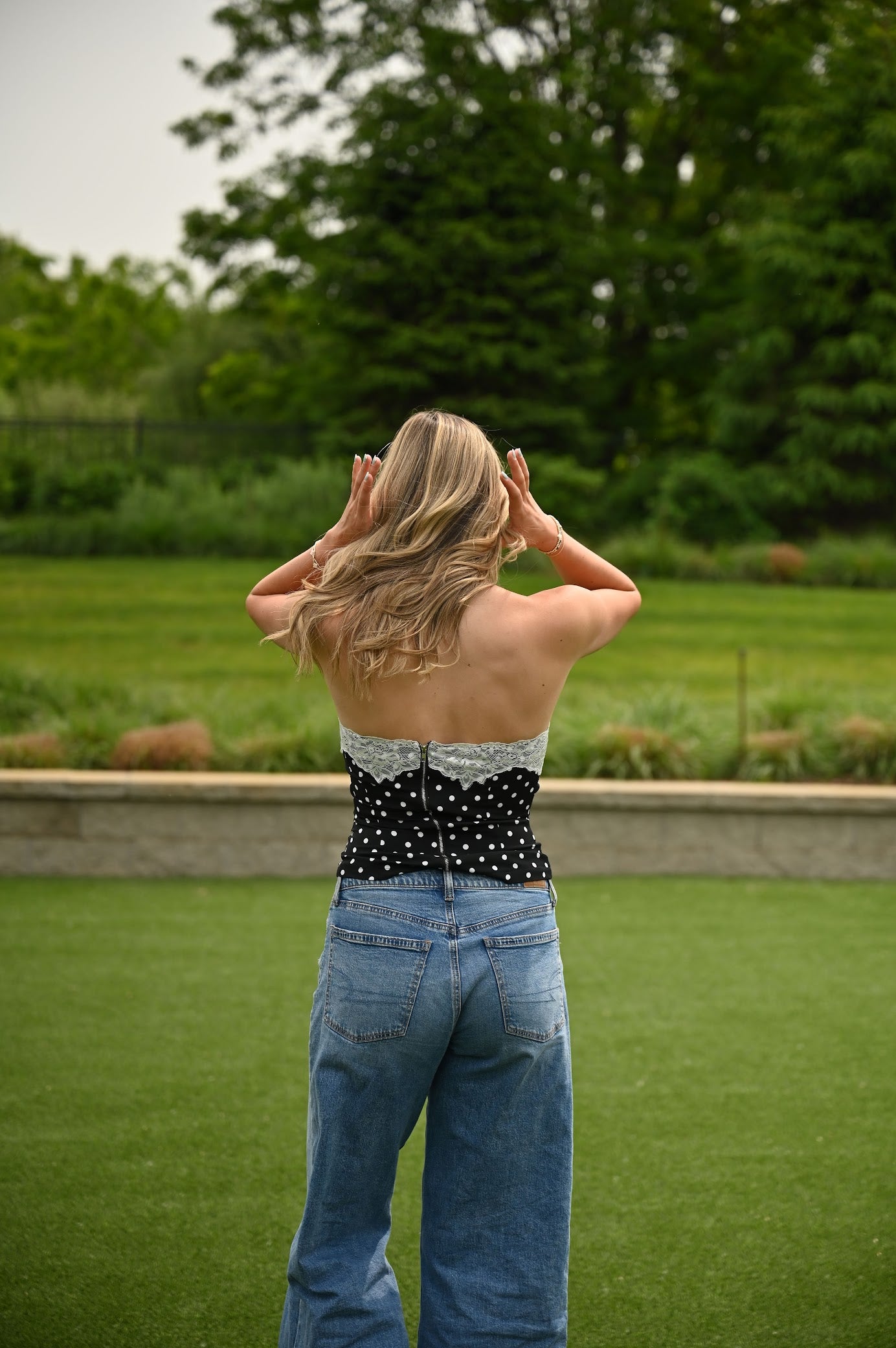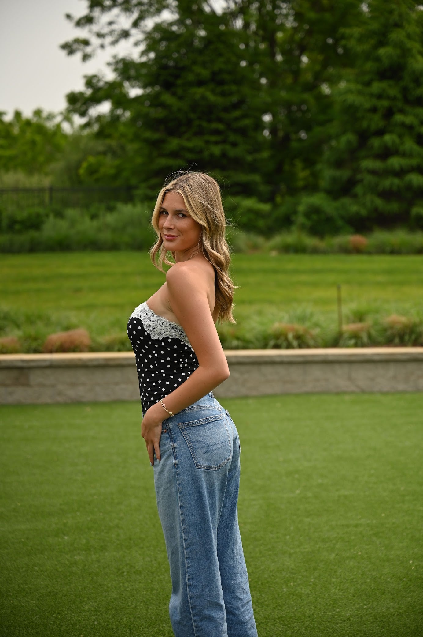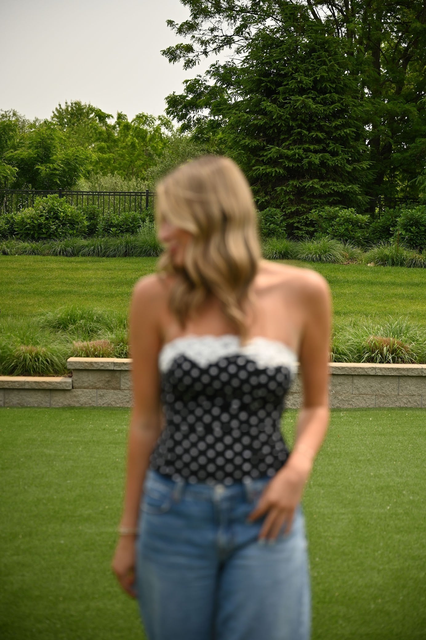 Embrace retro vibes with our Polka Dot Top! This women's lace trim tube top features a chic, strapless design with a slim fit and zip-up closure. Perfect for adding a playful touch to any outfit, the dots print and vintage-inspired details will have you looking and feeling like a stylish lady. (Groovy, right?)