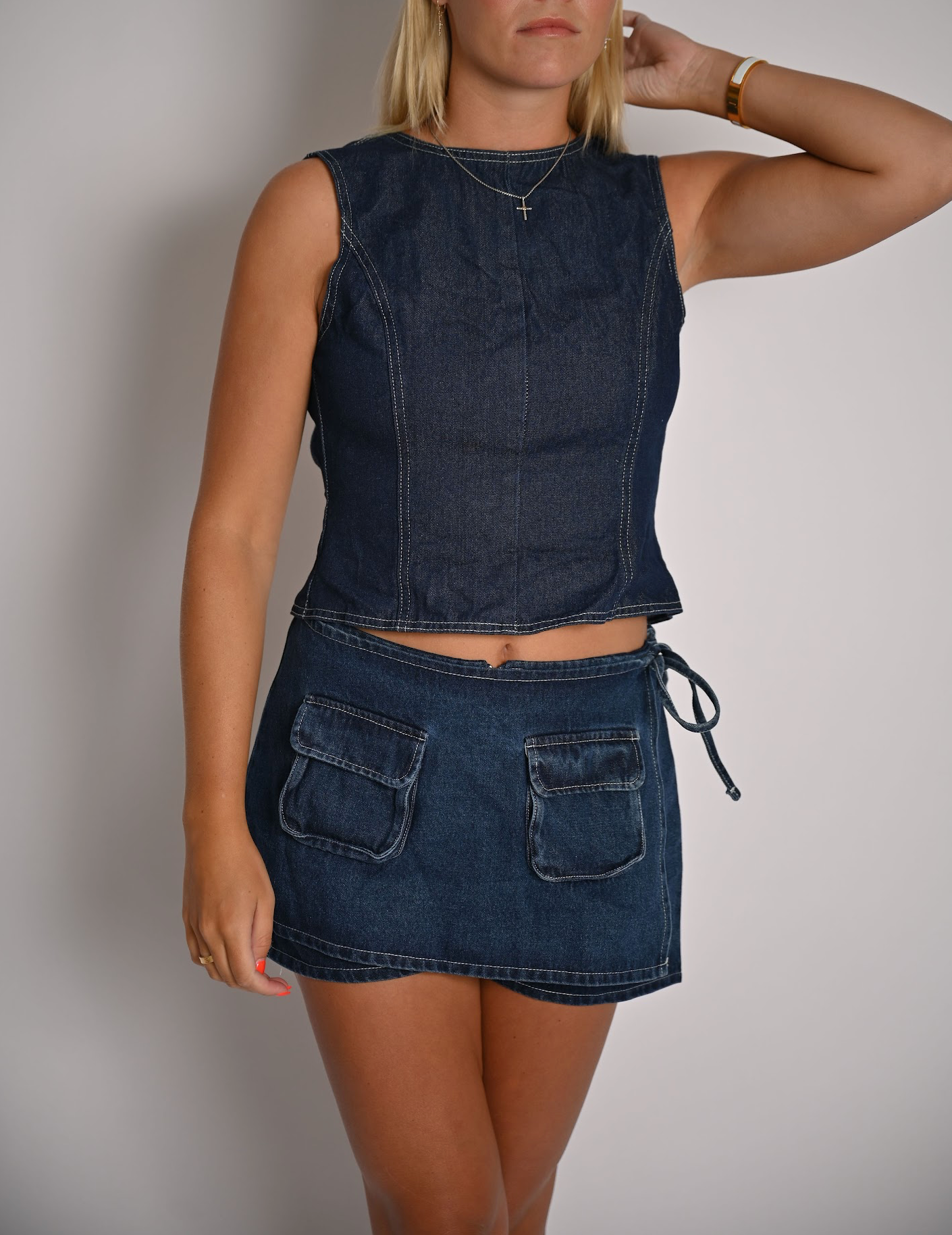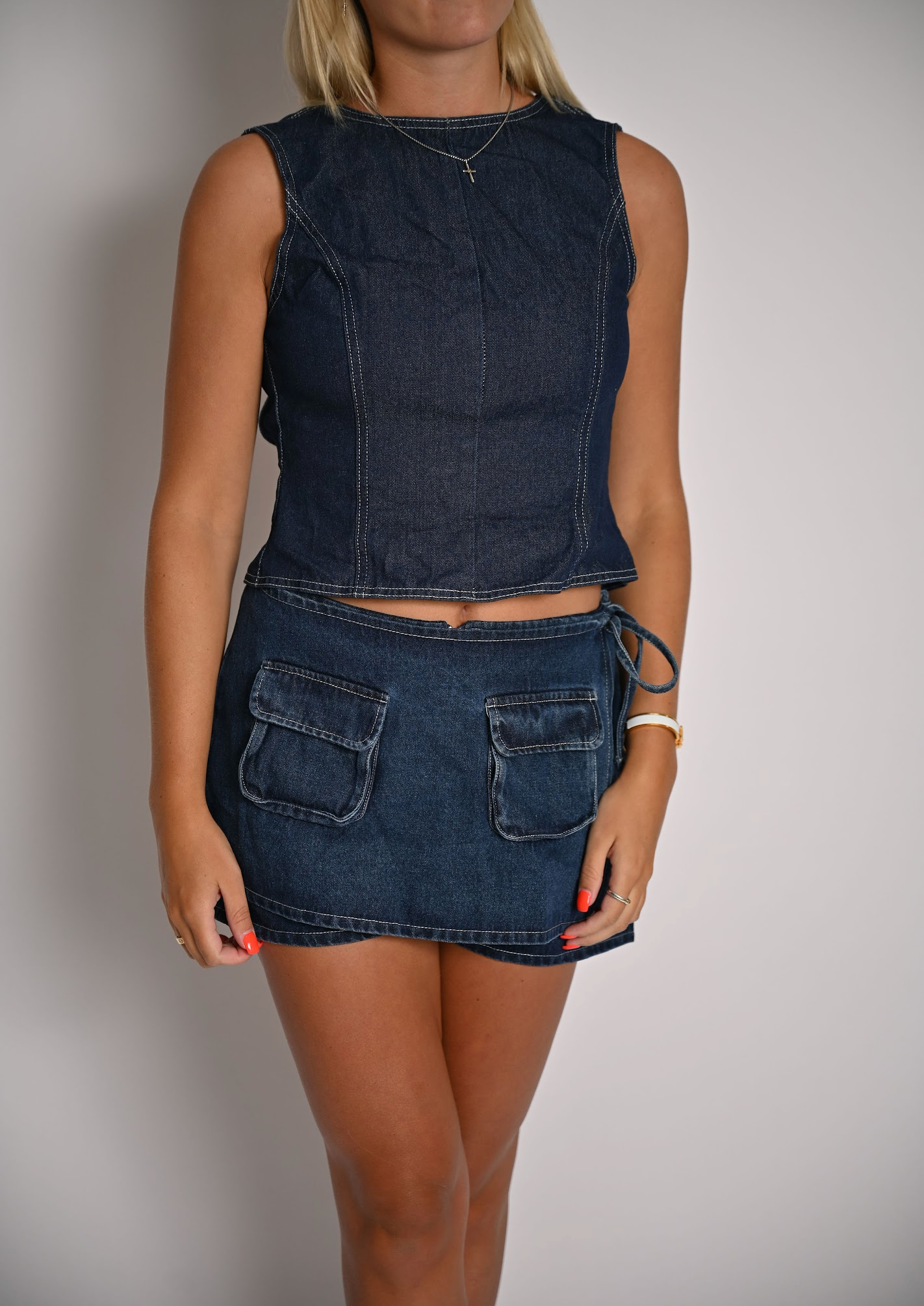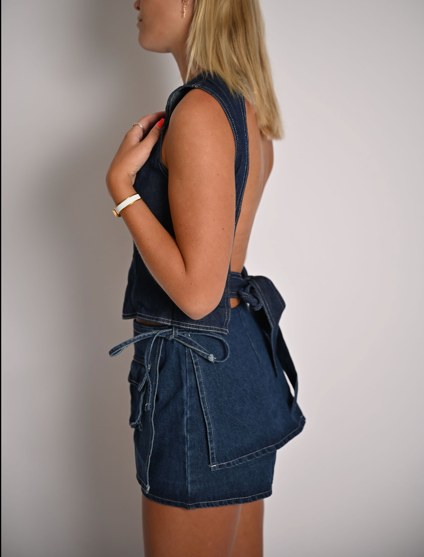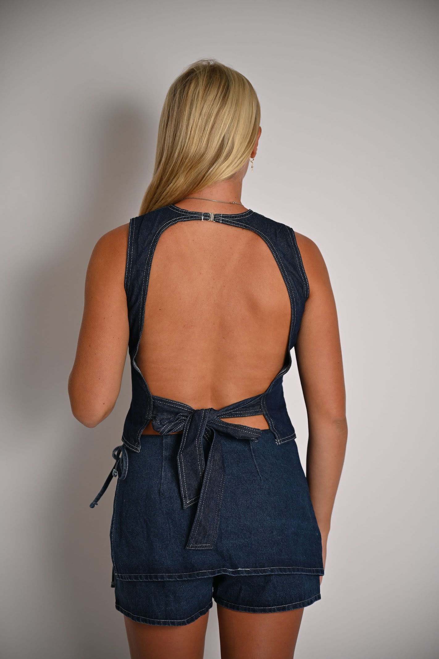 Get ready to turn heads with our Quick Two Piece! This matching set features a mini jean skirt and a crop top with a playful open back design. Perfect for a night out, this set is sure to make you feel confident and stylish. So go ahead and show off your playful side!