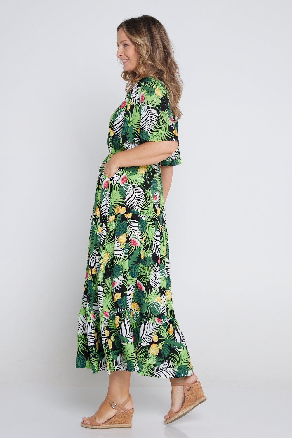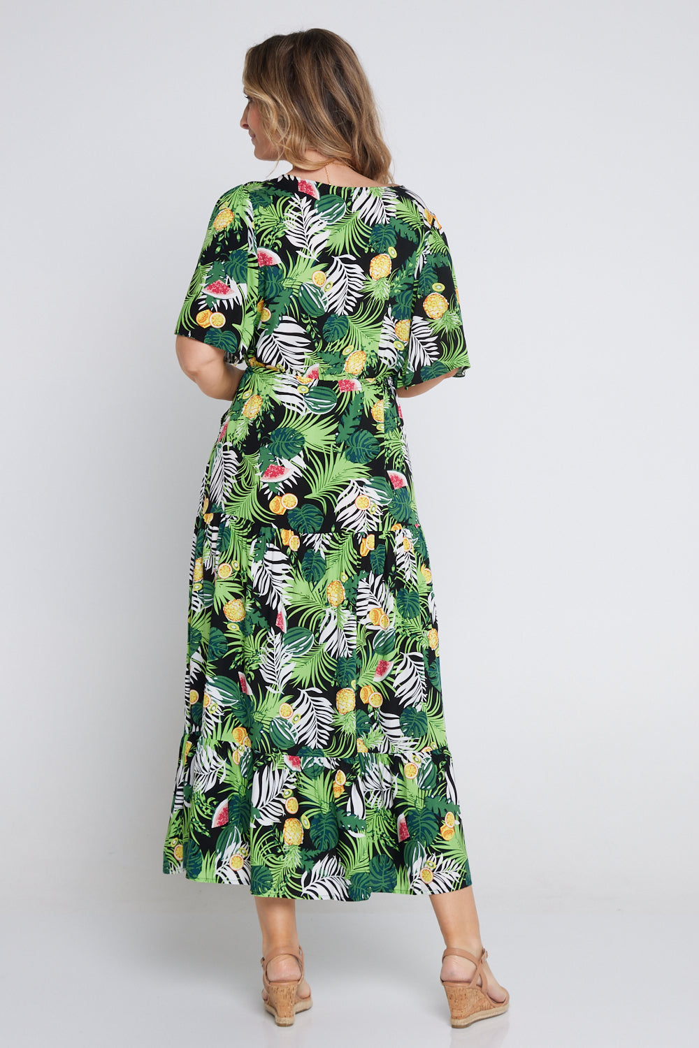 This new pattern is the epitome of summer, featuring lush tropical foliage and fruit, with bright pineapples, citrus and watermelon scattered amongst the leaves. Seeing this dress instantly transports us to a holiday by the beach.