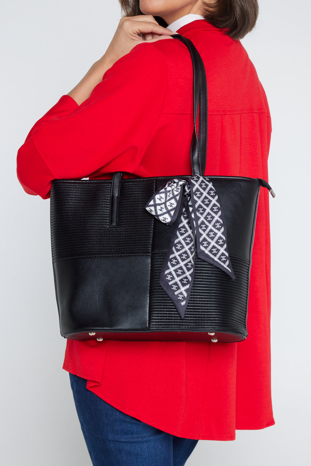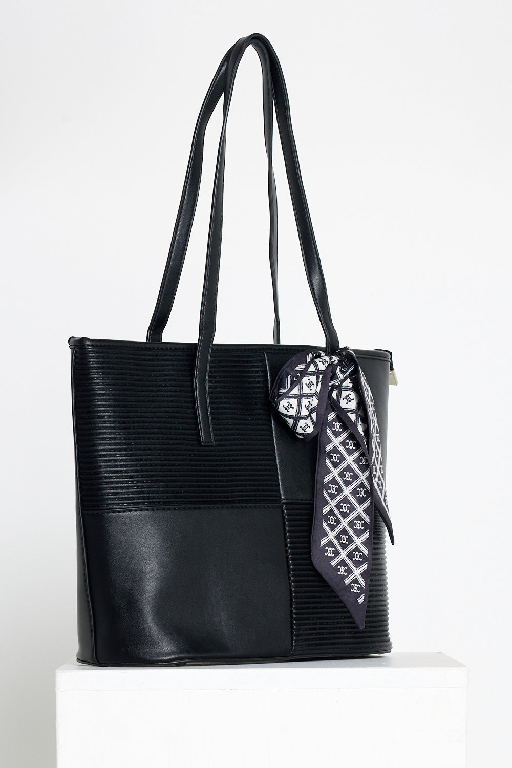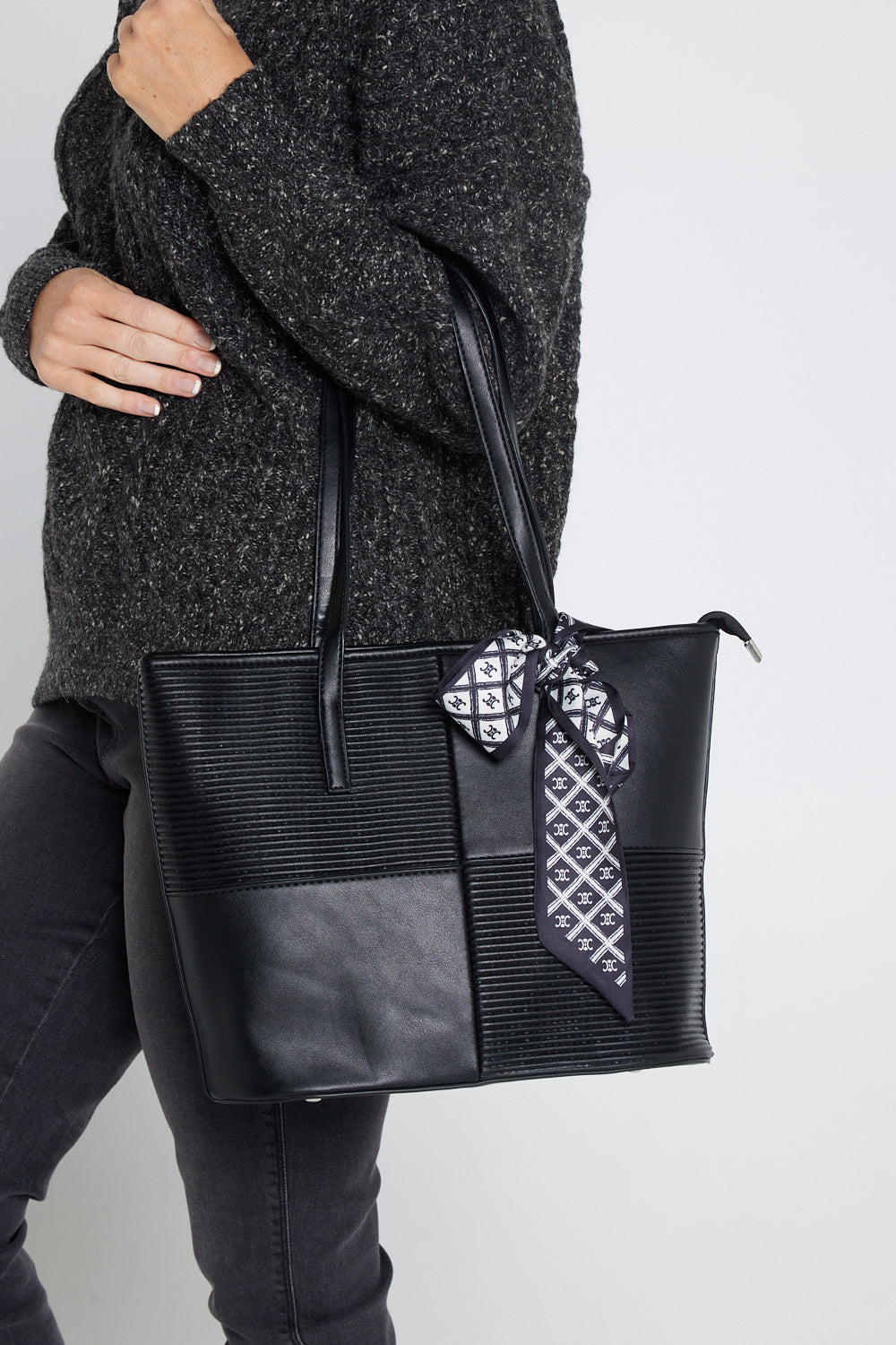 Introducing the Reese Handbag in Black, a sleek and sophisticated accessory designed to elevate your everyday style. This handbag features a modern quilted pattern with a mix of smooth and textured panels, creating a striking visual contrast. The elegant black exterior is complemented by a chic scarf detail, adding a touch of flair to this versatile piece.