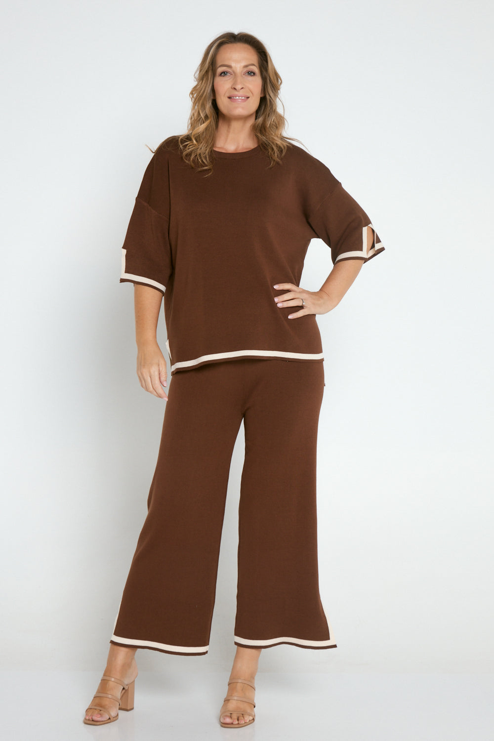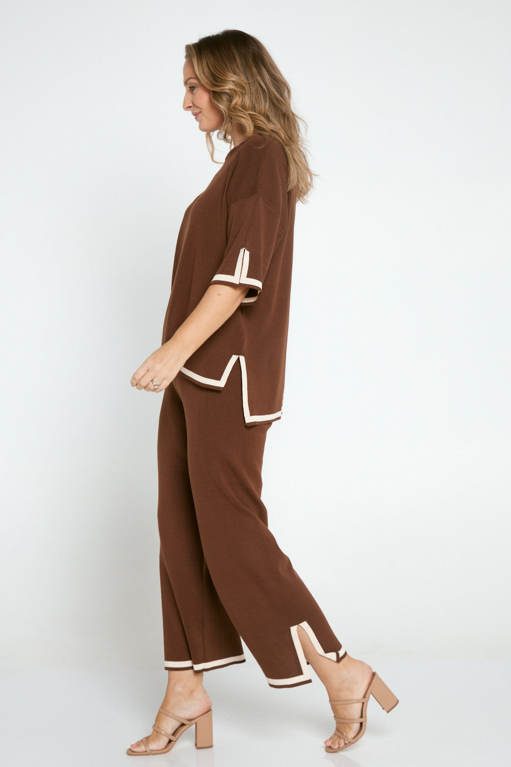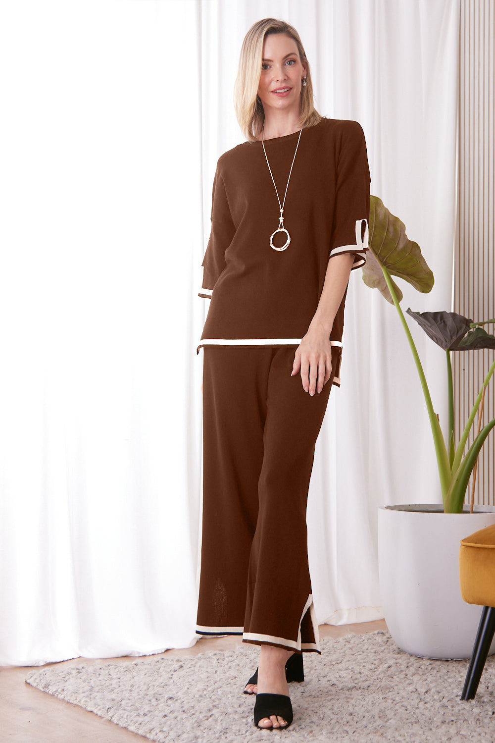 Elevate your wardrobe with our Regina Knit Top and Pant Set in chocolate brown and cream. The lightweight knit offers a relaxed fit and side splits for a modern touch. The top features a ribbed boat neck and drop shoulders, while the pants boast an elasticated waistband and wide legs. Perfect for any occasion, this set is so comfortable, yet exudes elegance and sophistication.
